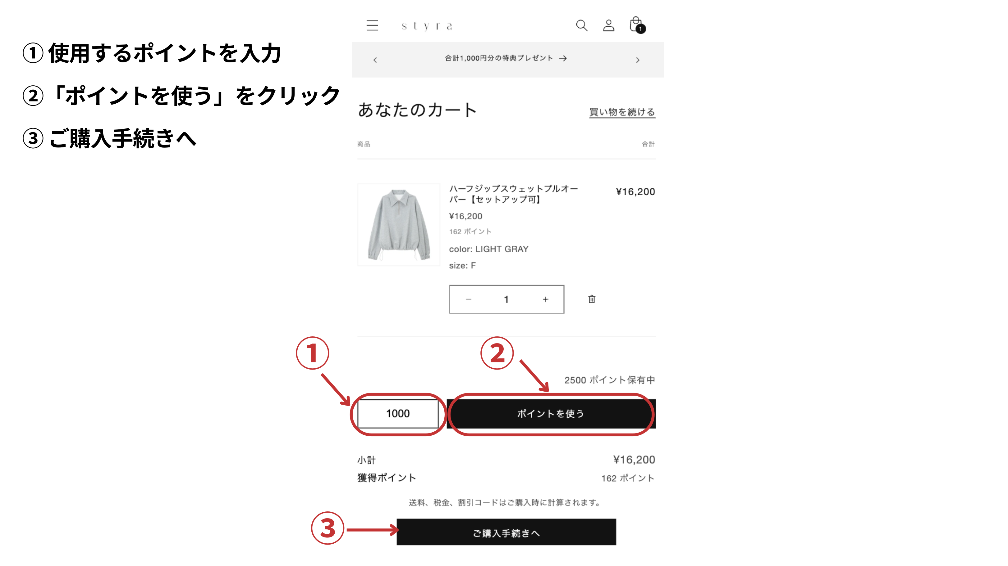 ログイン後、カートにて使用するポイントを入力し「ポイントを使う」ボタンにて使用可能です。