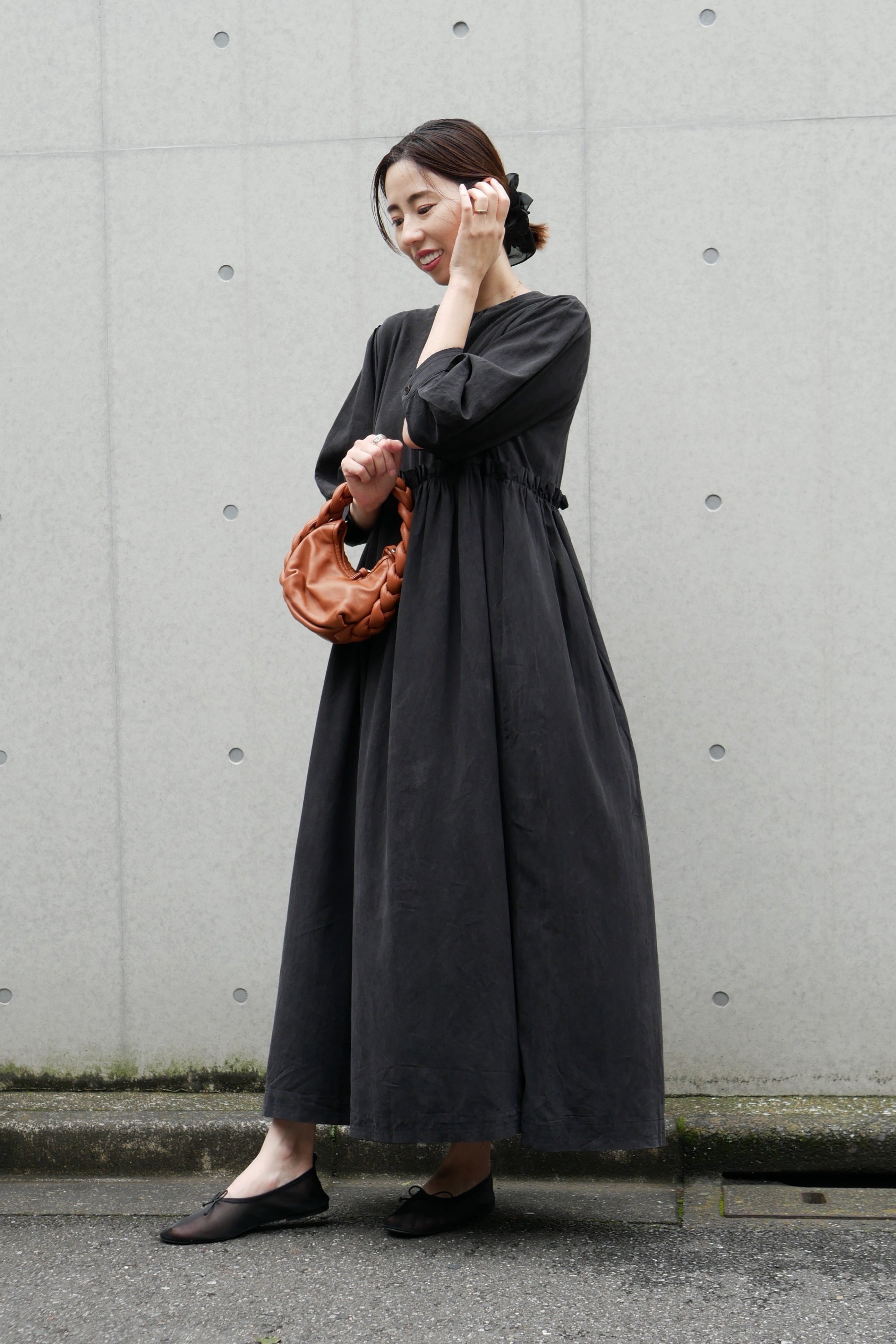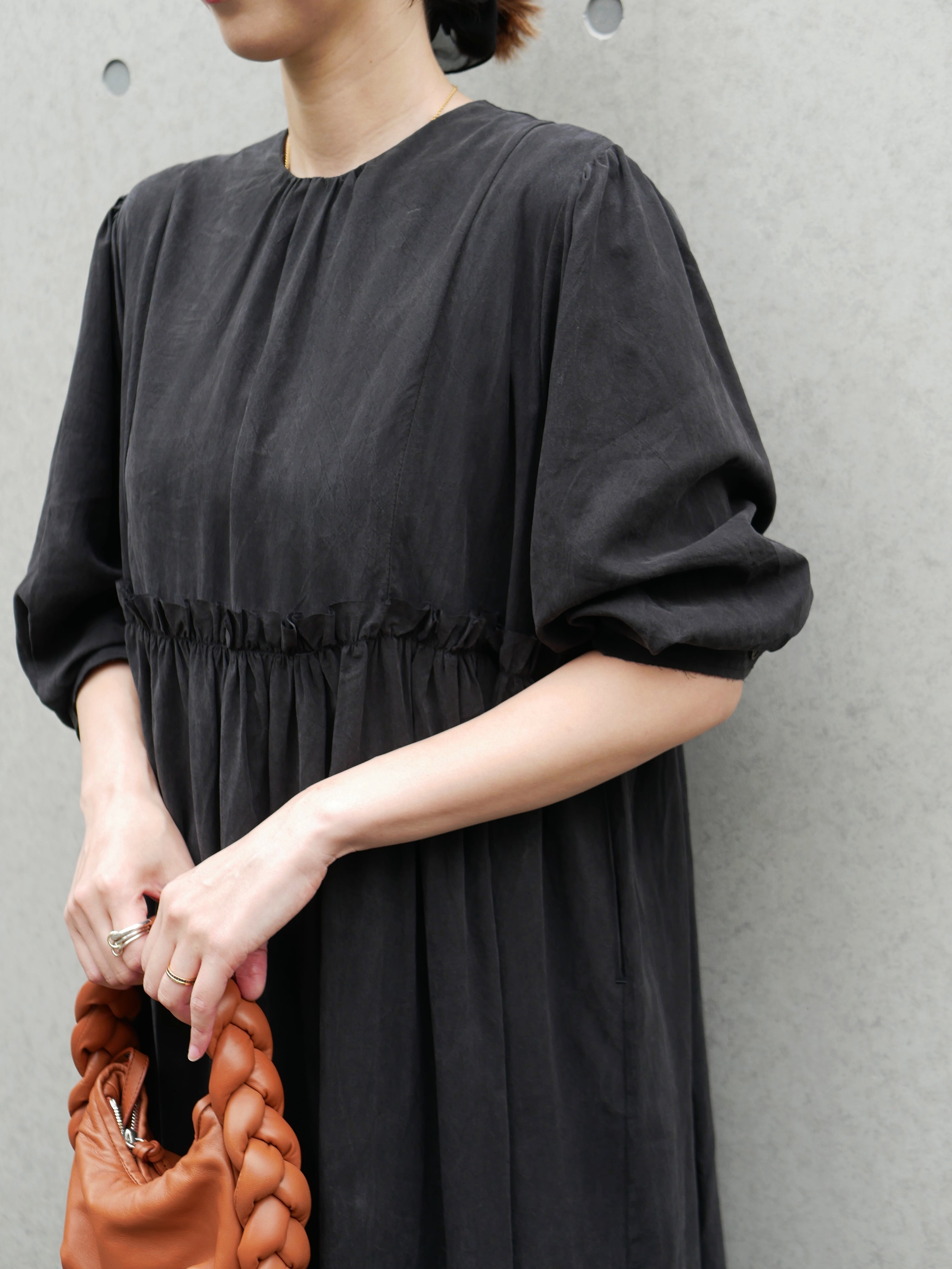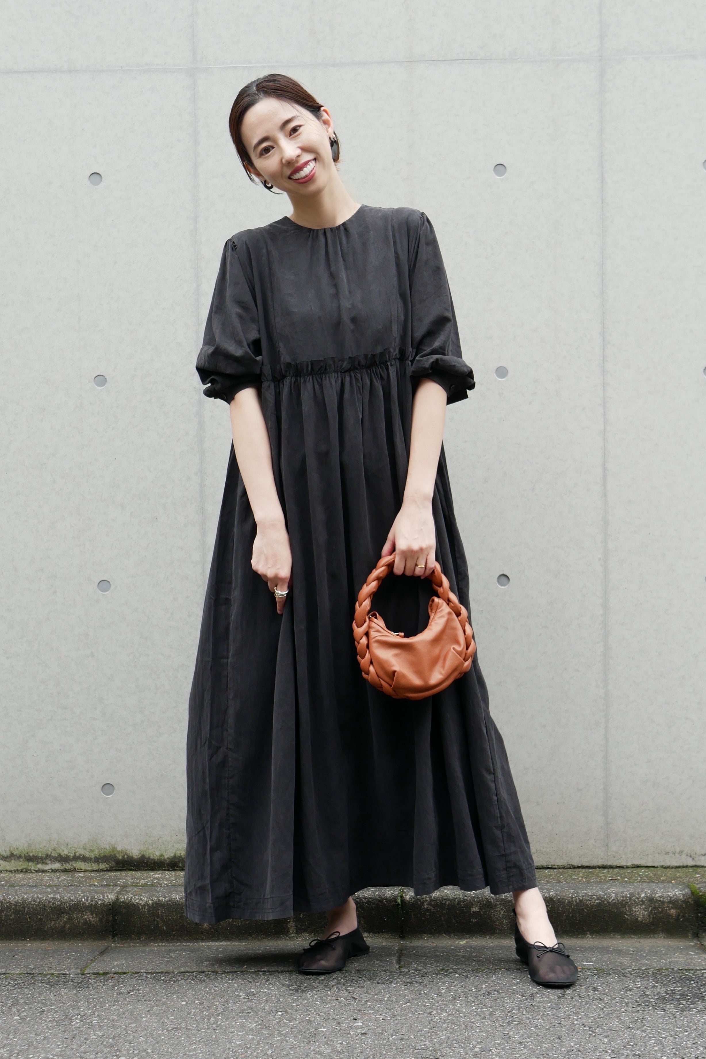 ブラックのギャザーボリュームワンピースは、たっぷりとしたボリューム感が動くたびにドラマティックな印象を与えます。