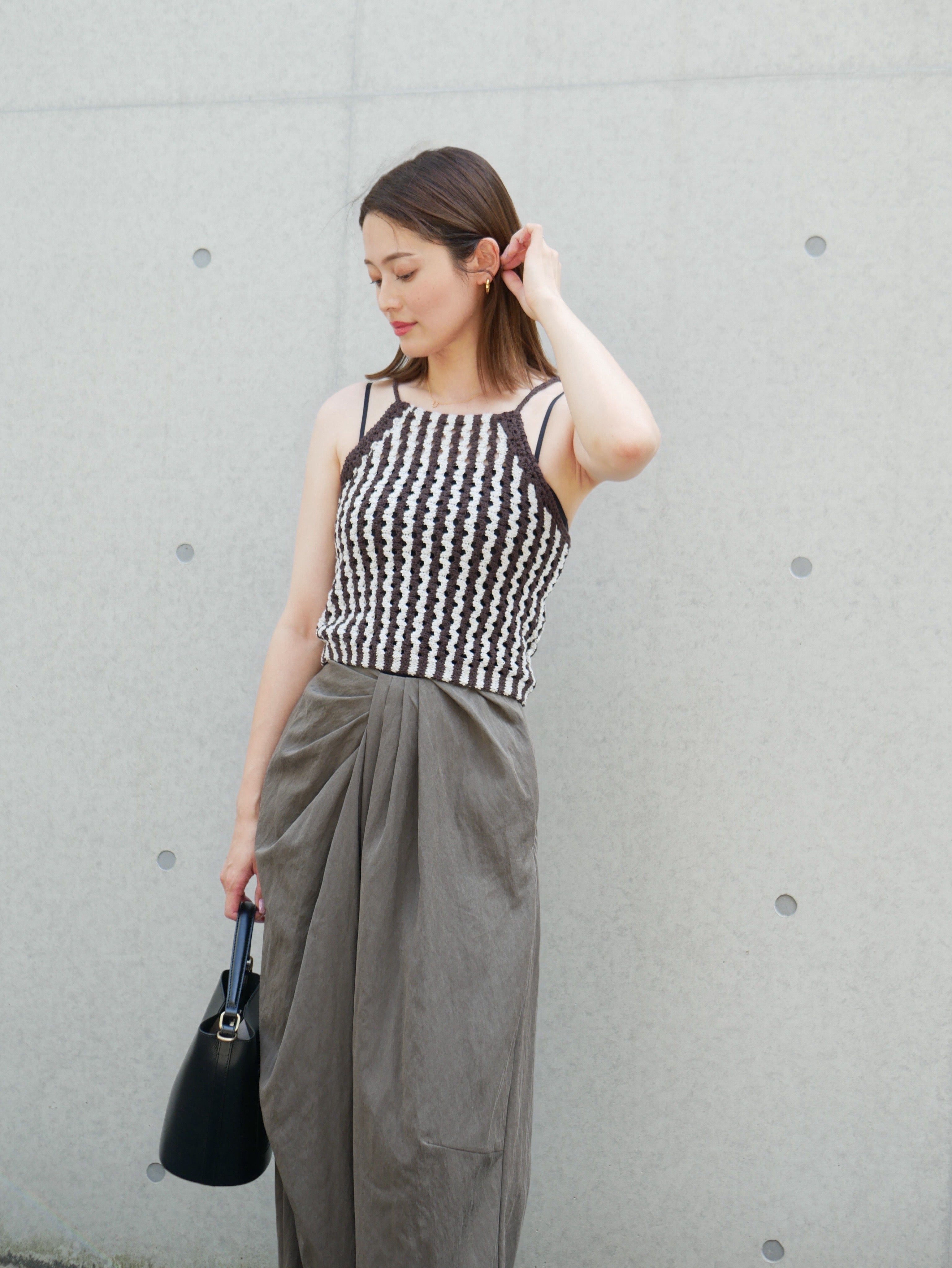 ブラウンとライトブルーのストライプが爽やかなサマーニットキャミソールは、軽やかな透け感と程よいフィット感で、旅先の暑さも心地よく乗り切れます。