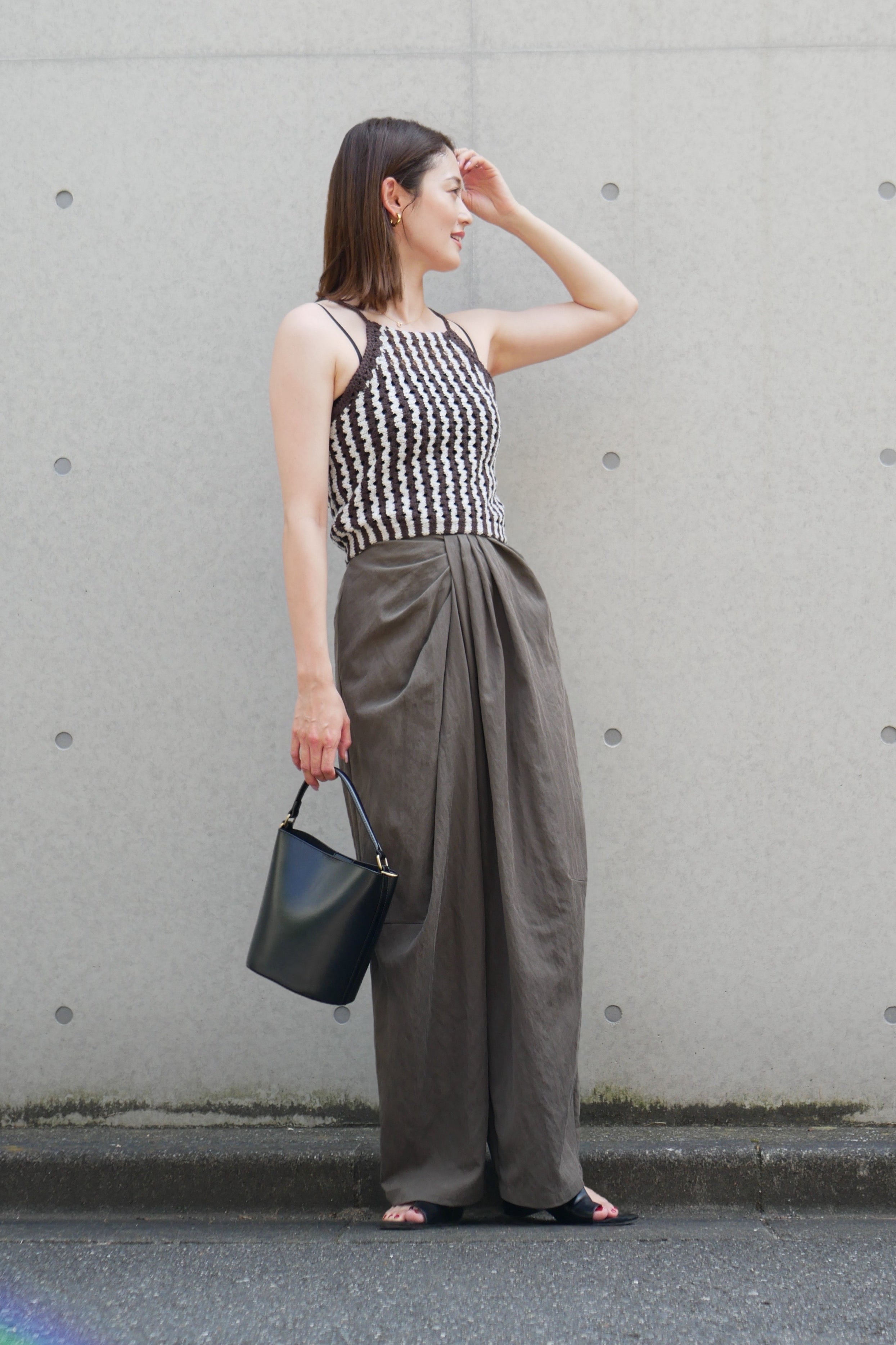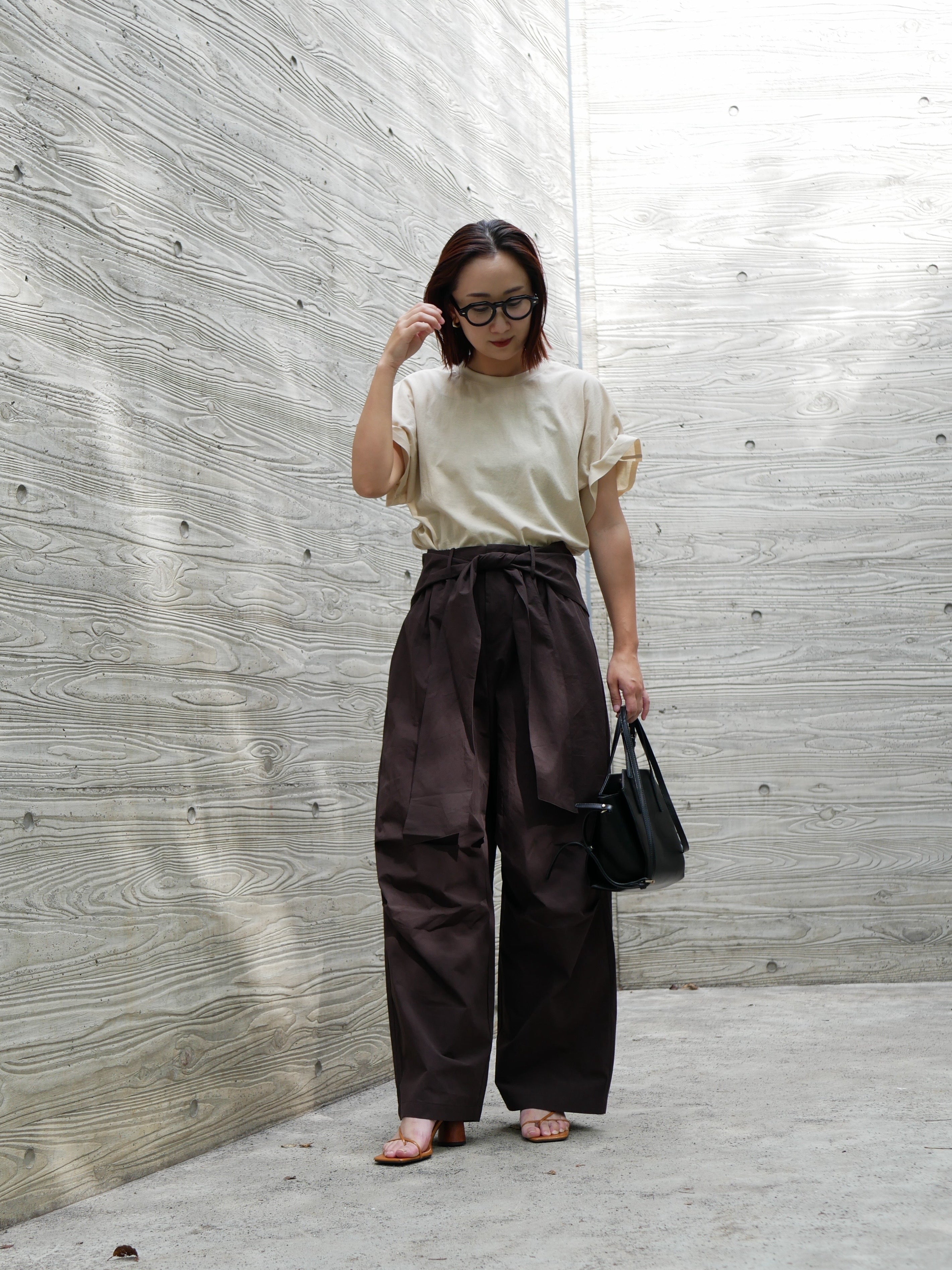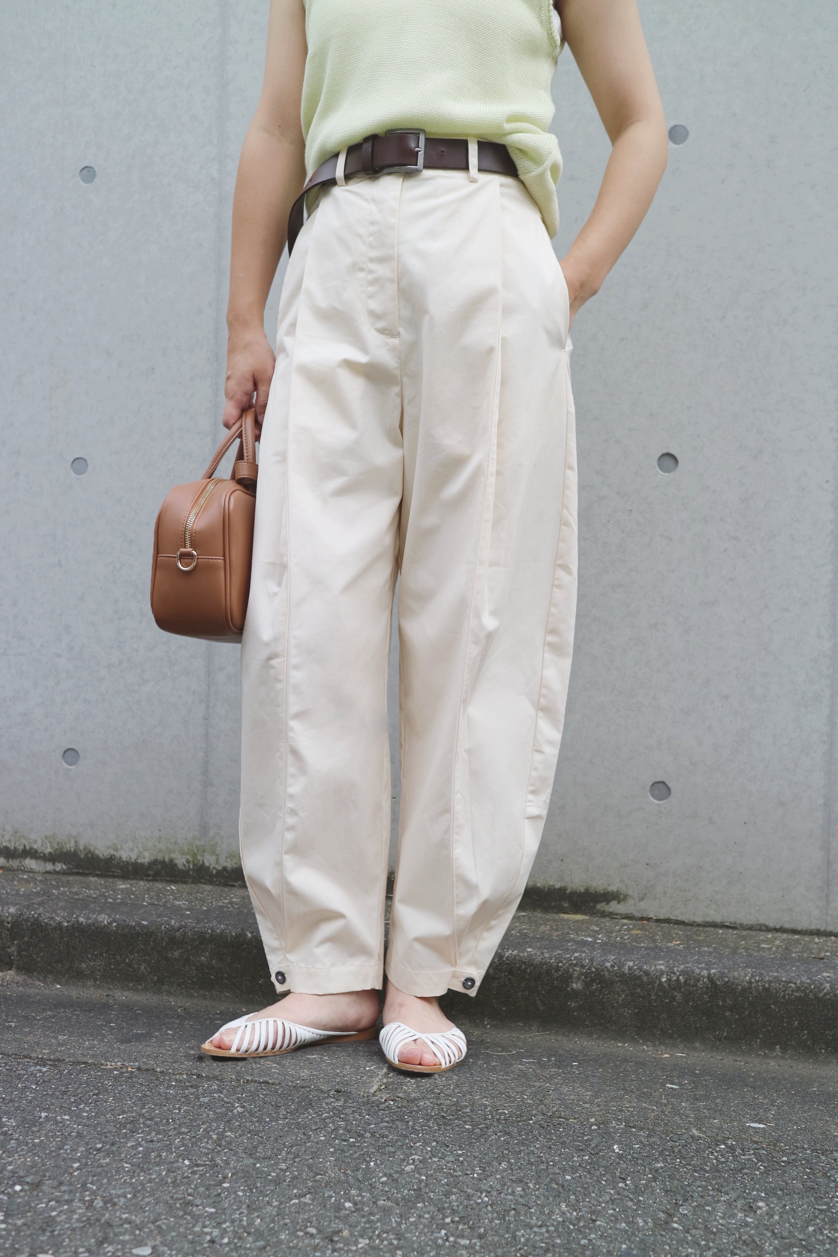 タックワイドパンツは程よいゆとりと構築的なシルエットが、動きやすさと上品さを両立。