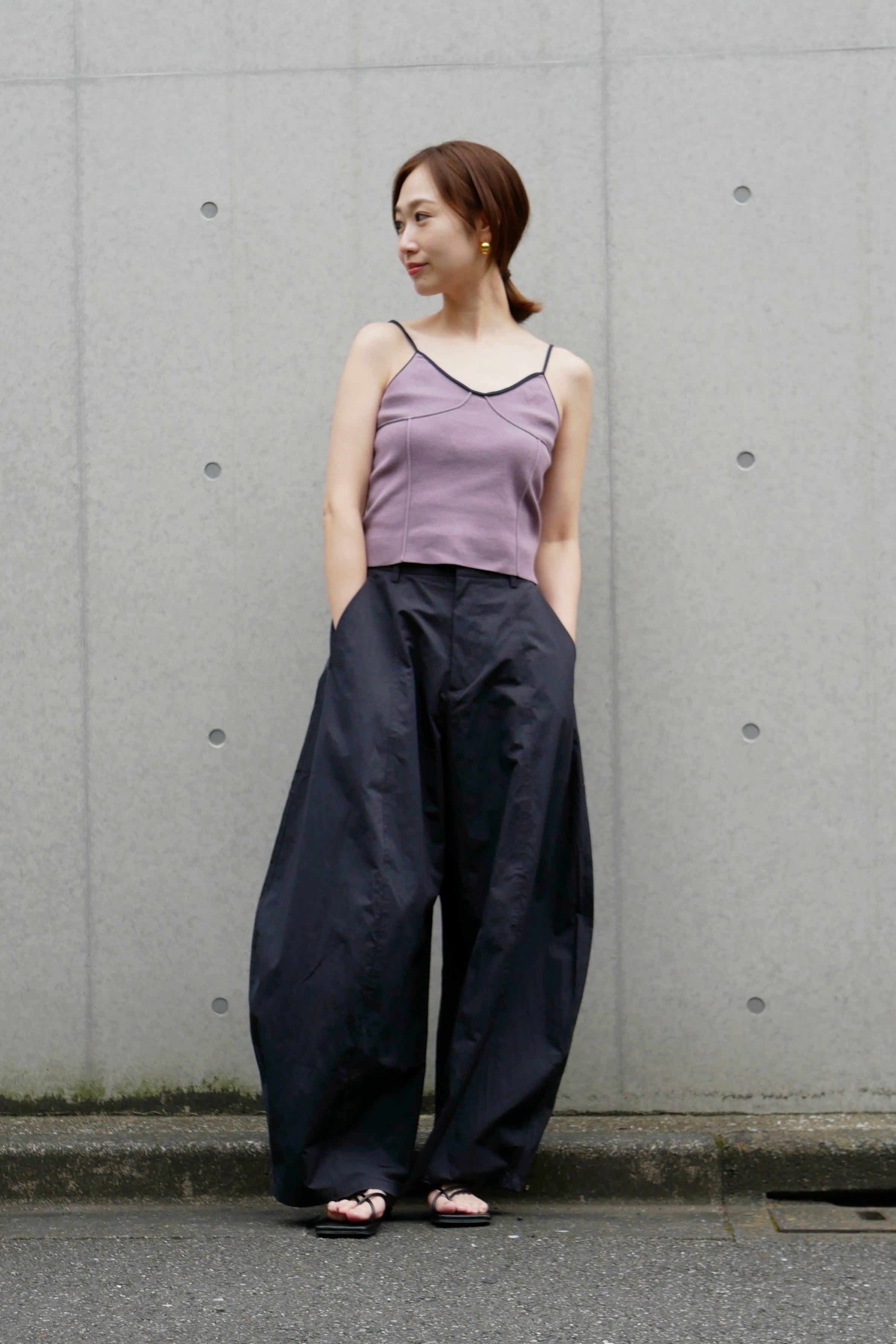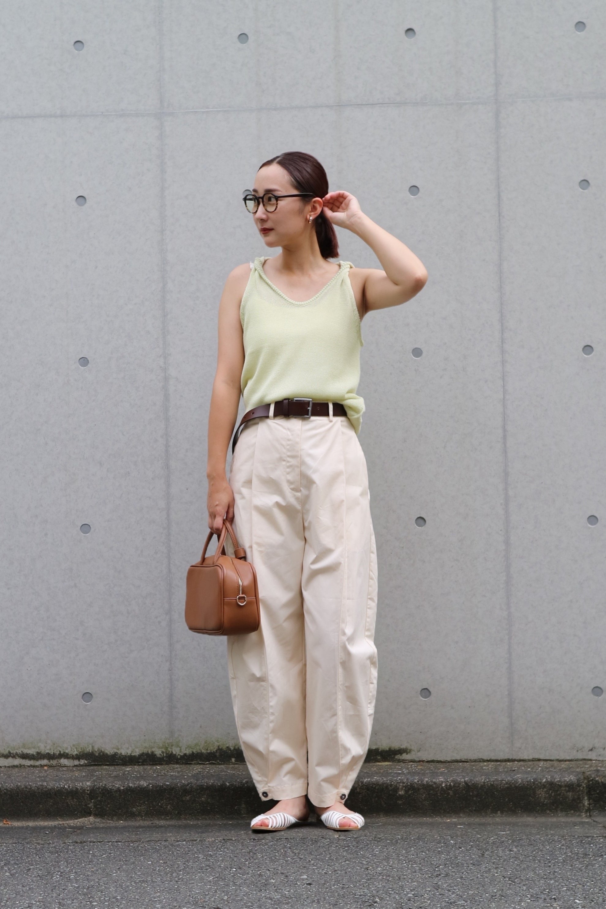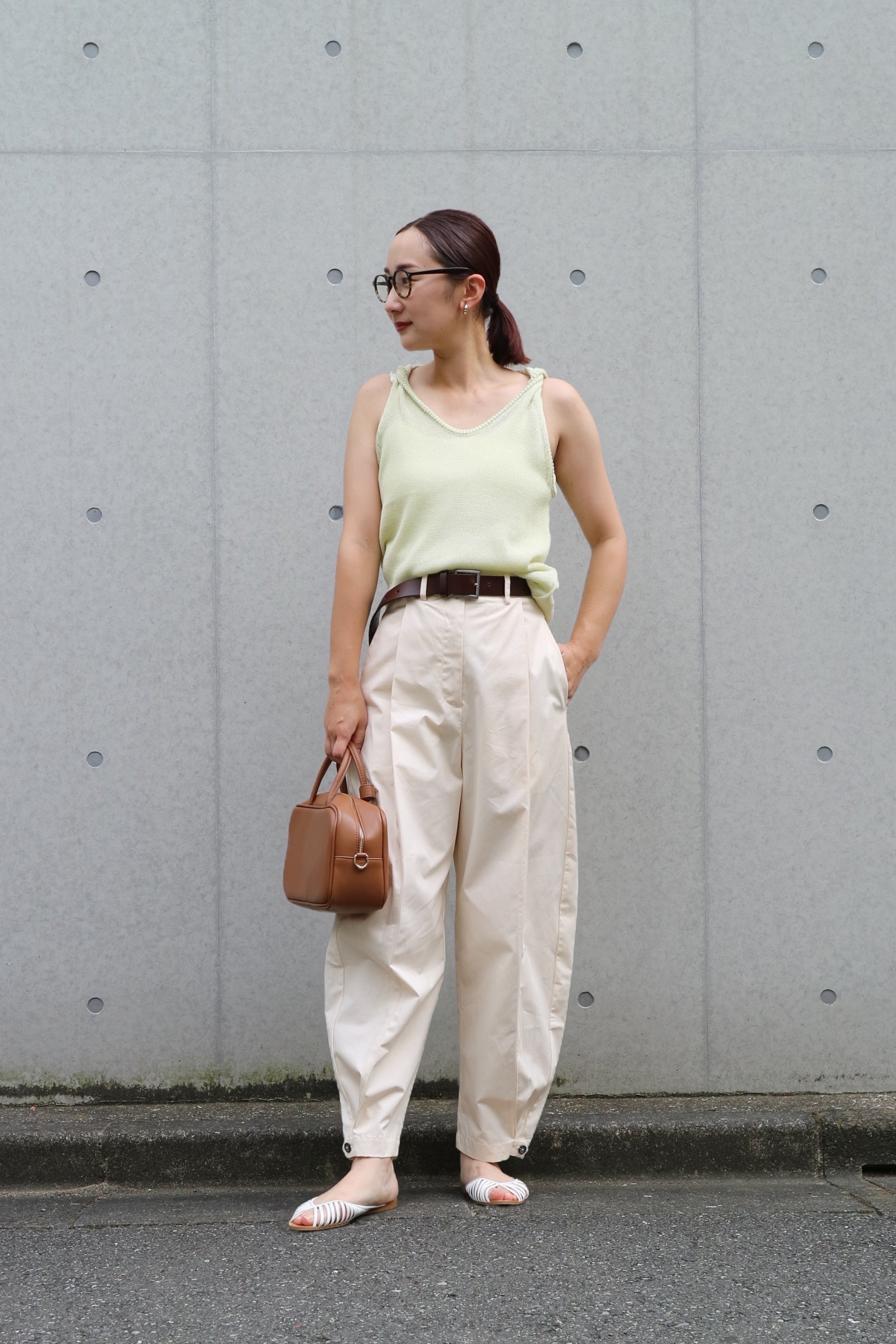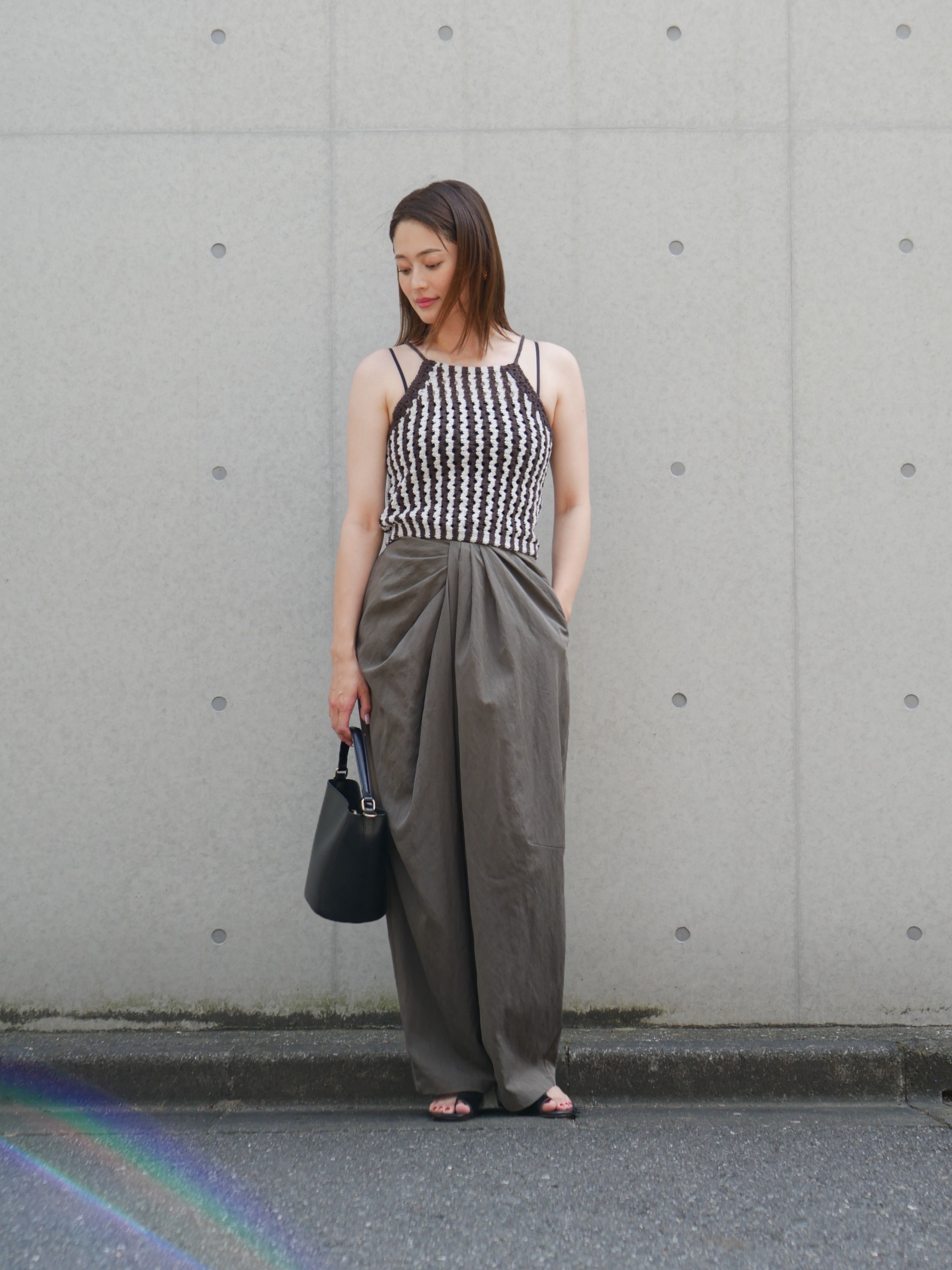 タックワイドパンツは程よいゆとりと構築的なシルエットが、動きやすさと上品さを両立。