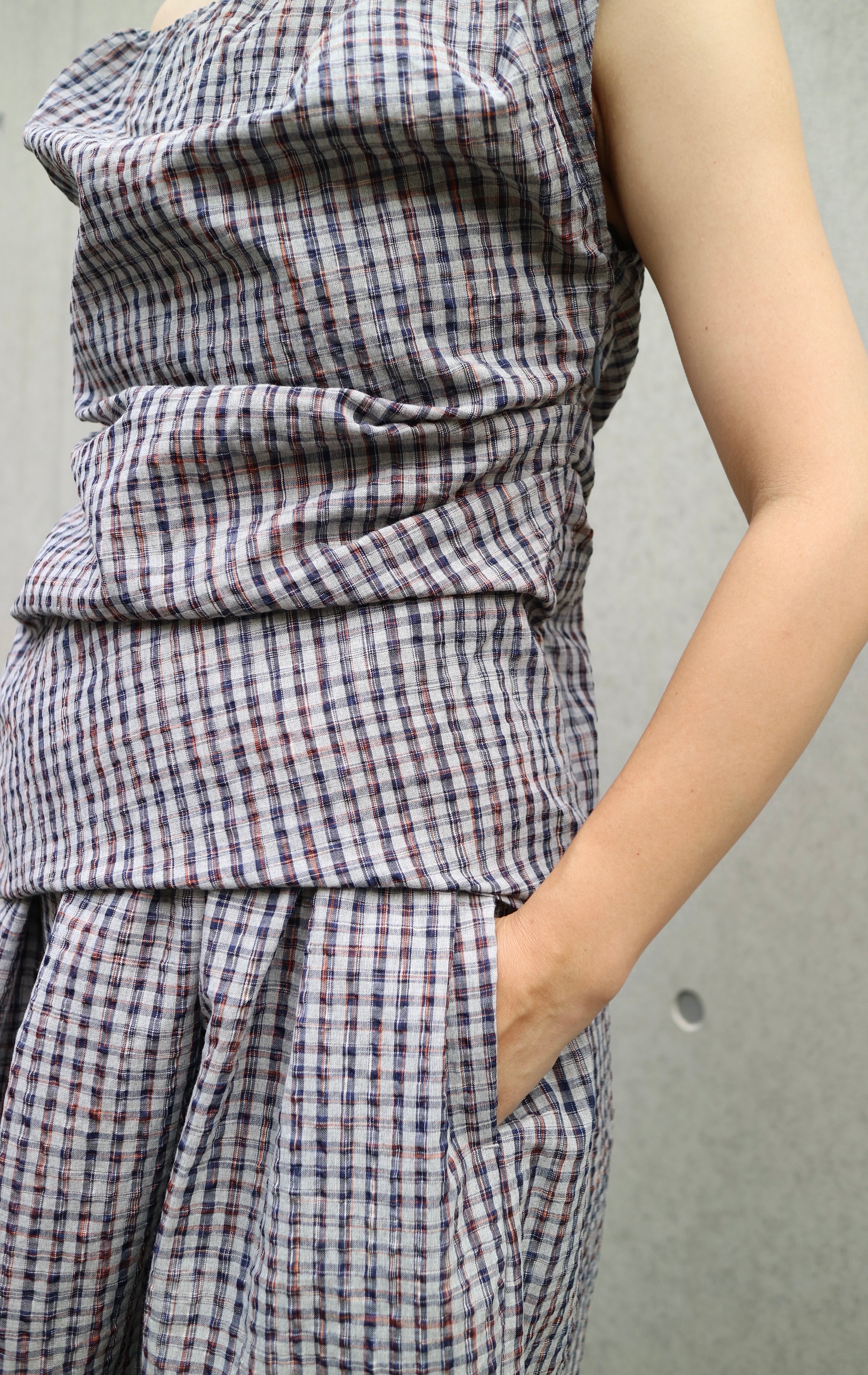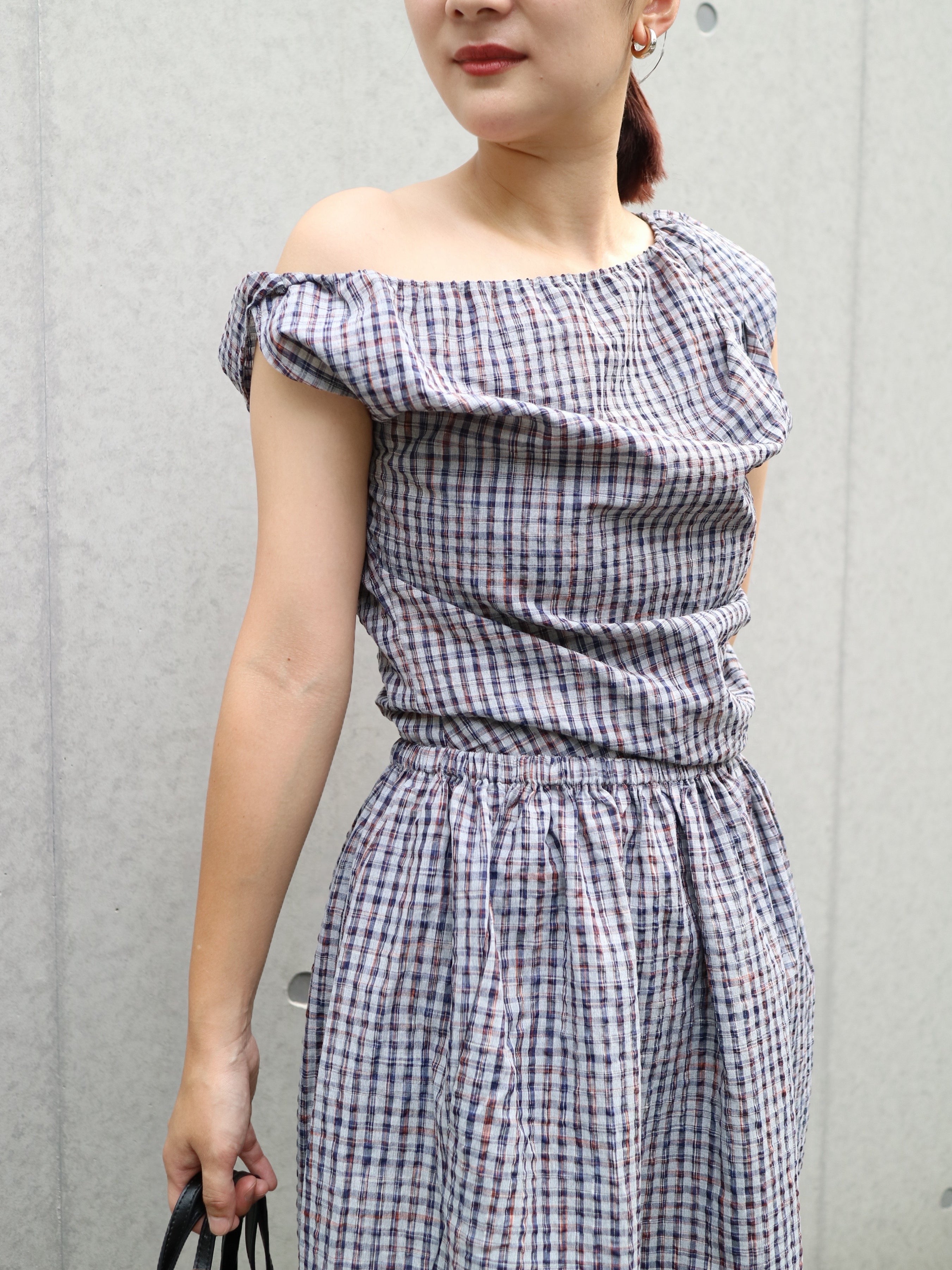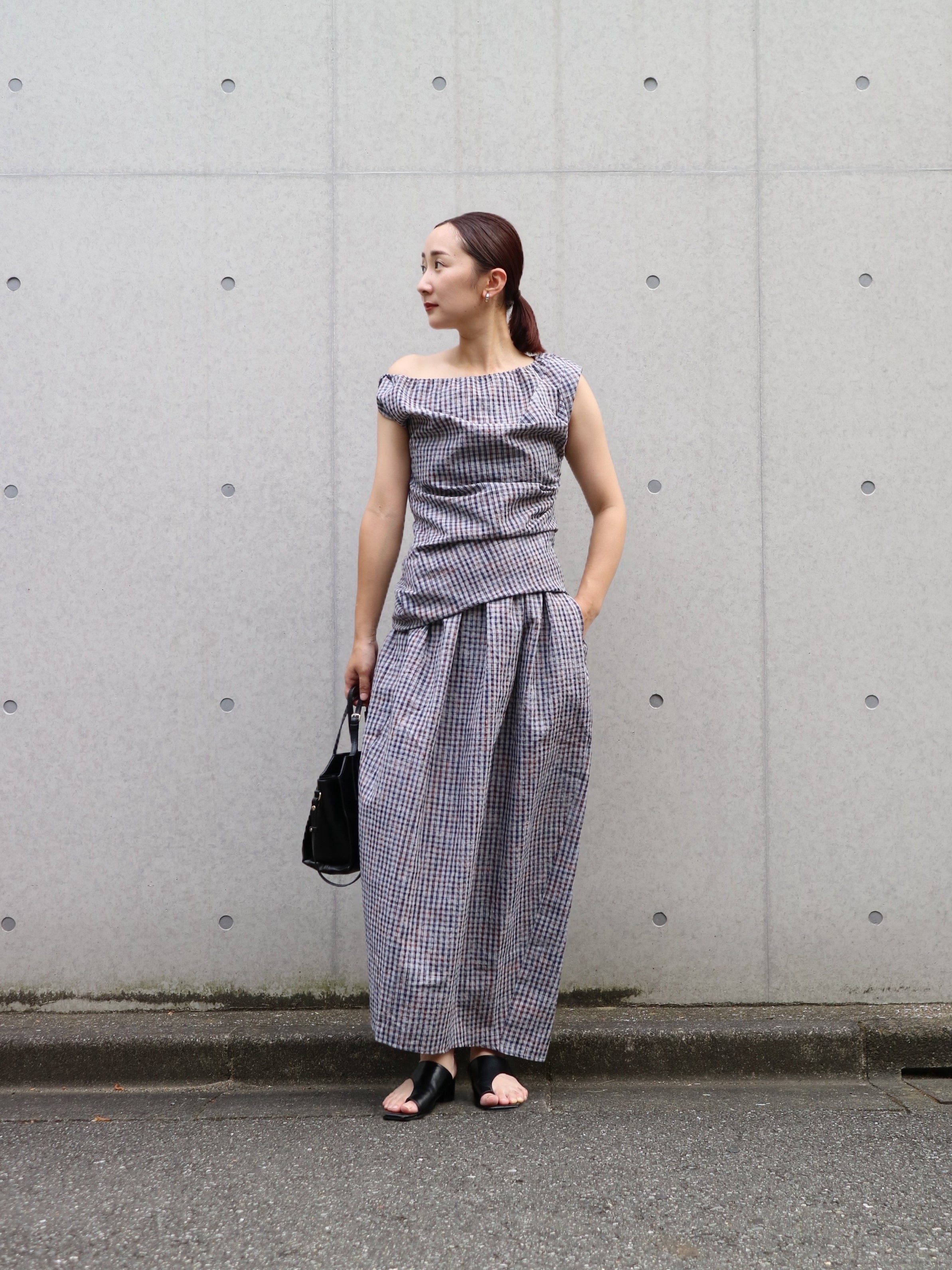 ブルーのギンガムチェックセットアップは、リゾートの海風に映える爽やかな色合い。