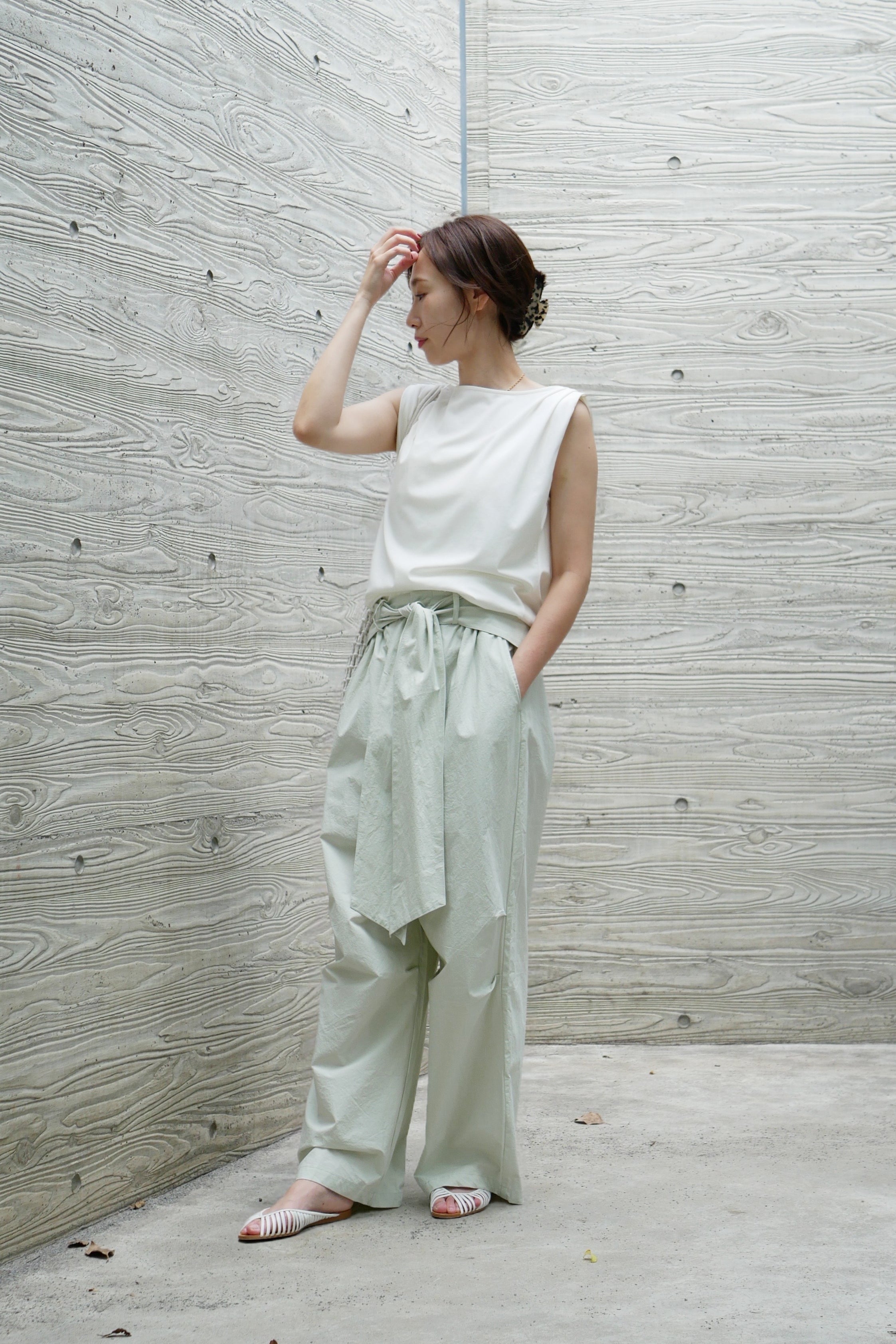リヨセル素材のウエストタックドレープパンツは、カーキの落ち着いた色合いが旅先の風景に馴染み、