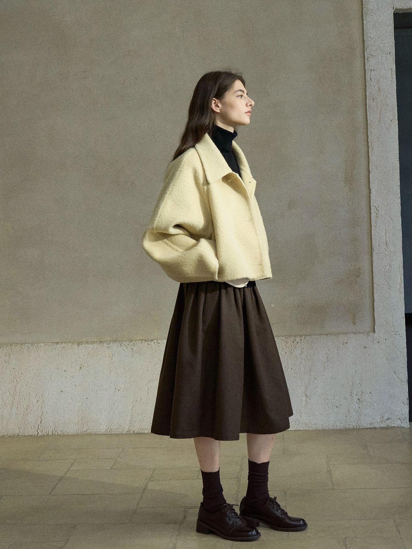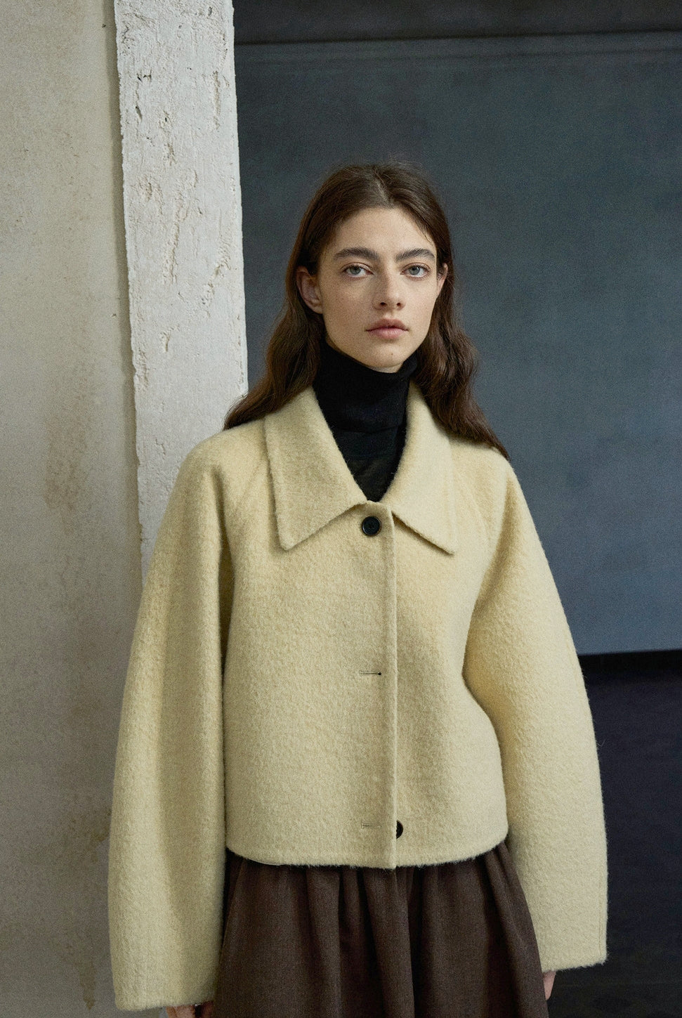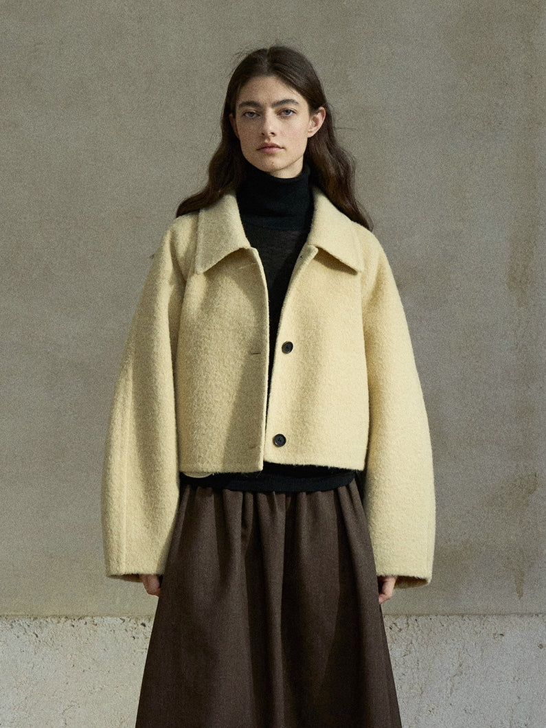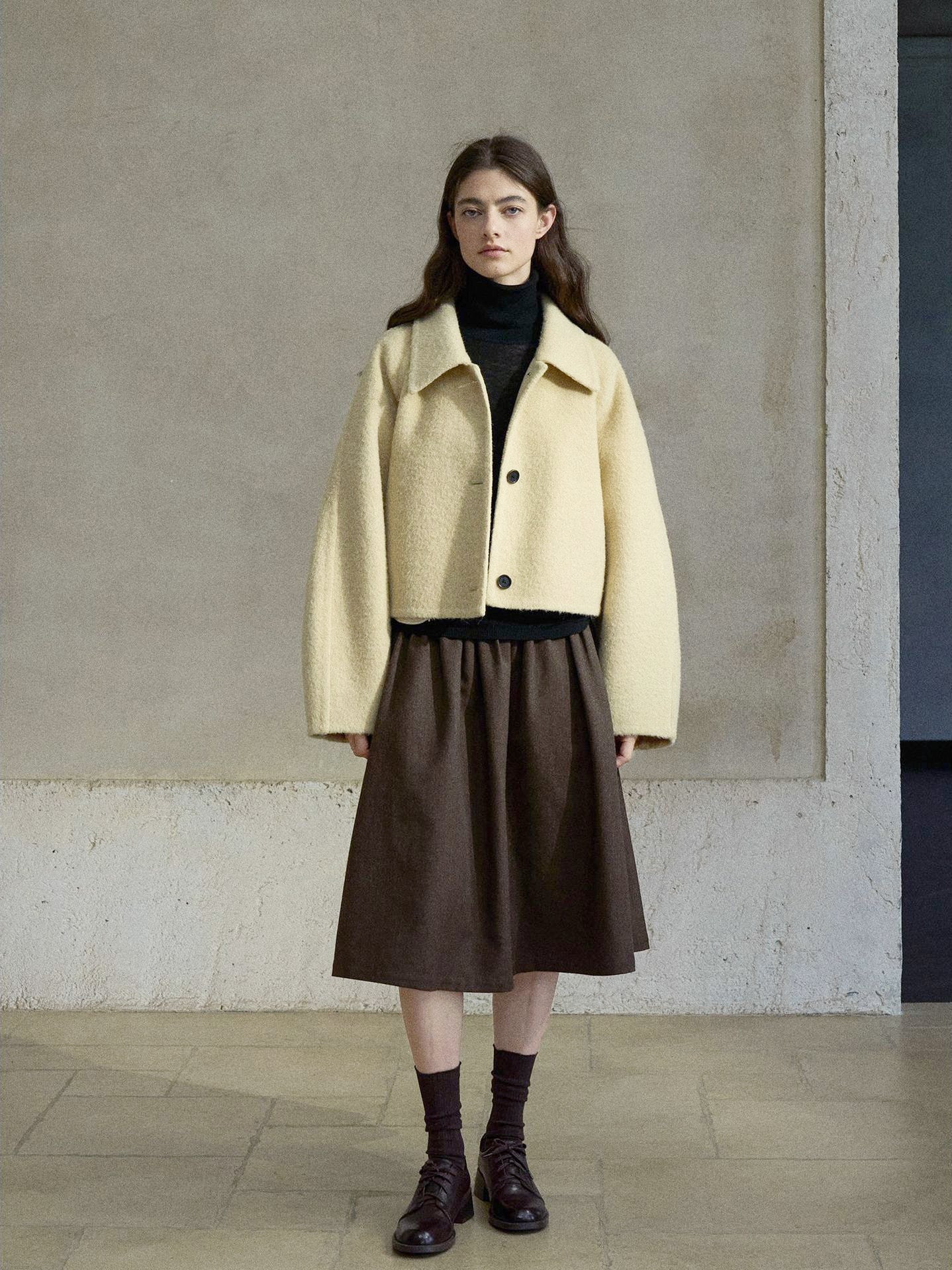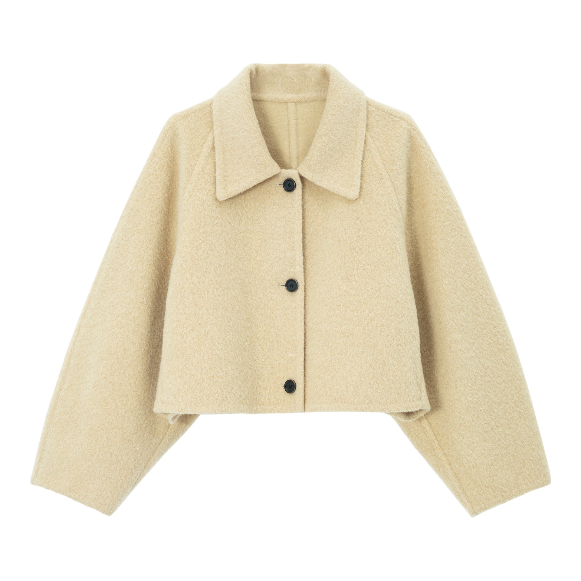 ややコンパクトなボックスシルエットで、肩まわりにゆとりを持たせつつ上品な立体感を演出。