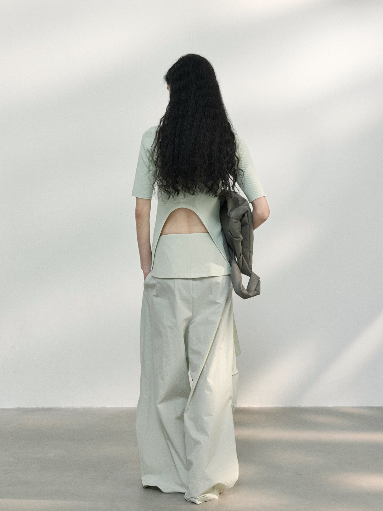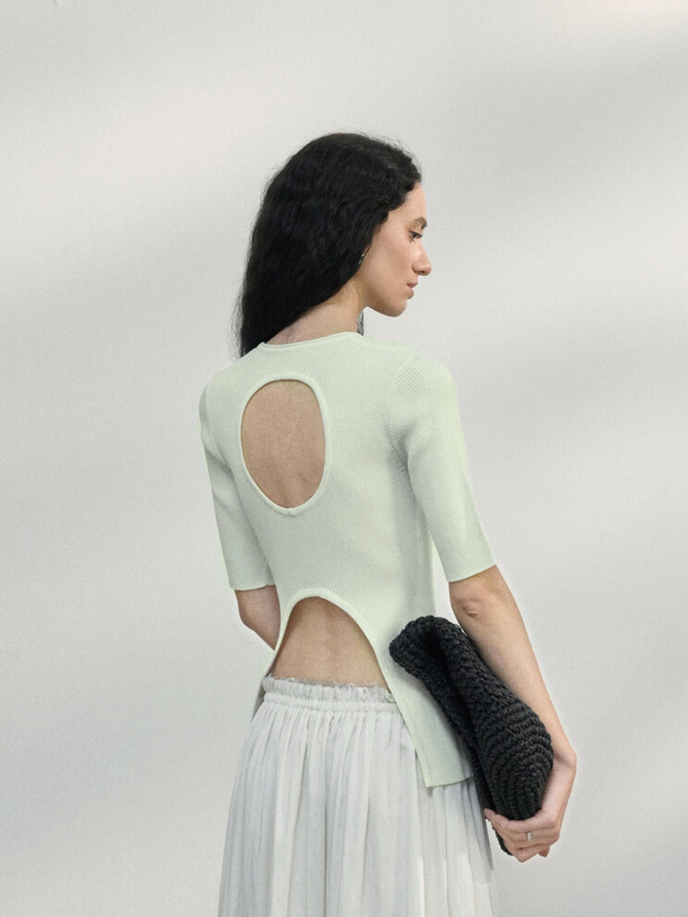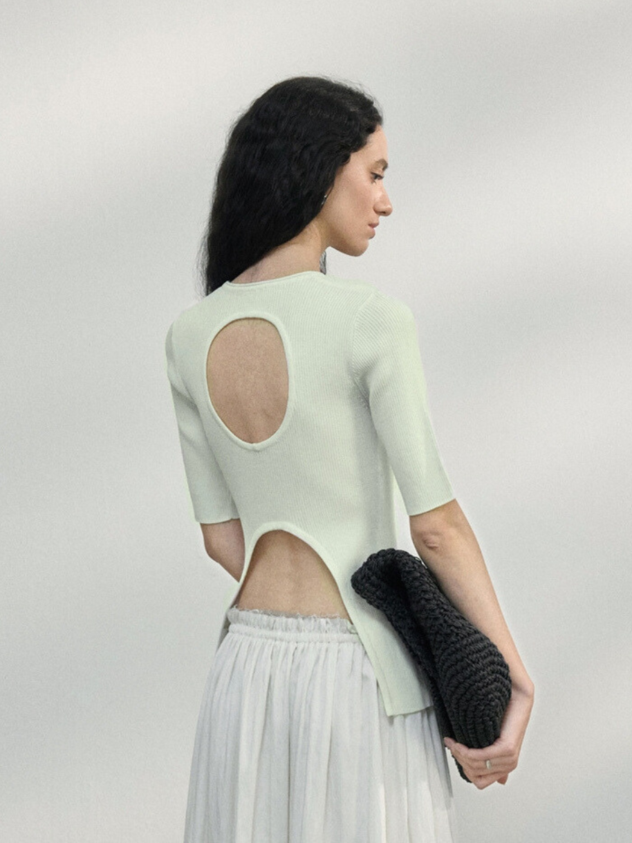 バックオープンデザインが女性らしさ引き立てるリブトップス。