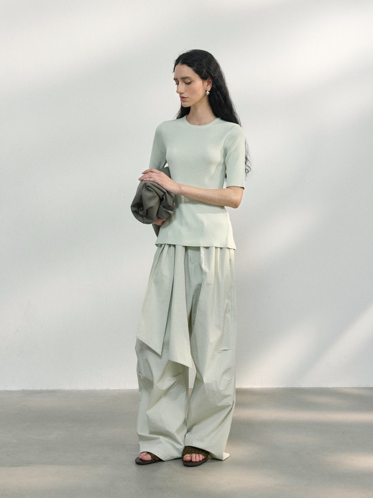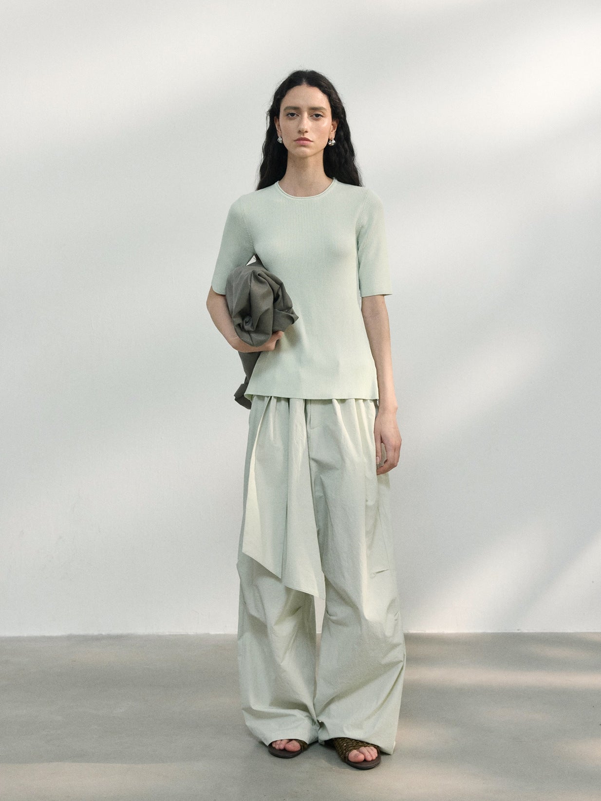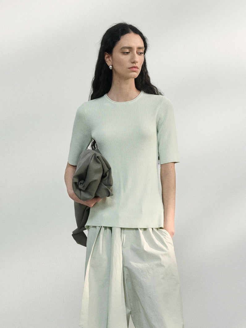 バックオープンデザインが女性らしさ引き立てるリブトップス。
