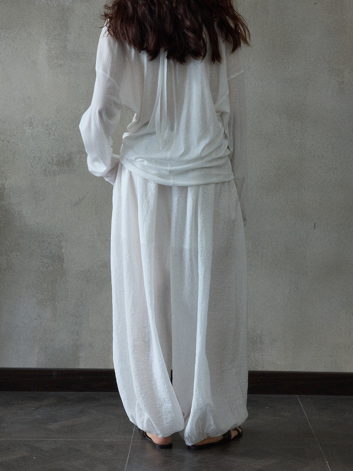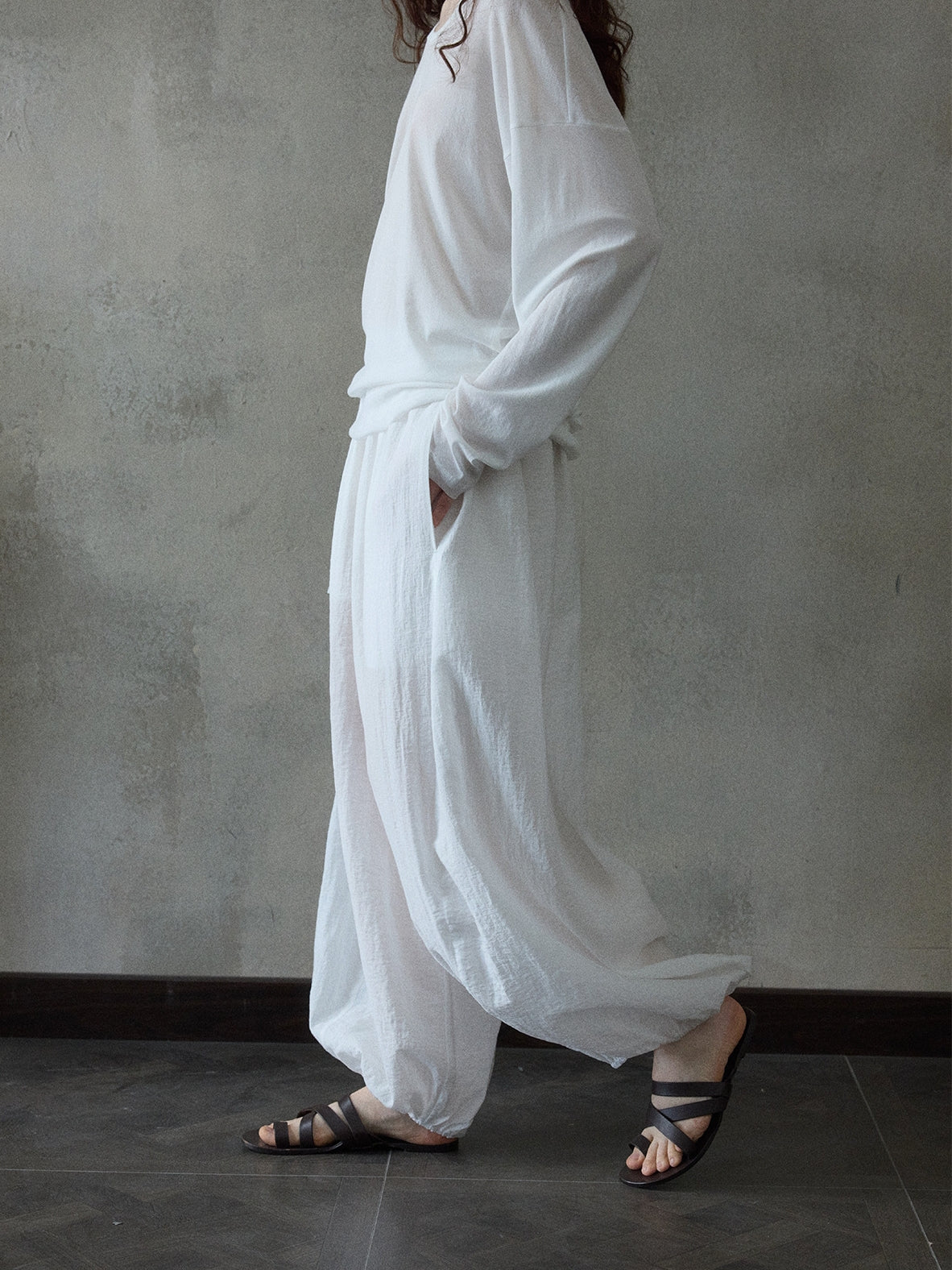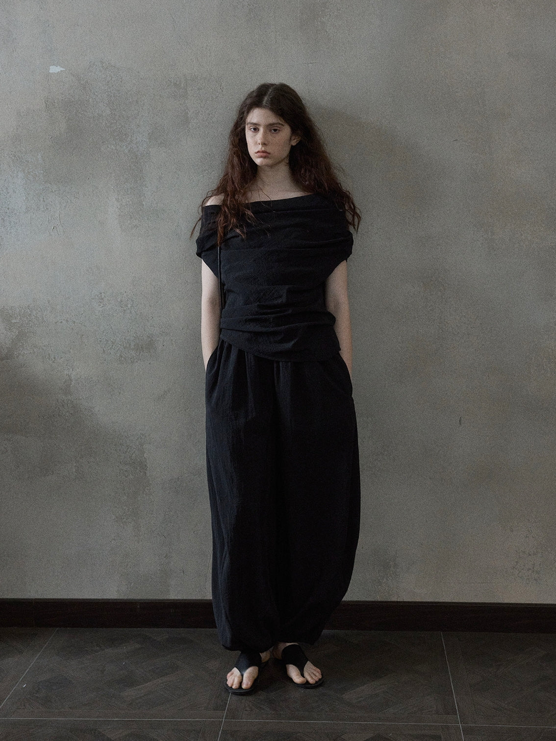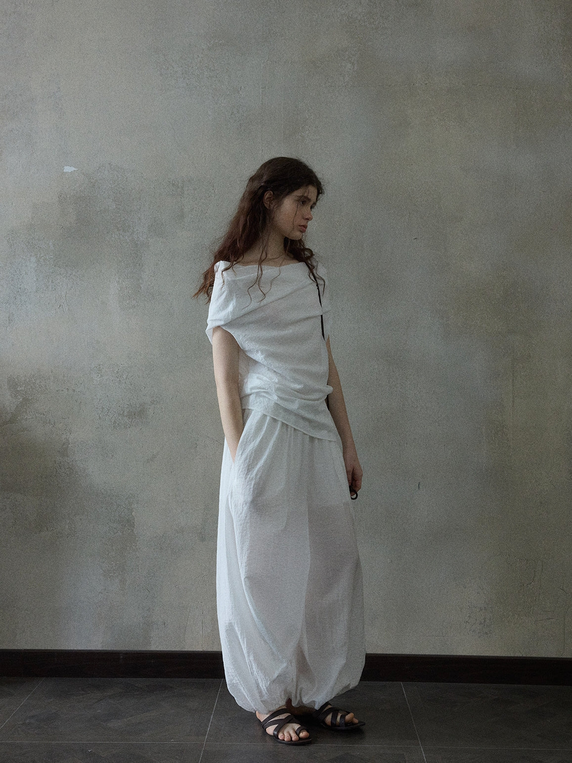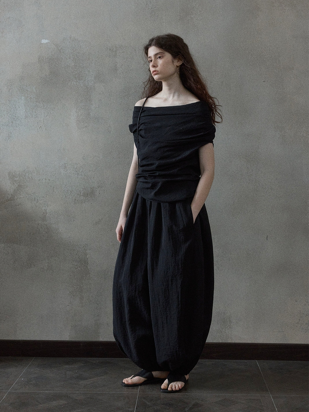 ウエストゴムでリラックス感のある今季注目のバルーンパンツ。