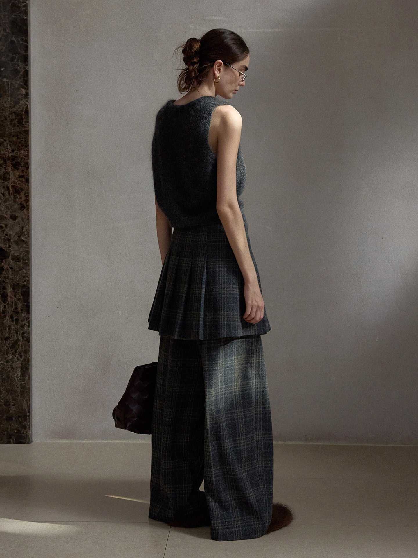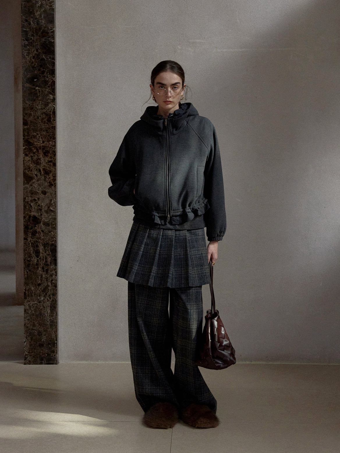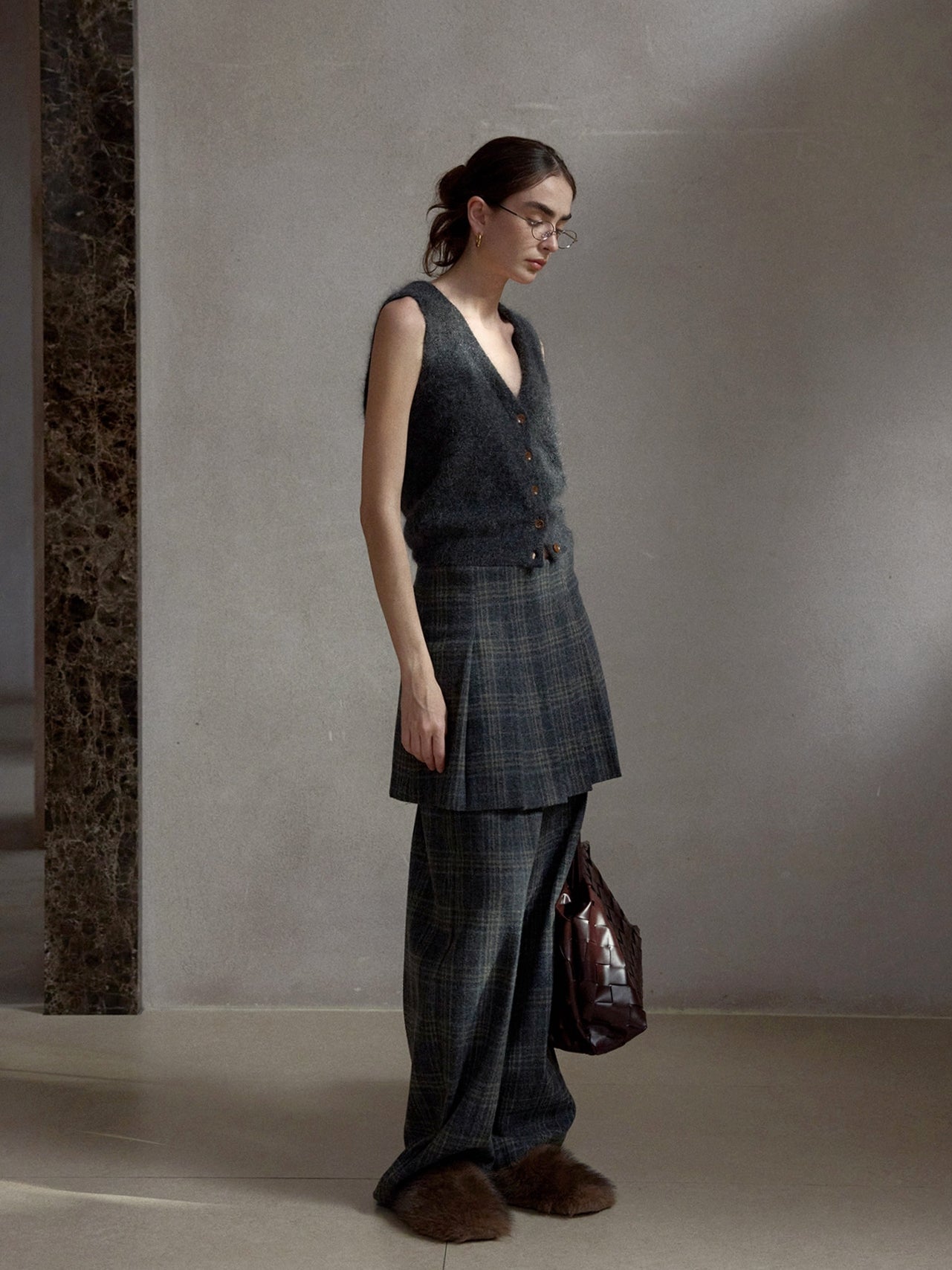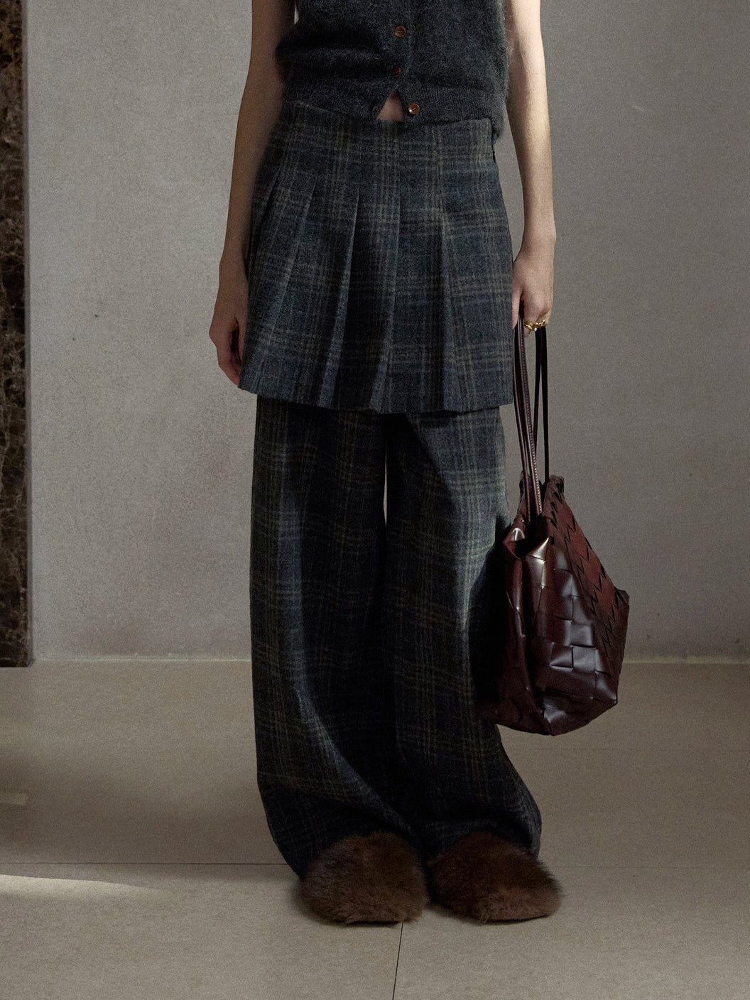 クラシカルなチェック柄を用いた、プリーツミニスカート×イージーパンツのレイヤードデザイン。