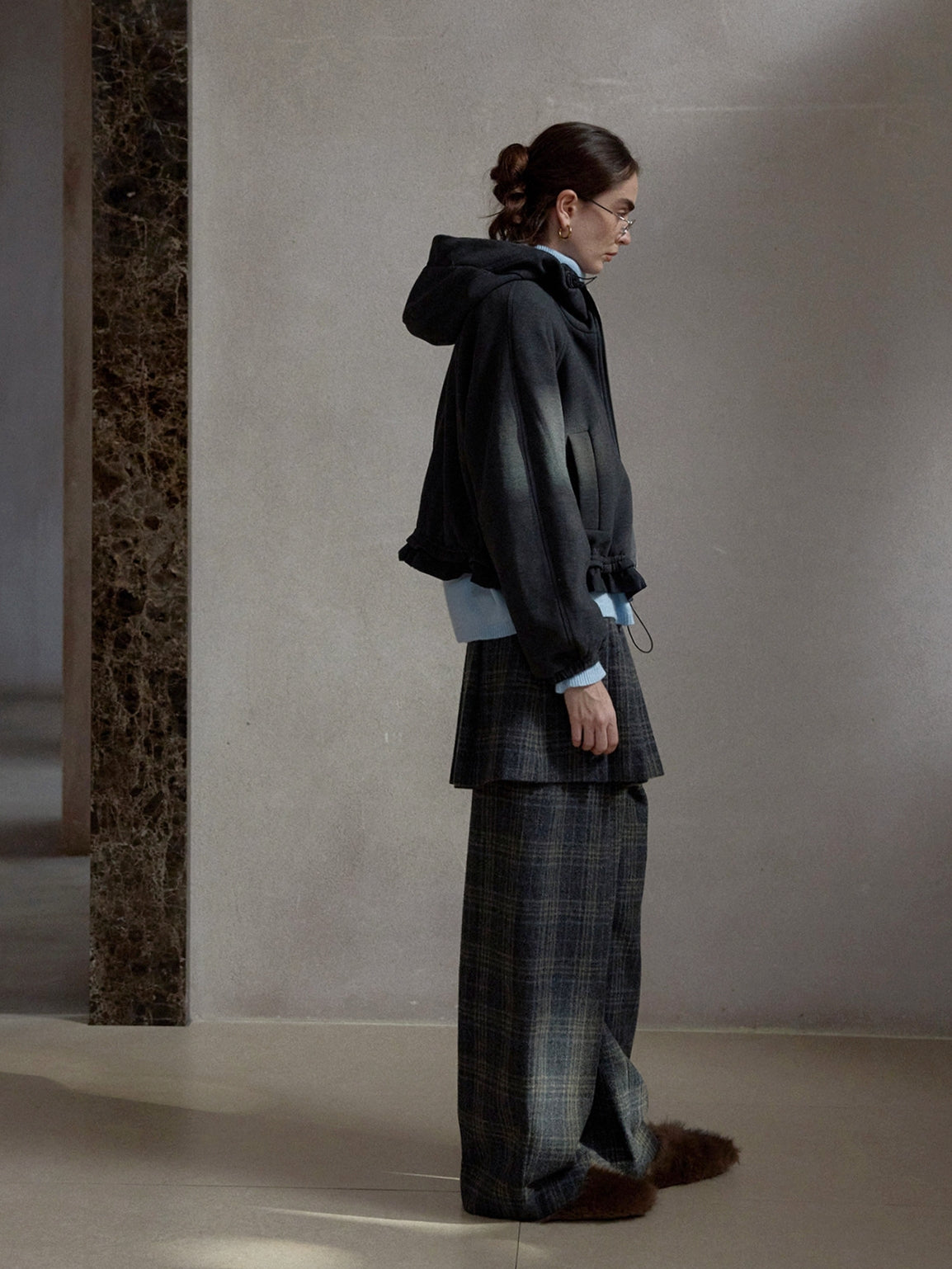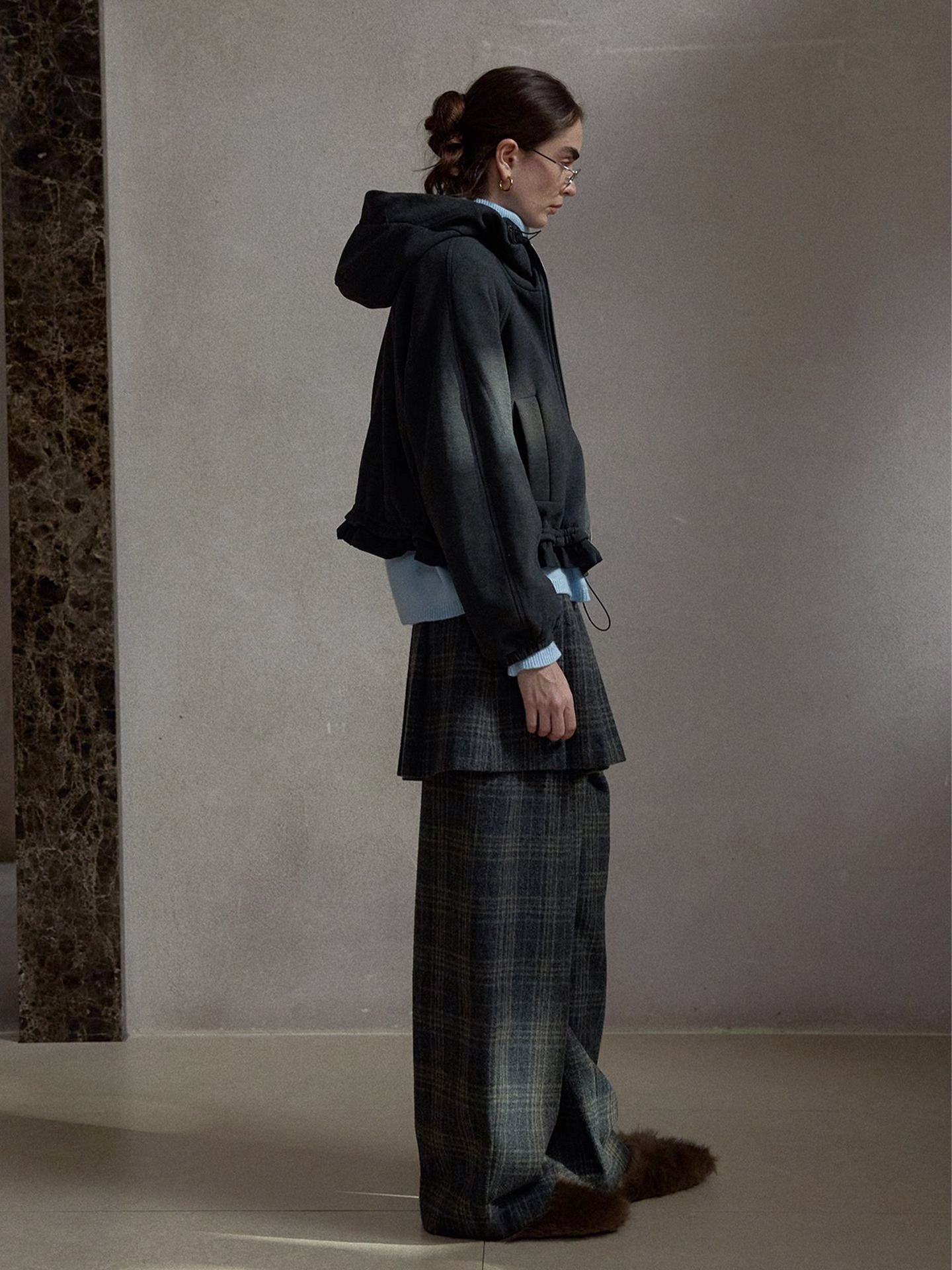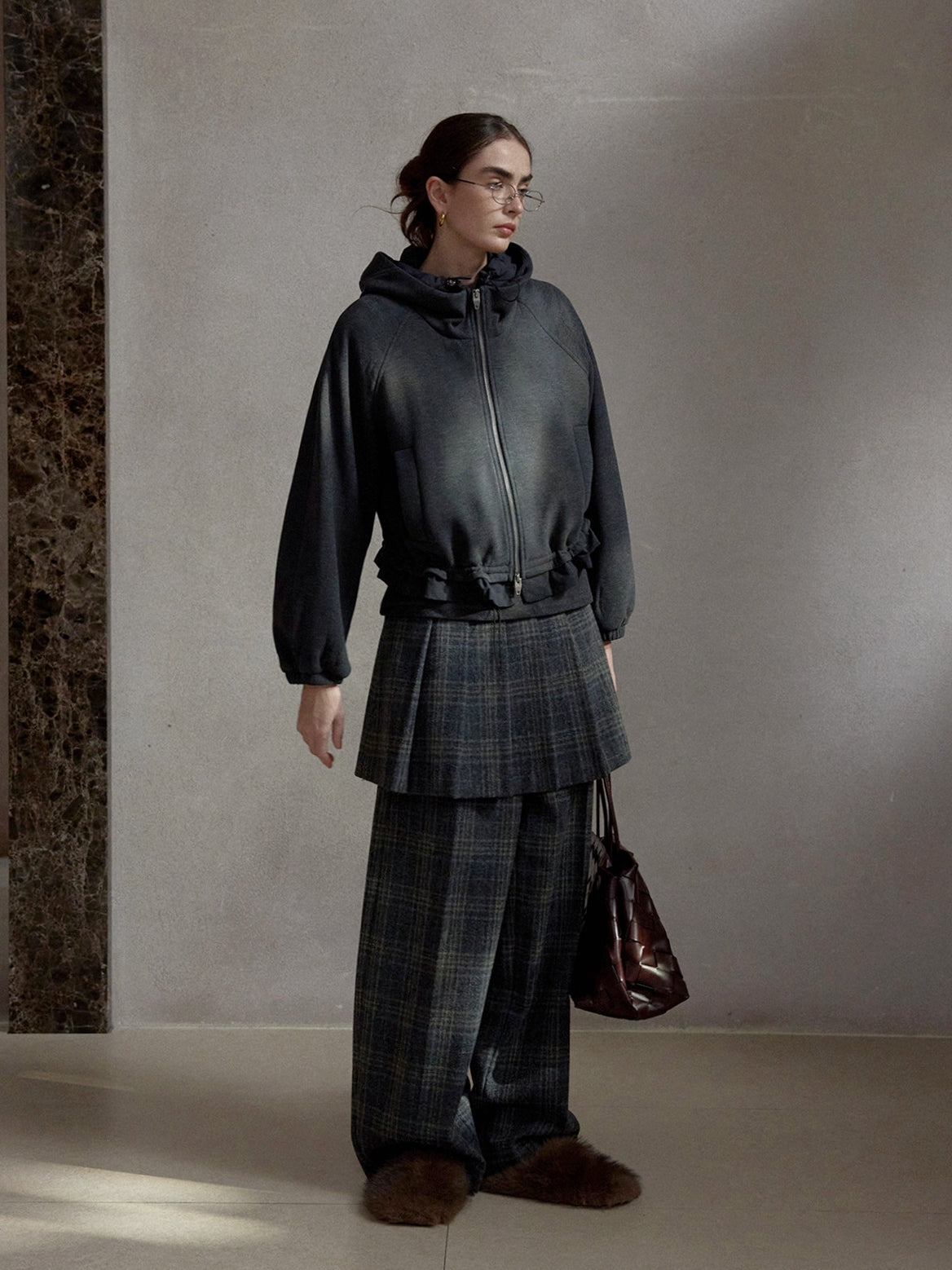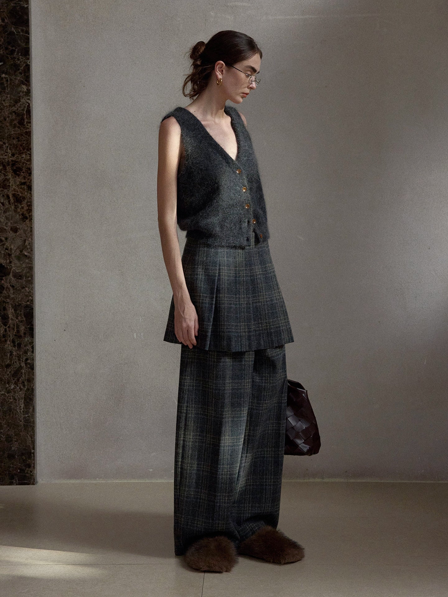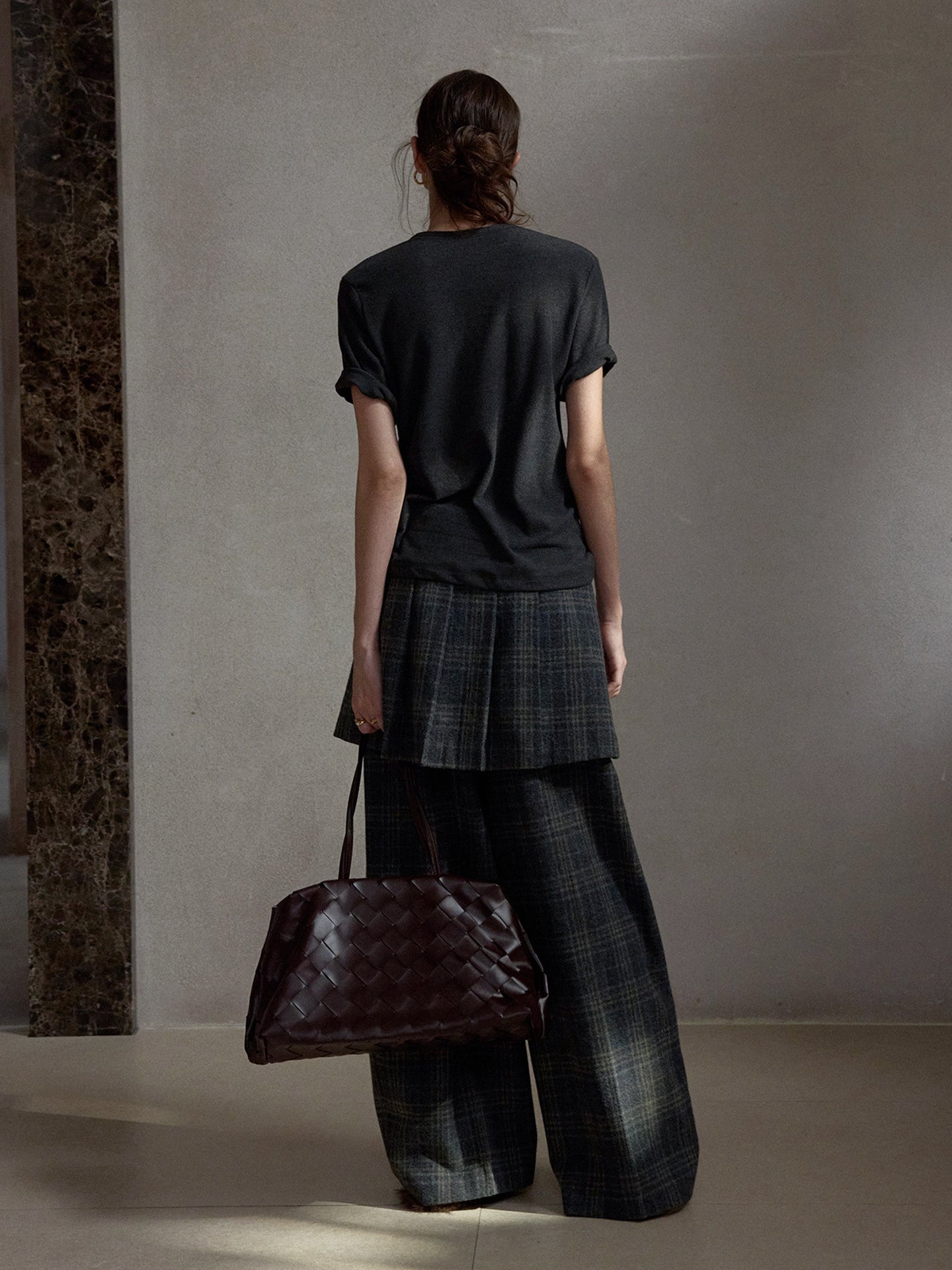 クラシカルなチェック柄を用いた、プリーツミニスカート×イージーパンツのレイヤードデザイン。