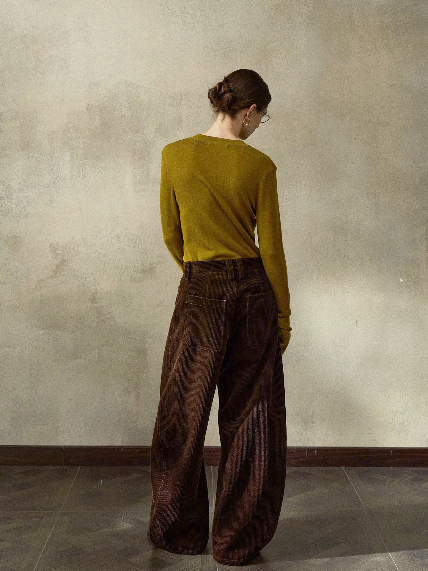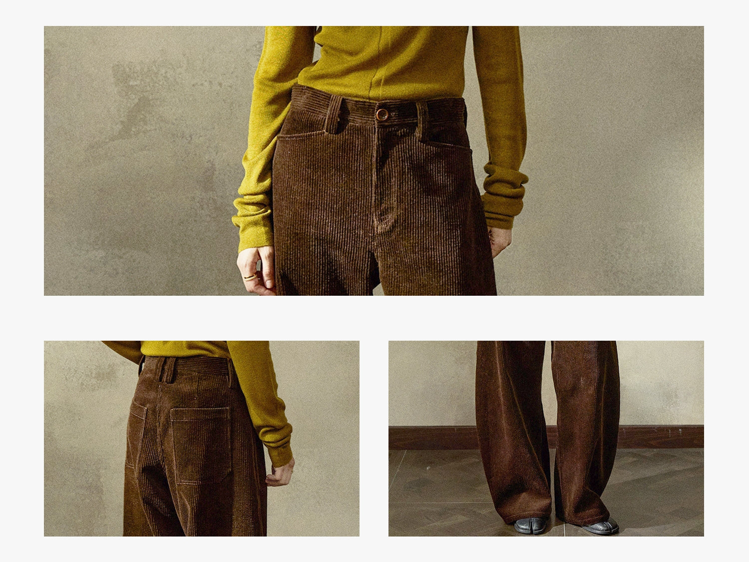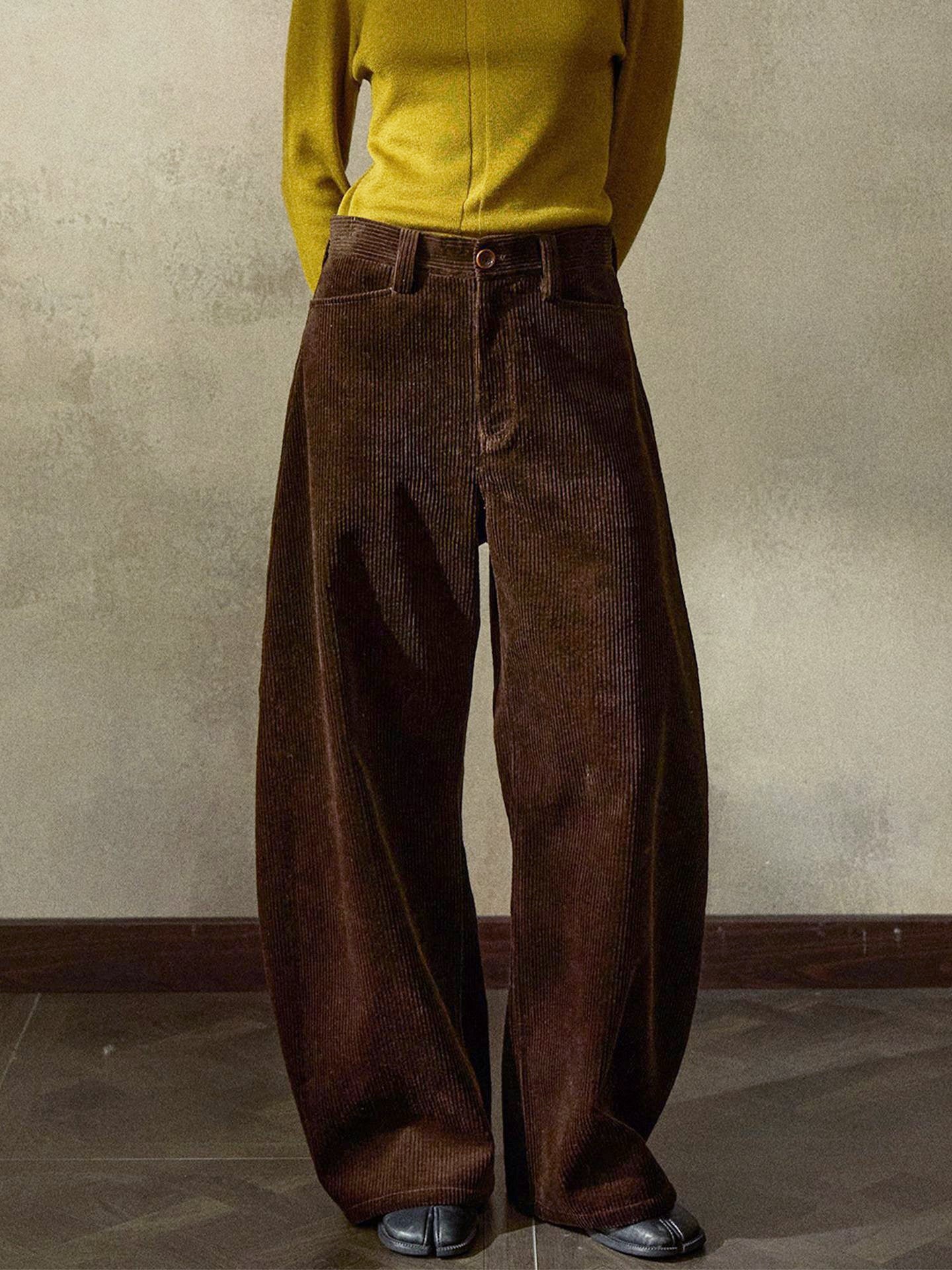 深みのあるブラウンが印象的なコーデュロイカーブワイドパンツ。