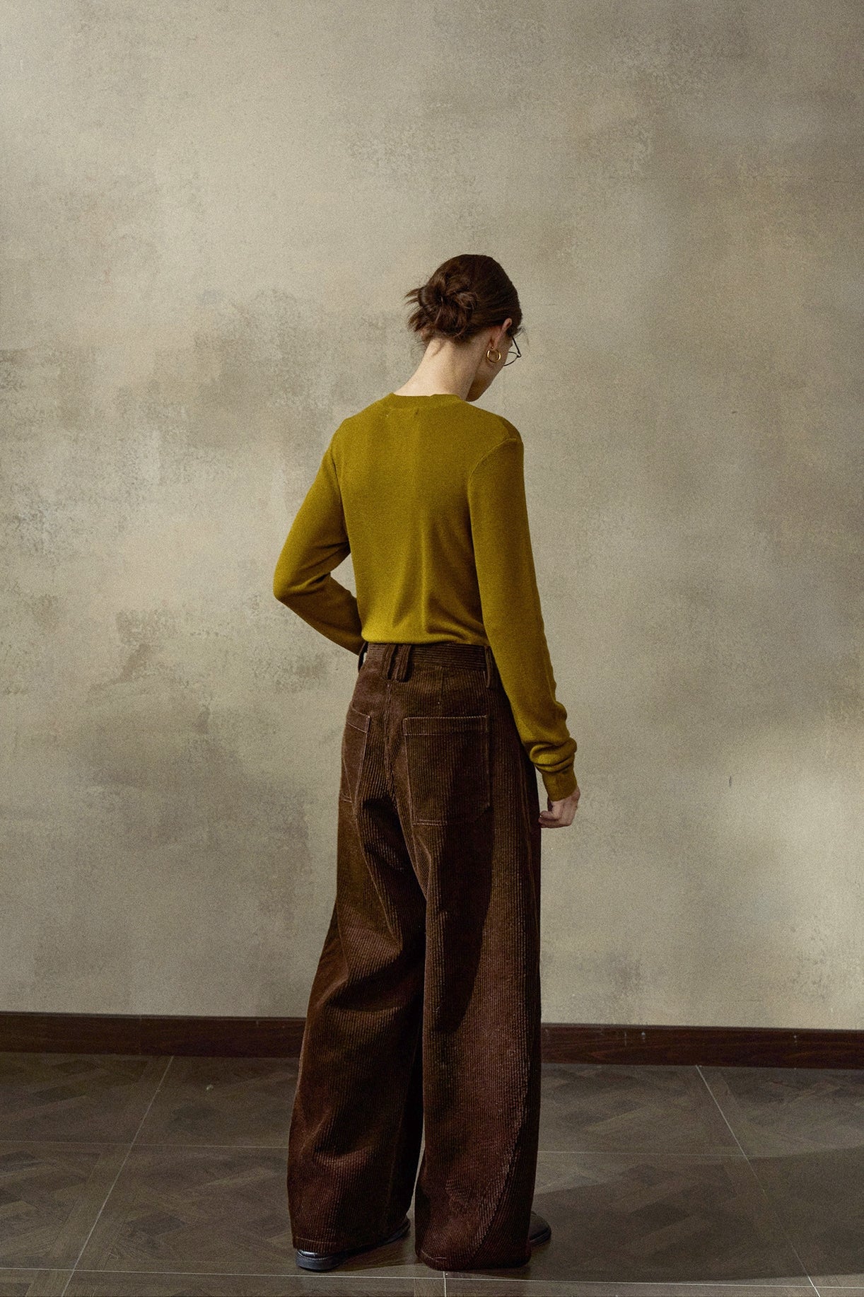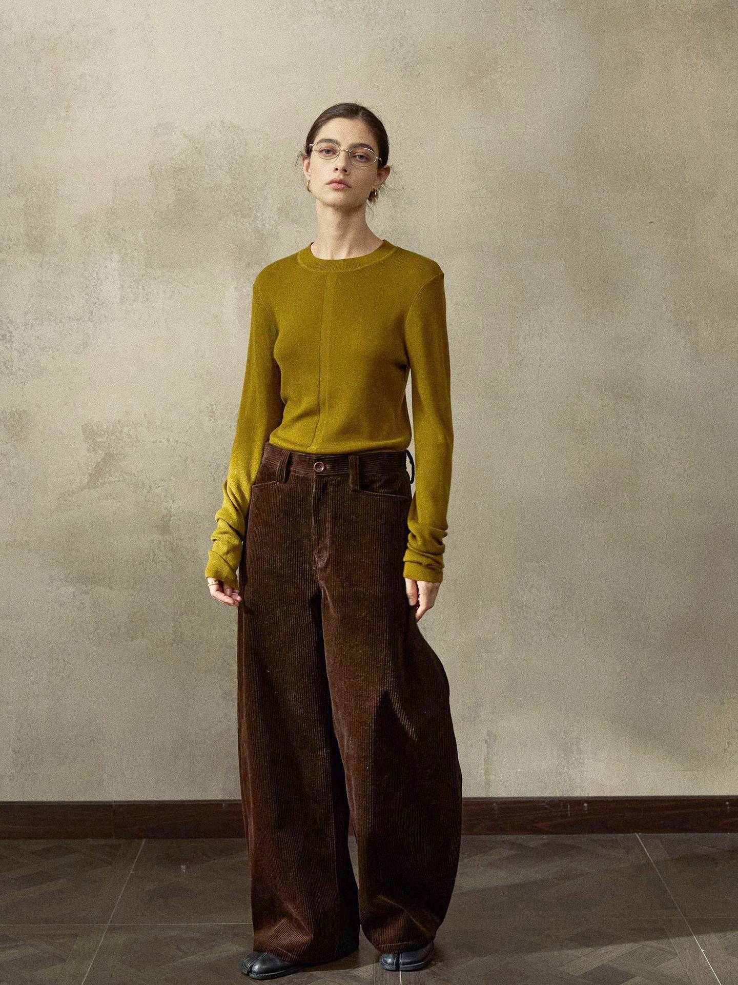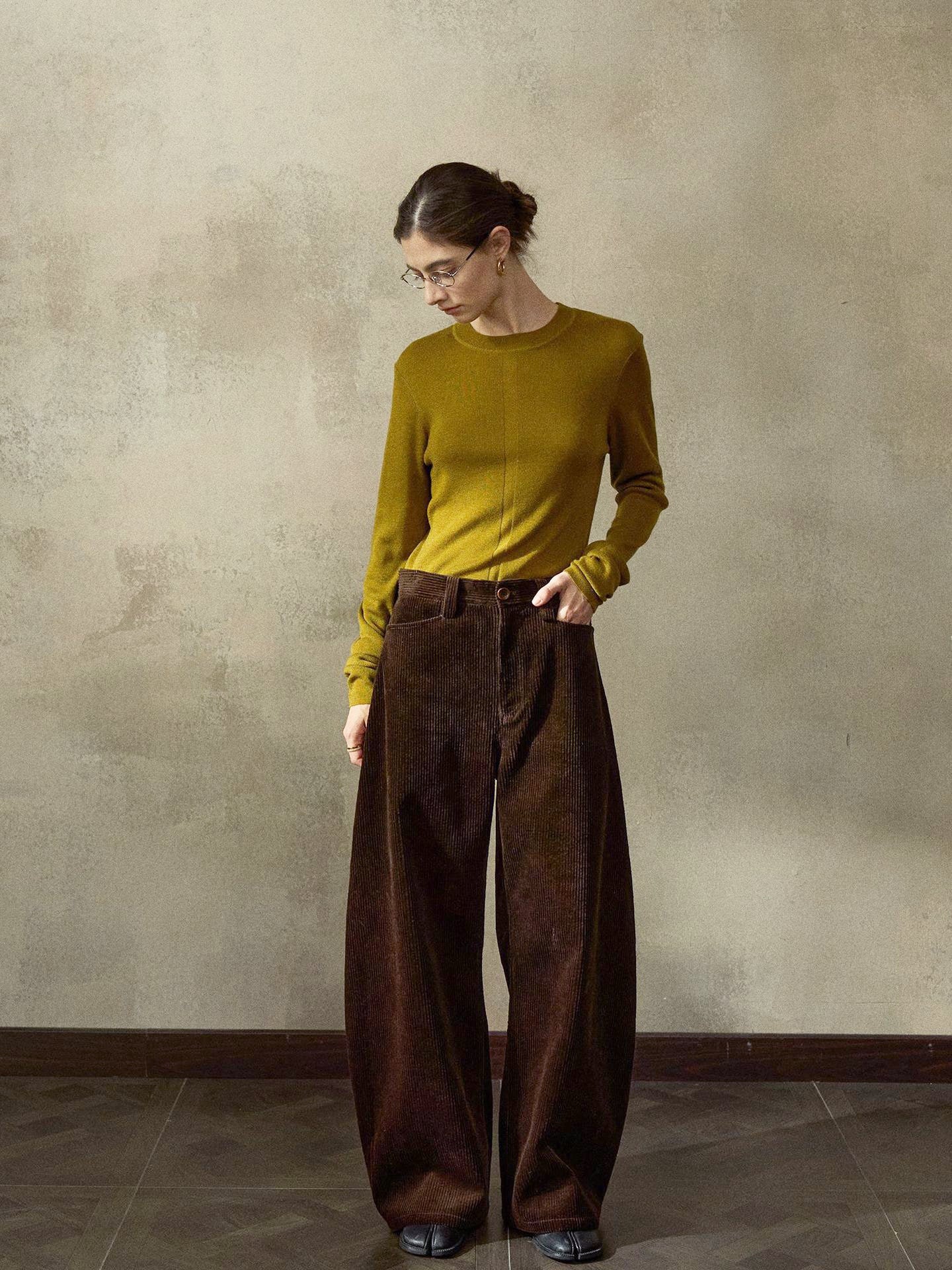 深みのあるブラウンが印象的なコーデュロイカーブワイドパンツ。