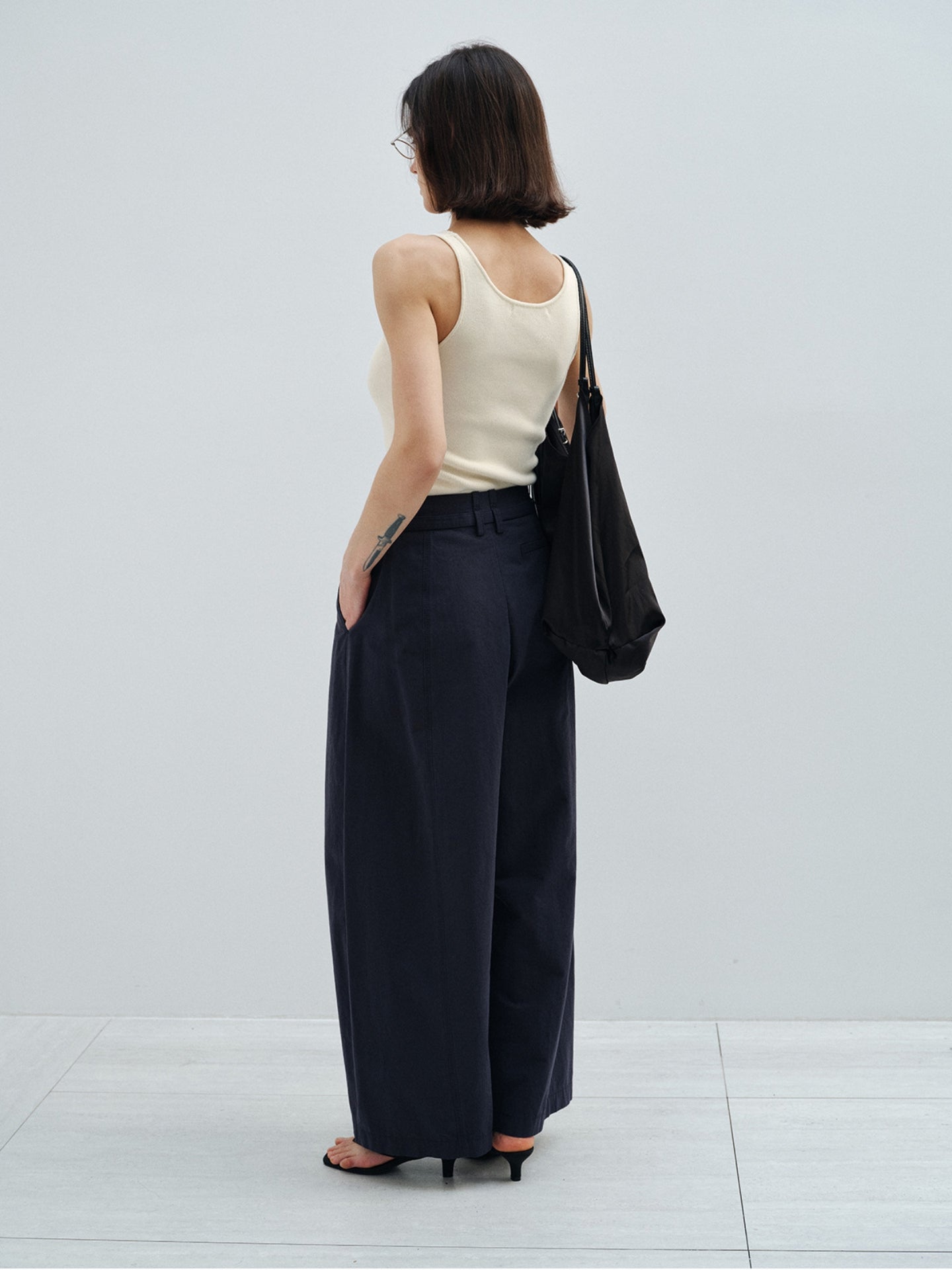 深めのタックから生まれる弧状のボリュームラインが、レッグラインを拾わず歩くたびにドラマティックなドレープを形成。