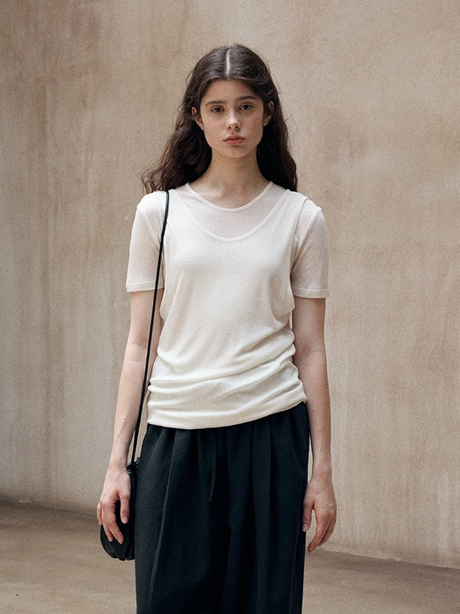 一枚の布で仕立てた、タンクトップとTシャツがレイヤードされたデザイン。
