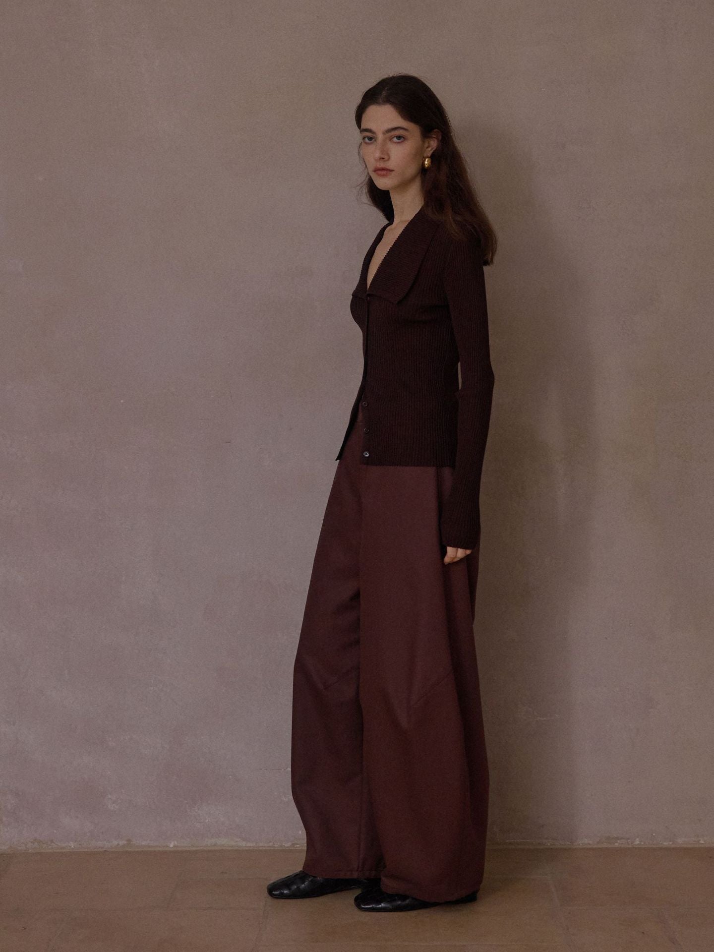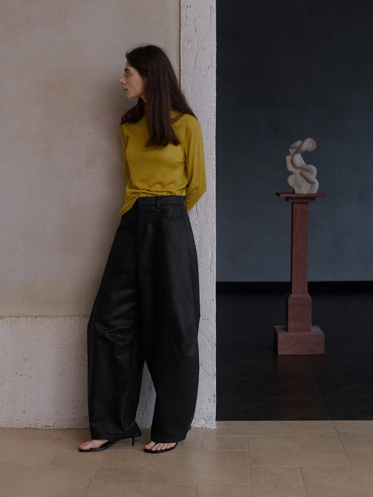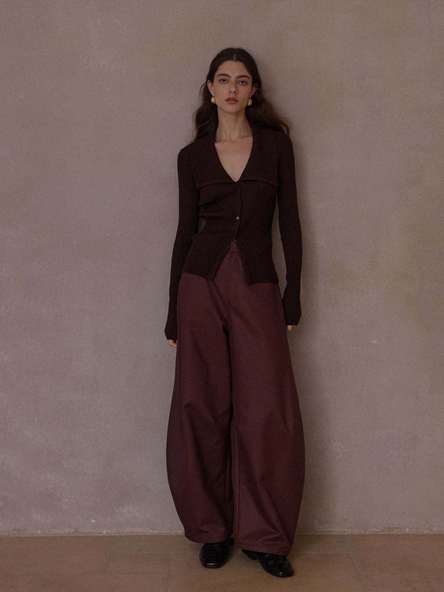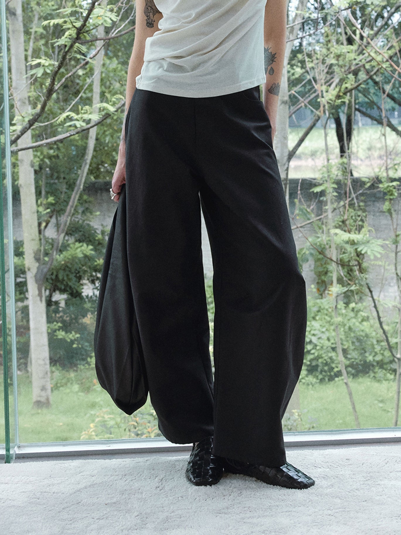 裾に向かってふっくらと広がる立体的なカーブシルエットが特徴のパンツ。