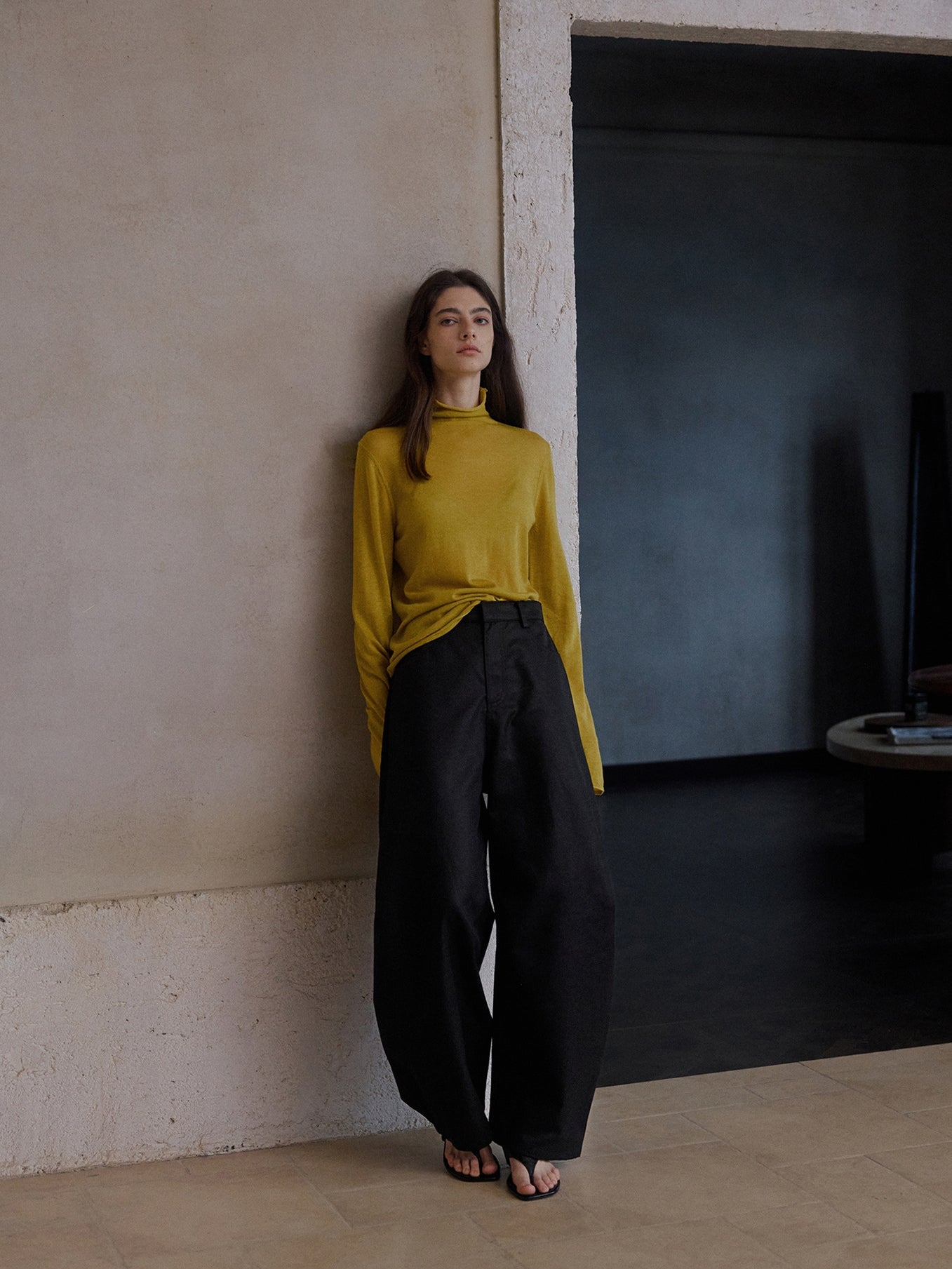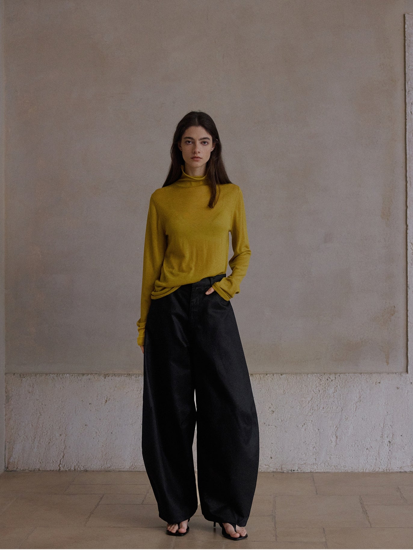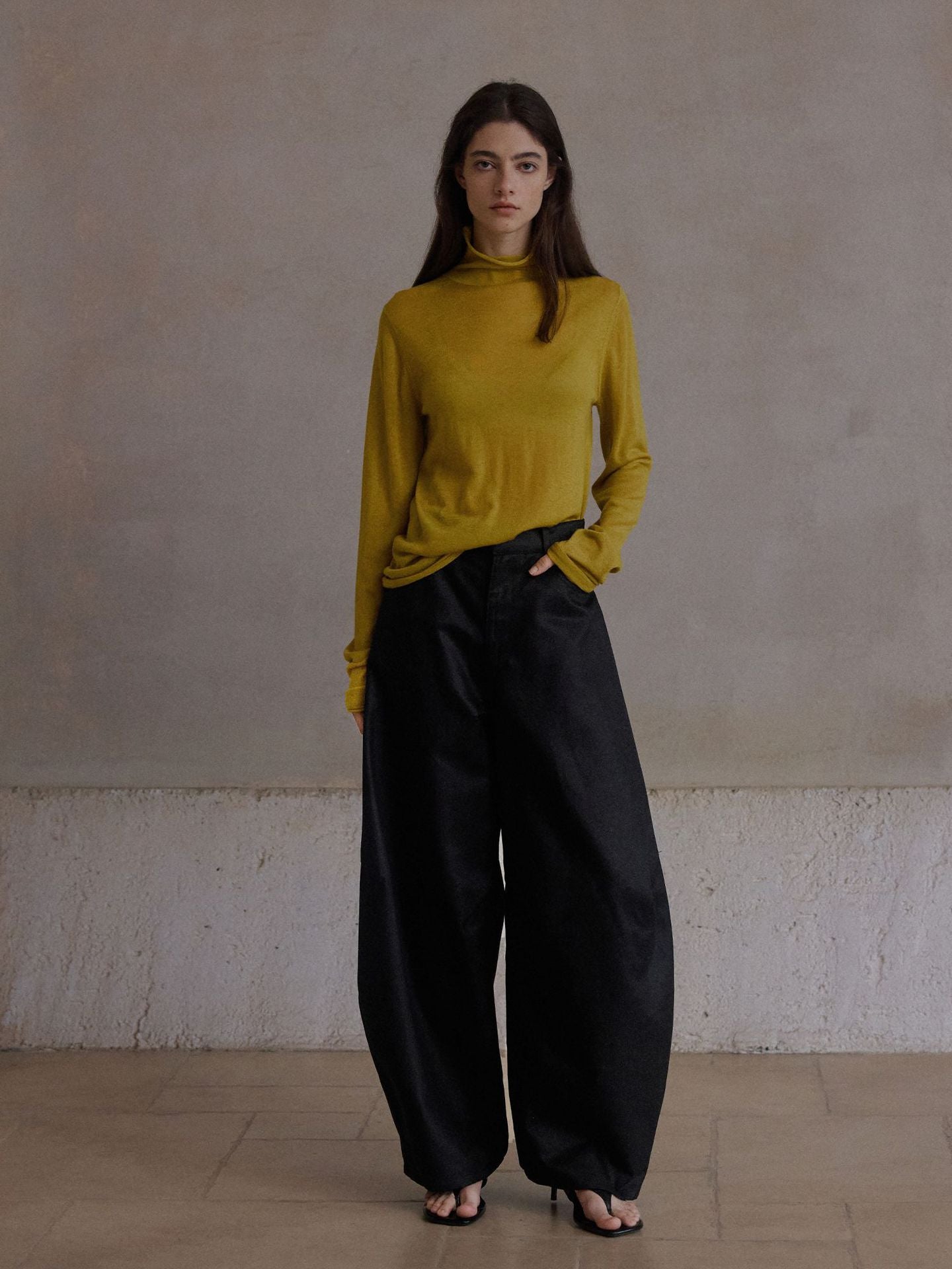 タックを入れずに仕立てることで、すっきりとしたウエストまわりと独特のボリューム感を両立。