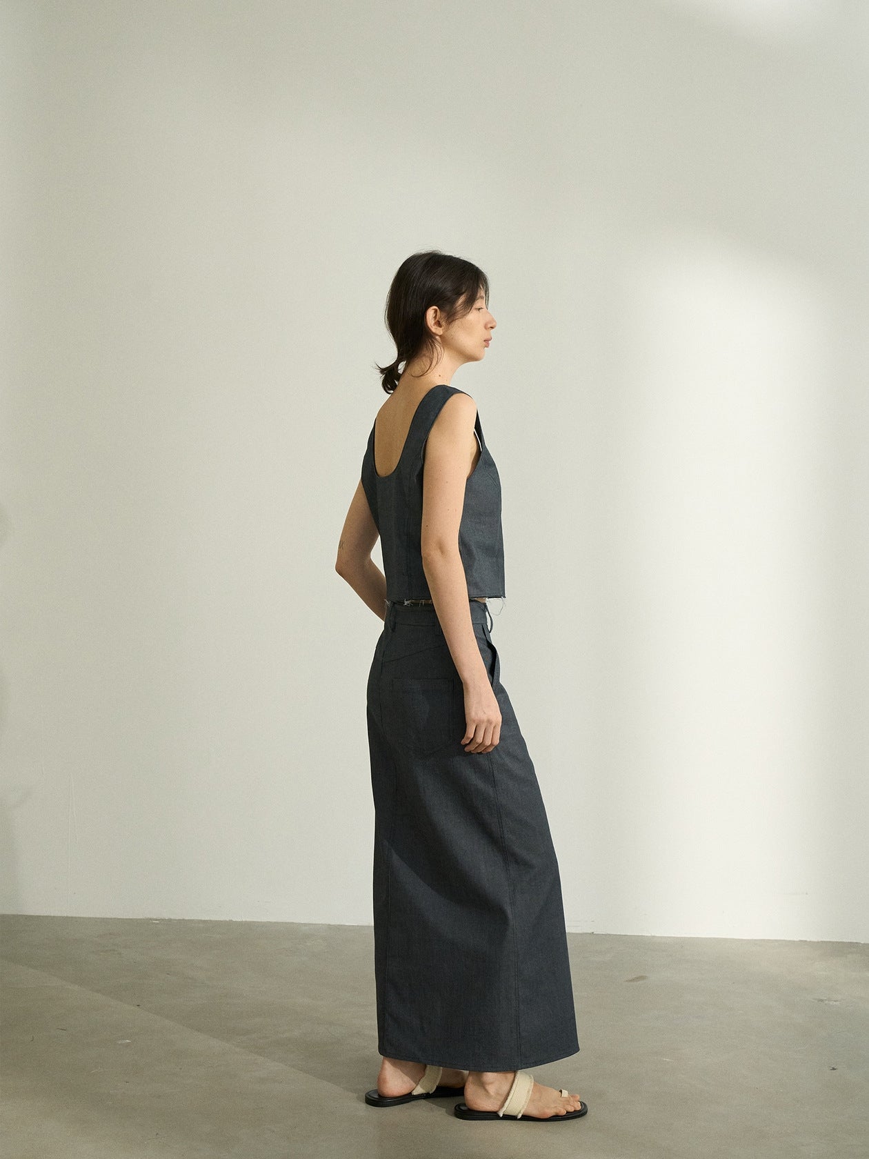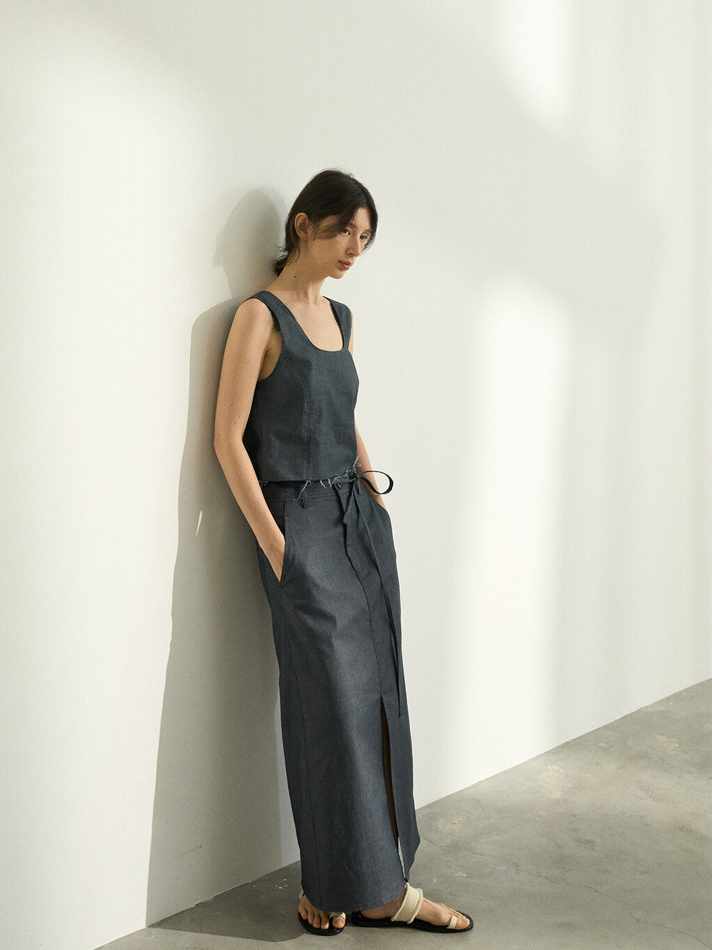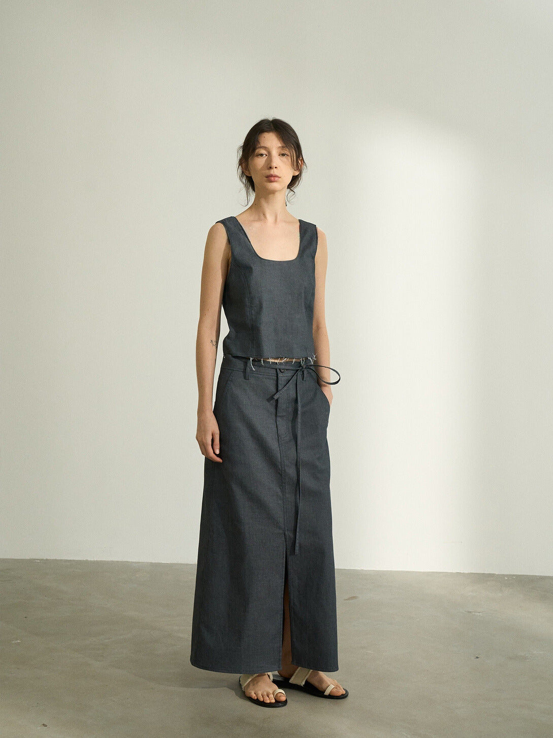同素材のデニムスリットロングスカートとセットアップで着用も可能です。