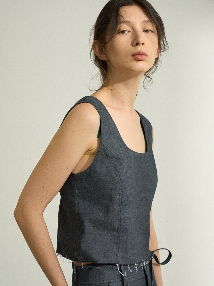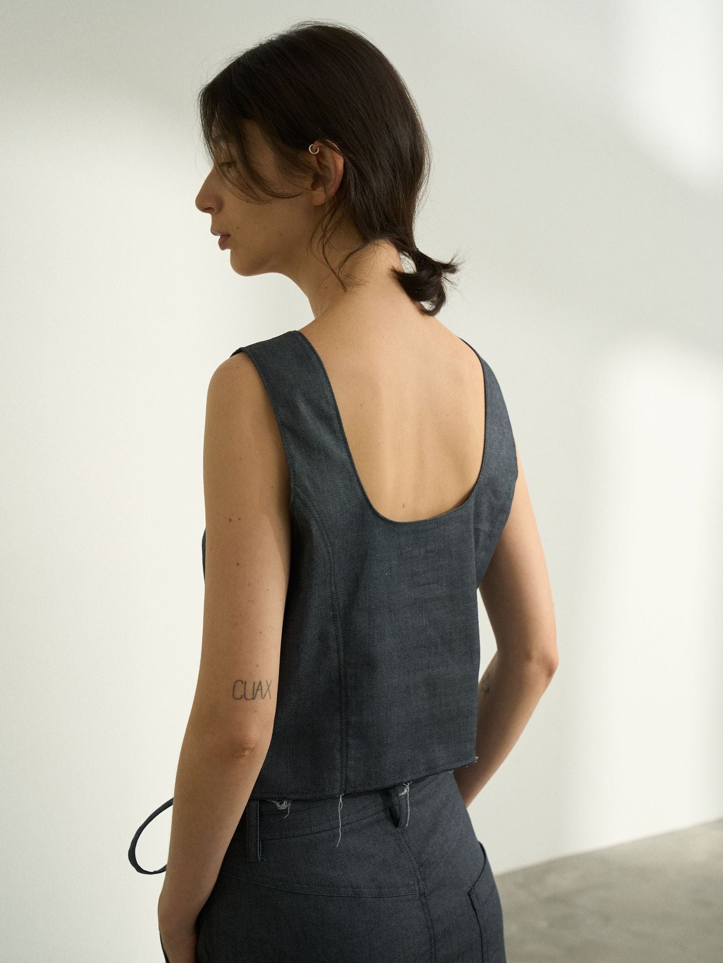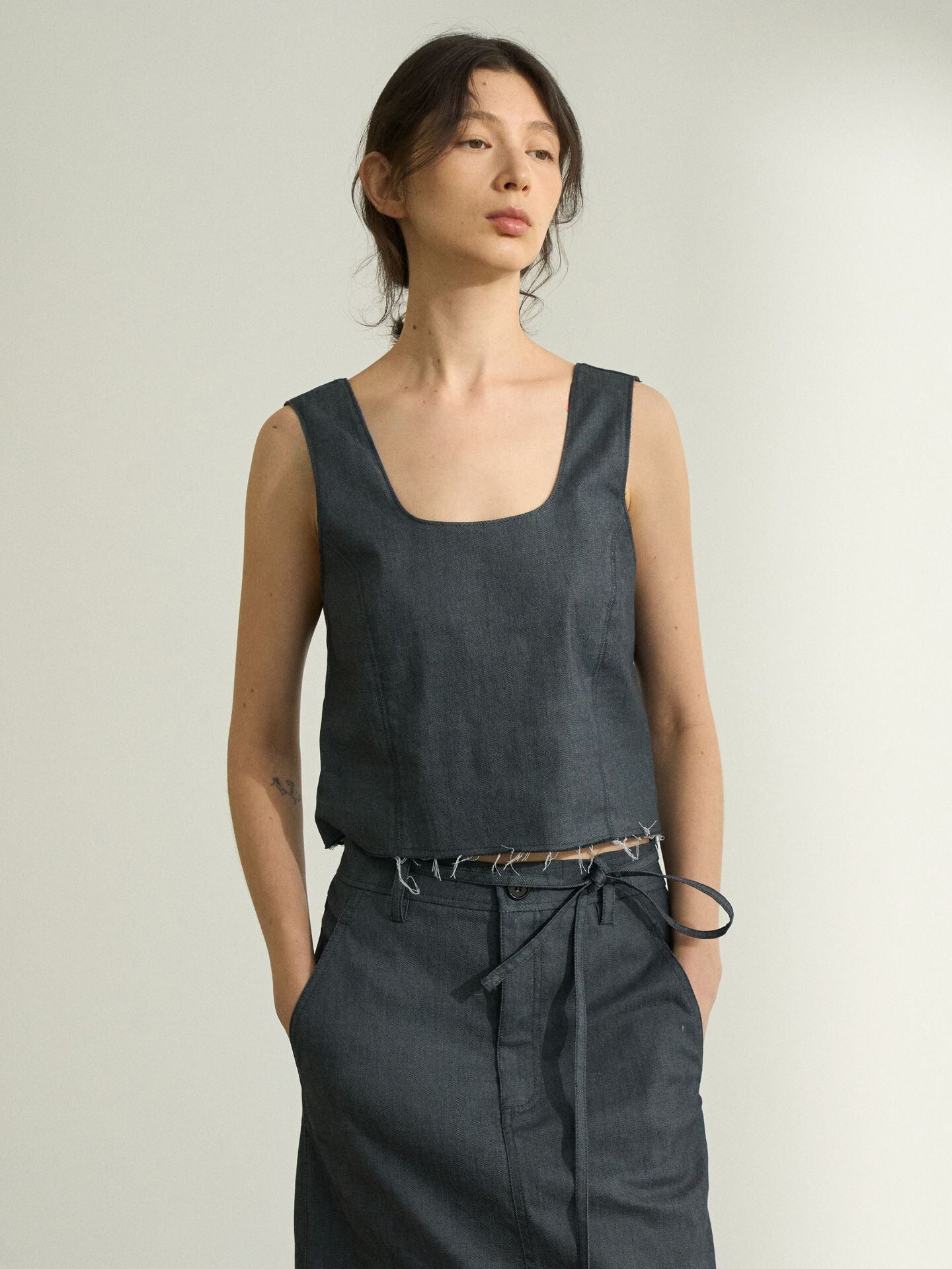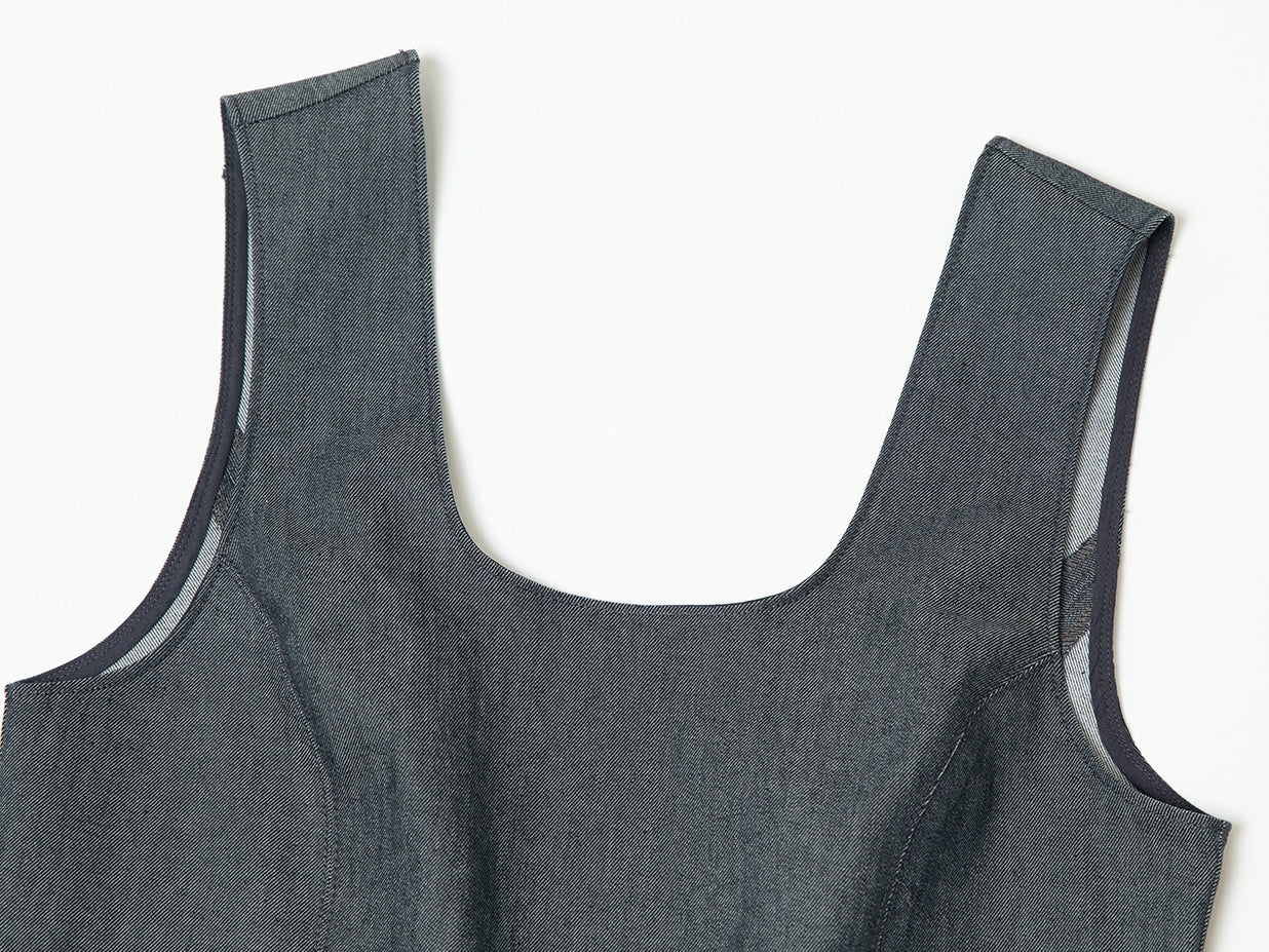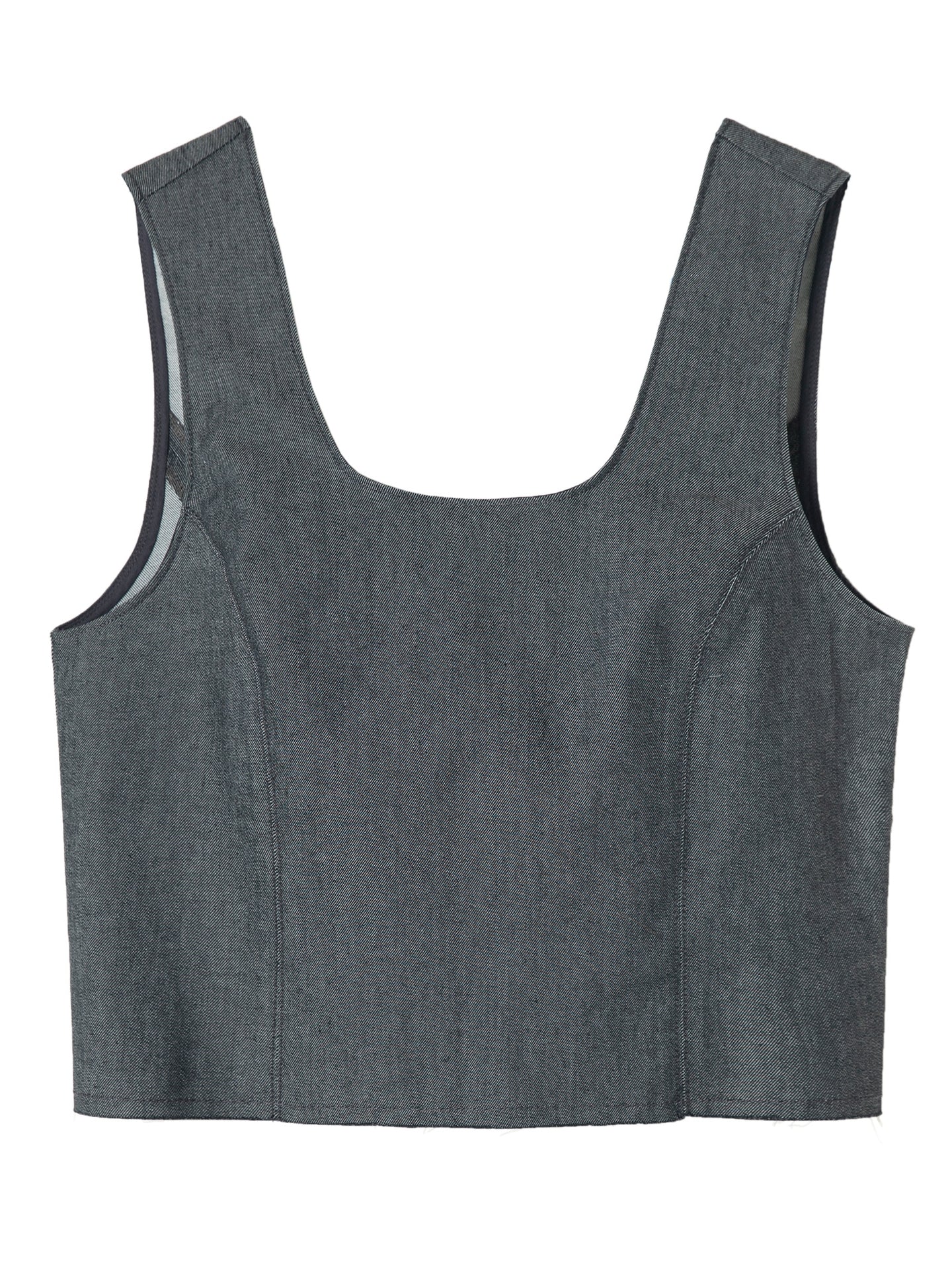 1枚はもちろん、レイヤードにTシャツやタンクトップなど様々な着こなしに活躍するデニムビスチェ。