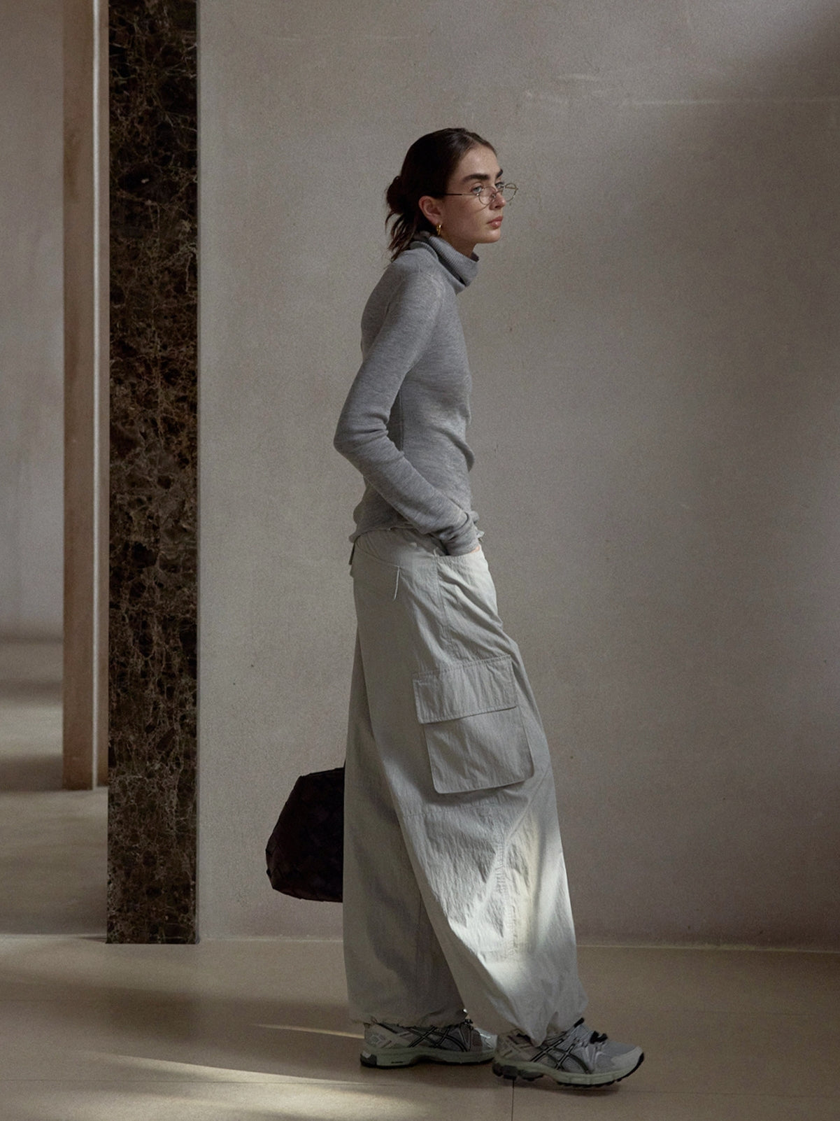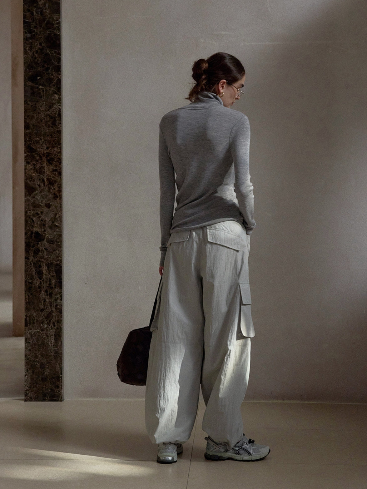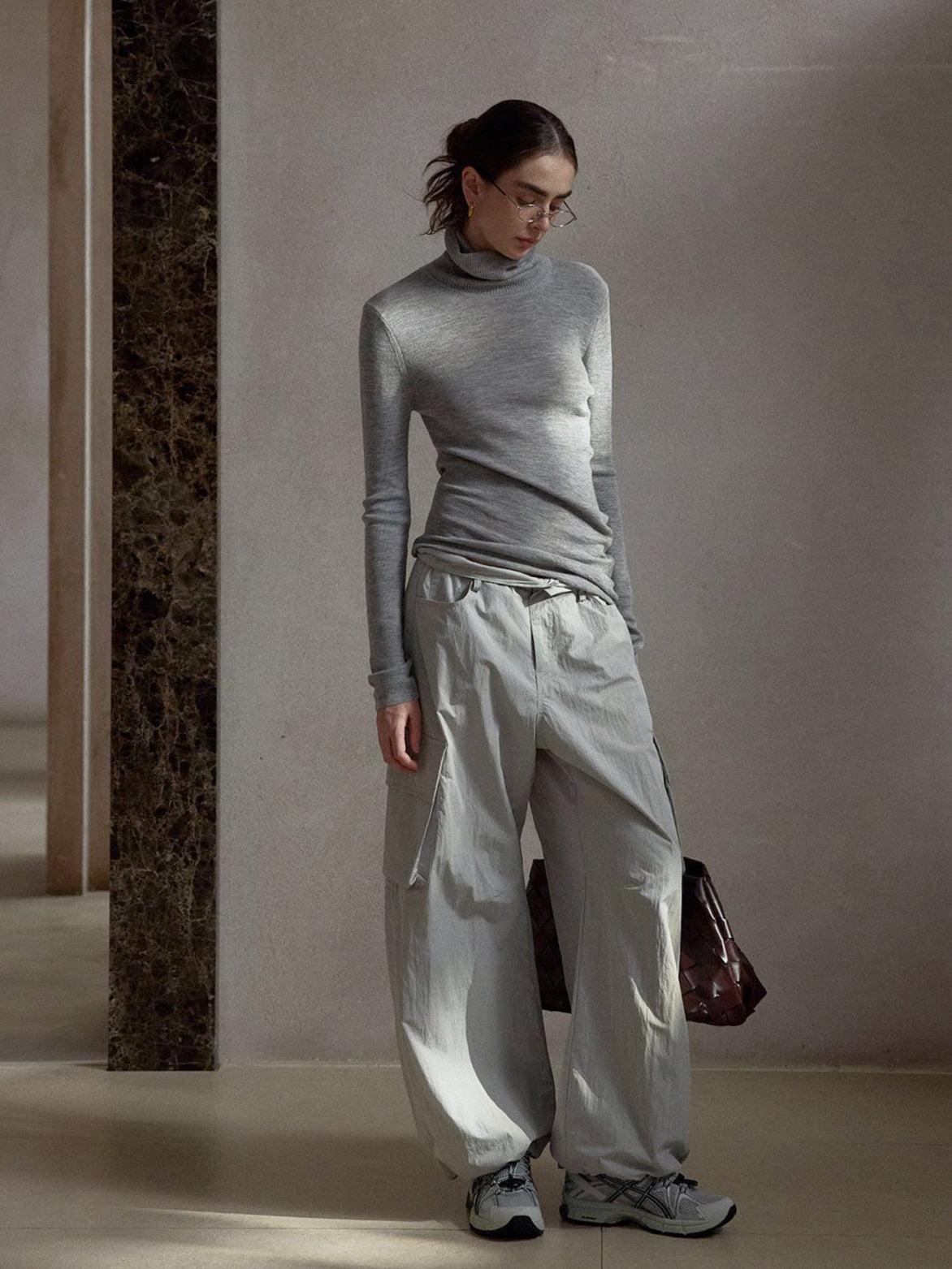 ボリュームのあるレッグラインがスタイリングに存在感を与えつつ、落ち感のある素材使いで都会的な印象に昇華。