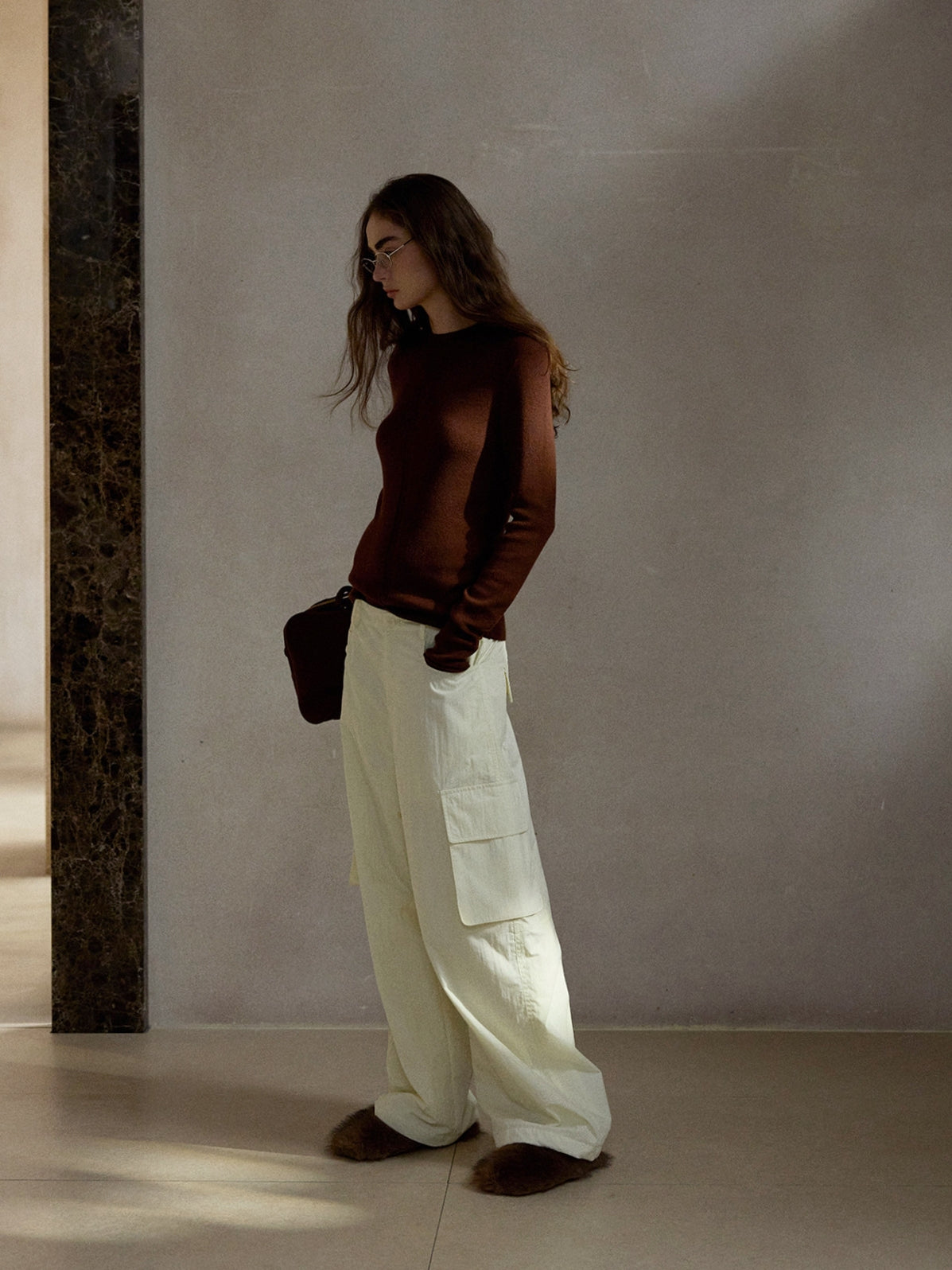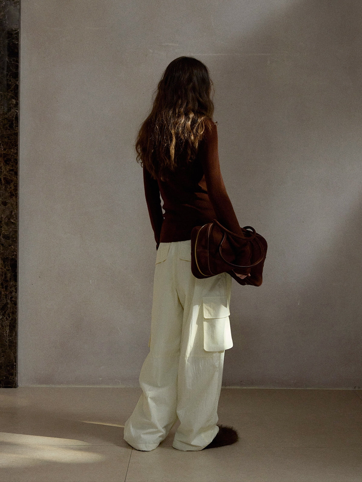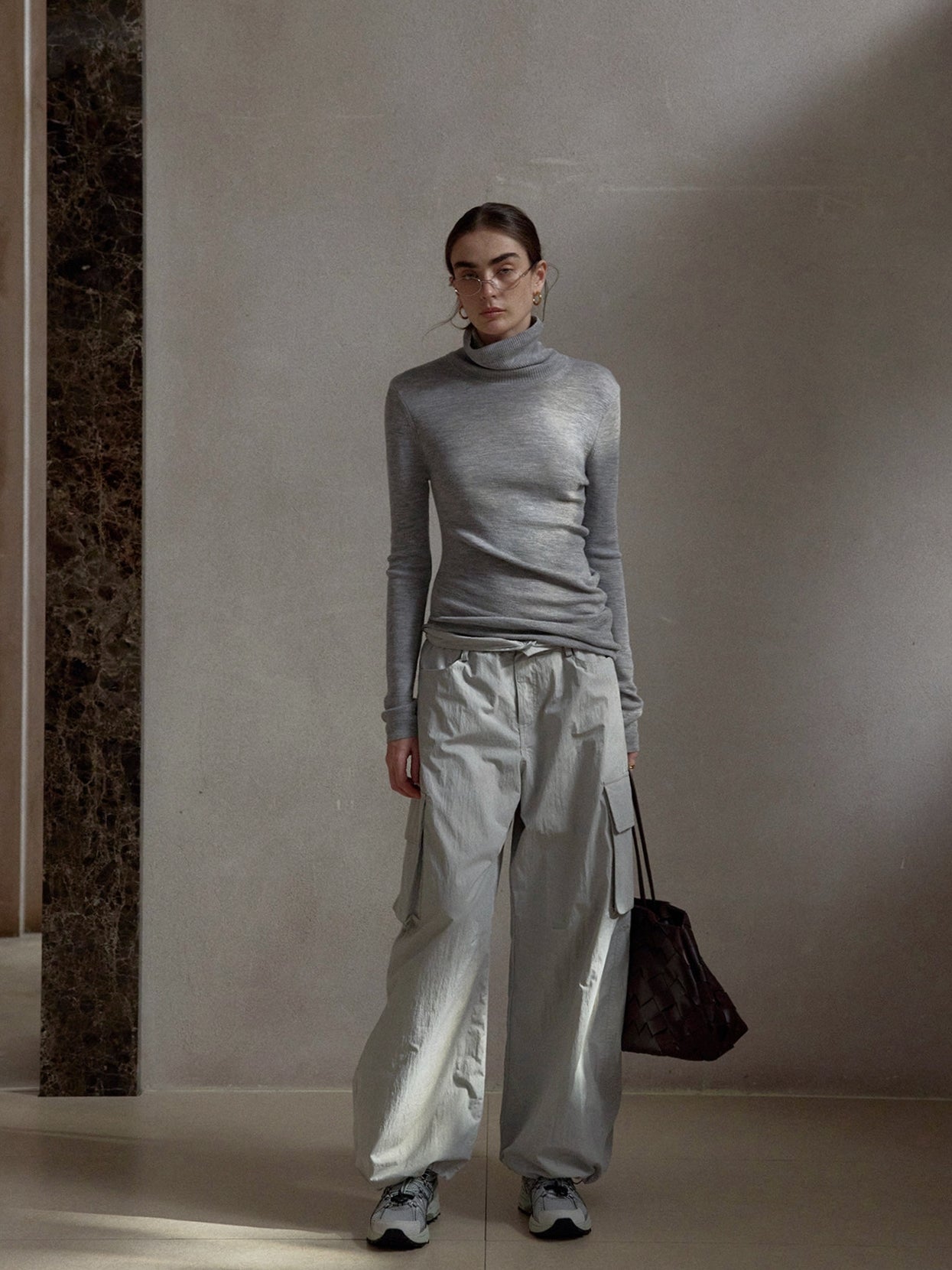 ボリュームのあるレッグラインがスタイリングに存在感を与えつつ、落ち感のある素材使いで都会的な印象に昇華。