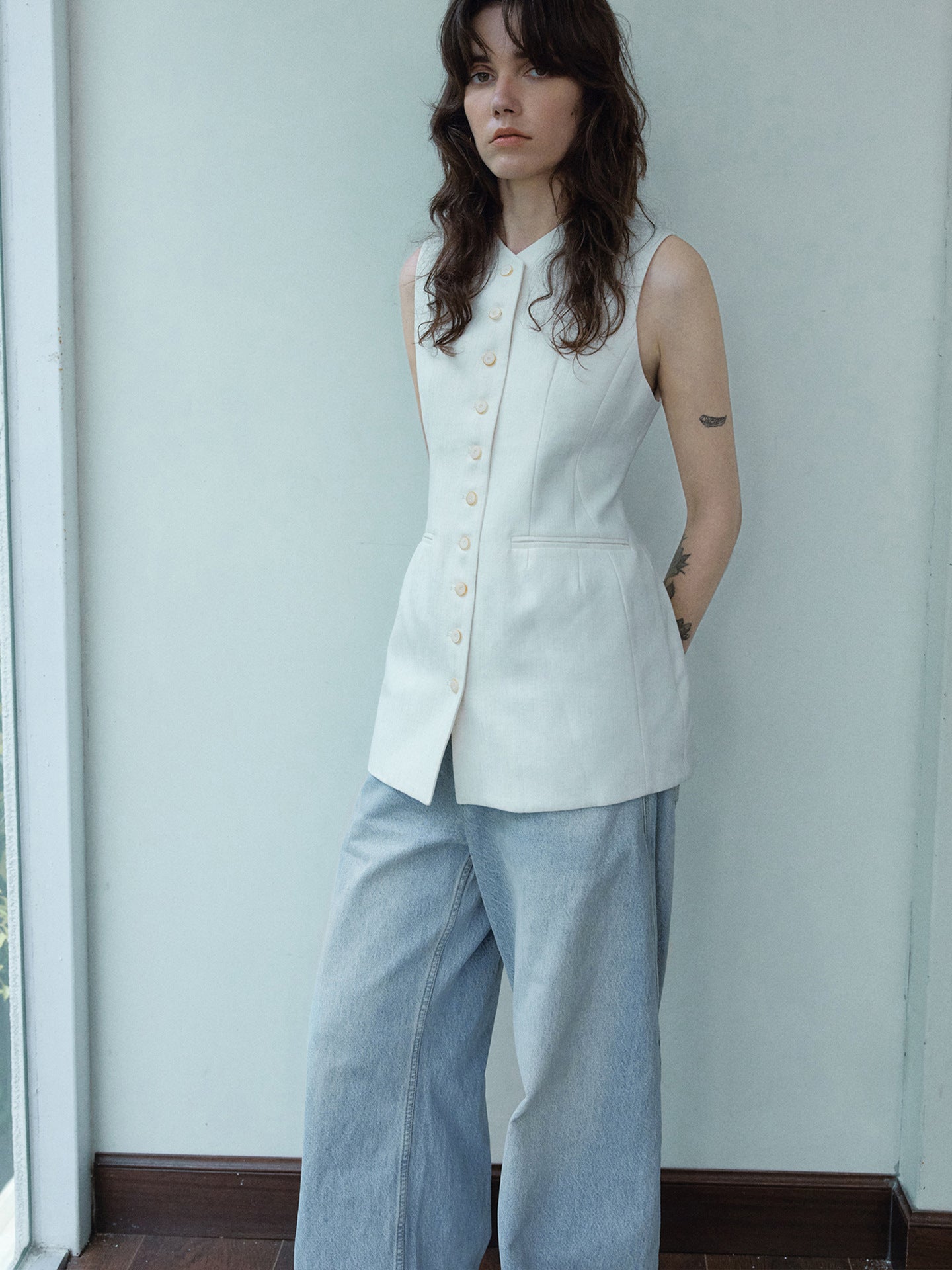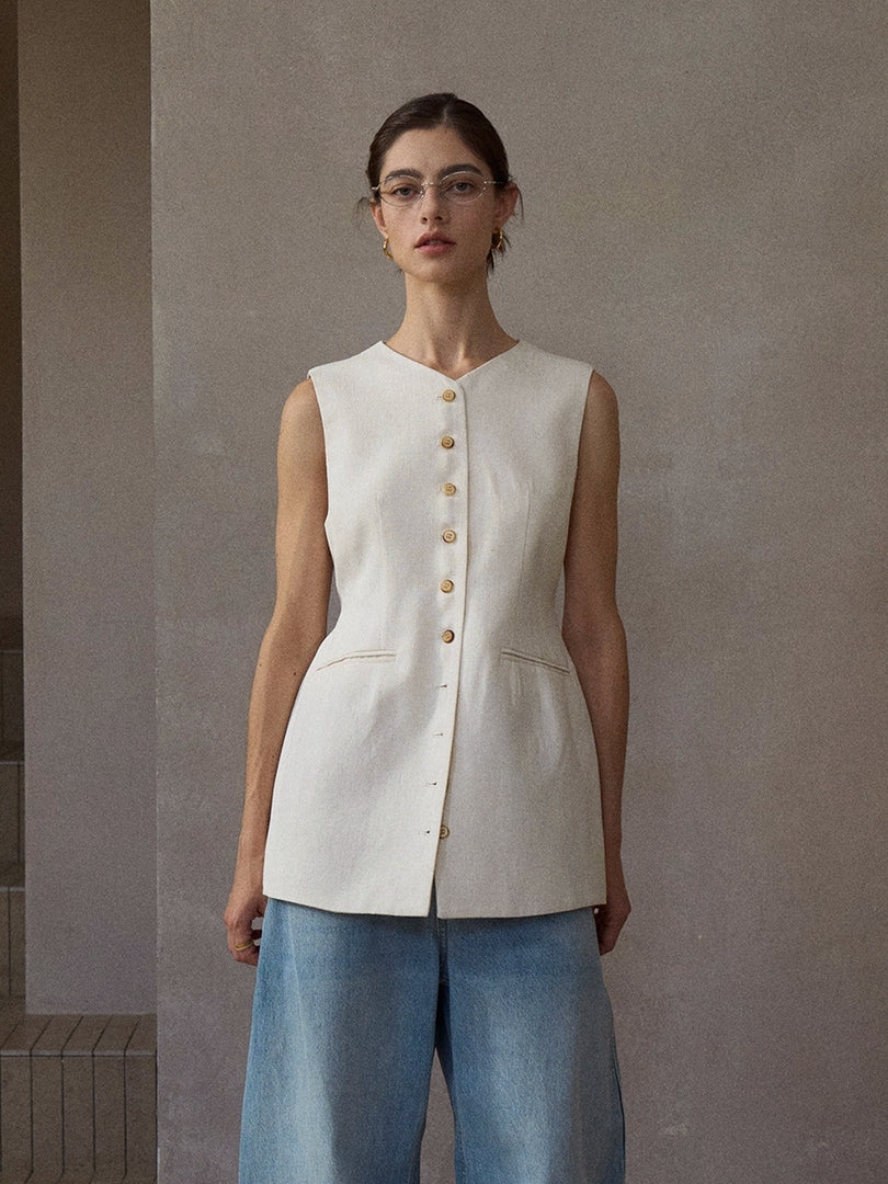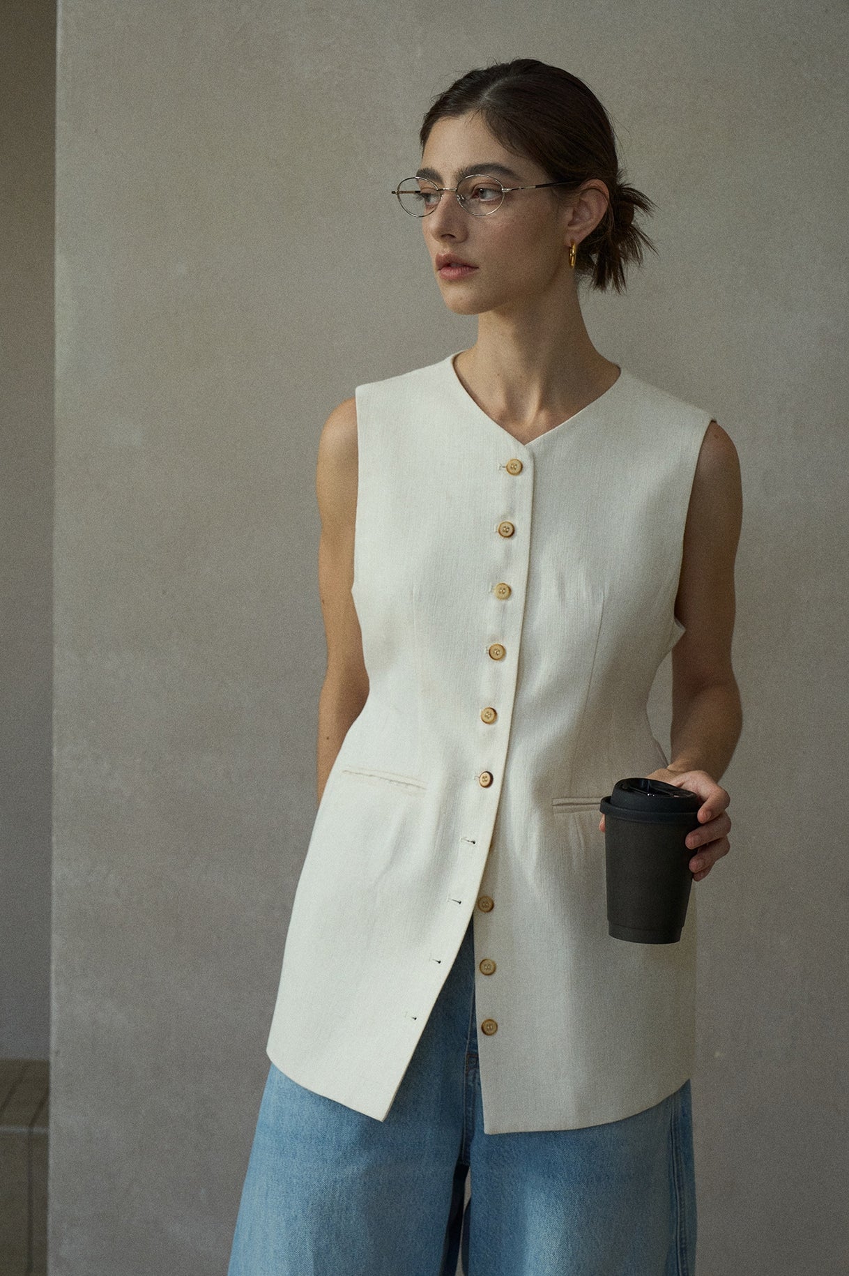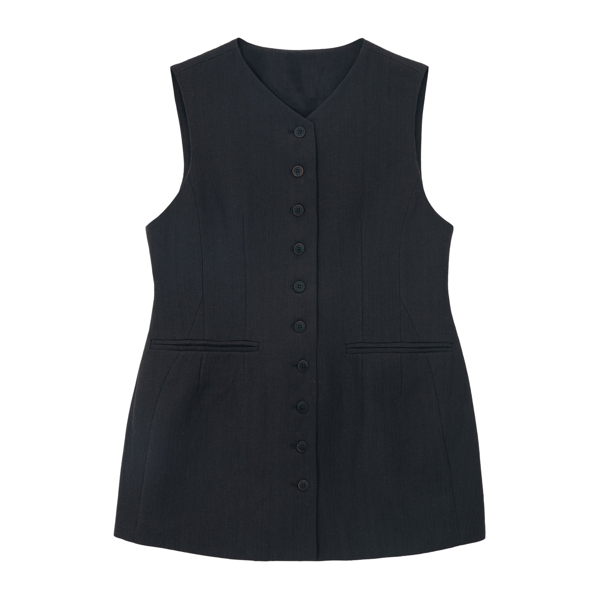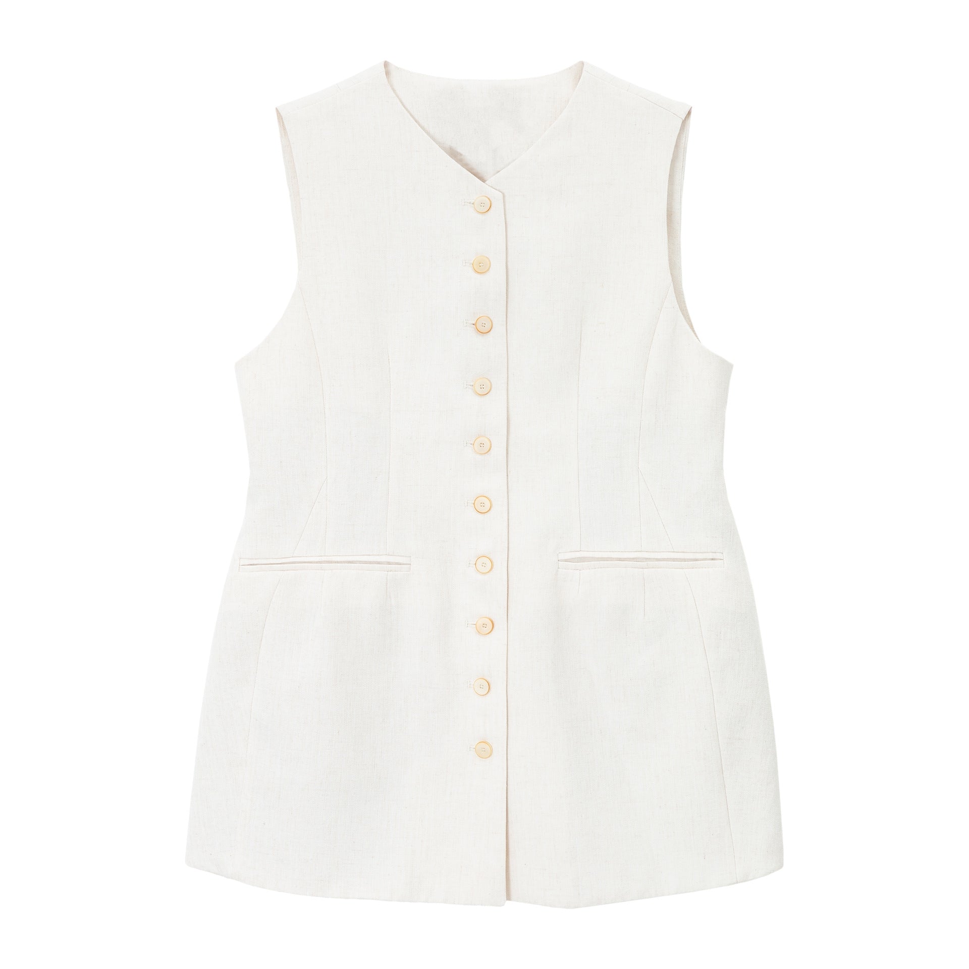 すっきりとウエストに沿うラインシルエットが美しい、リネン混ジレ。