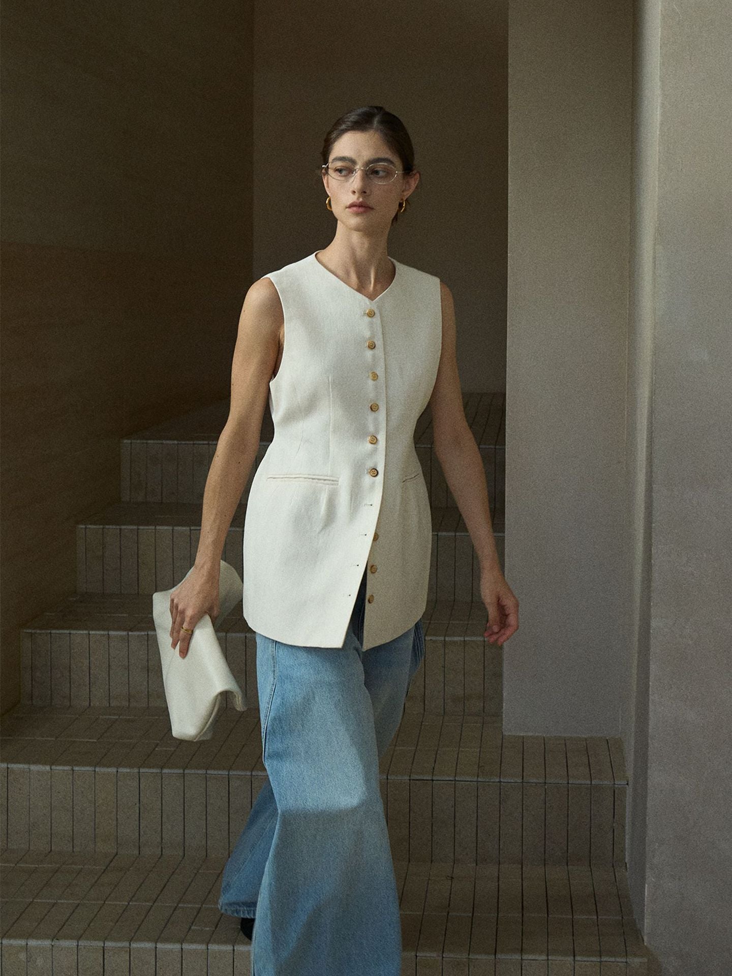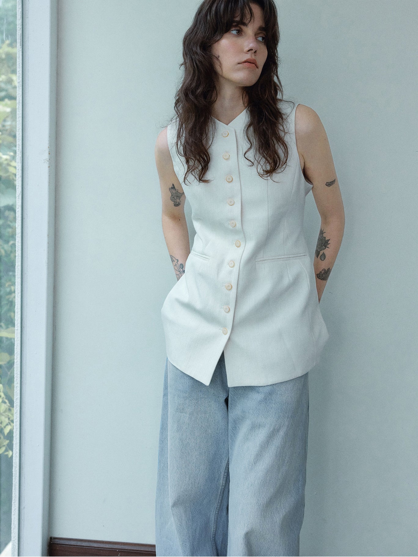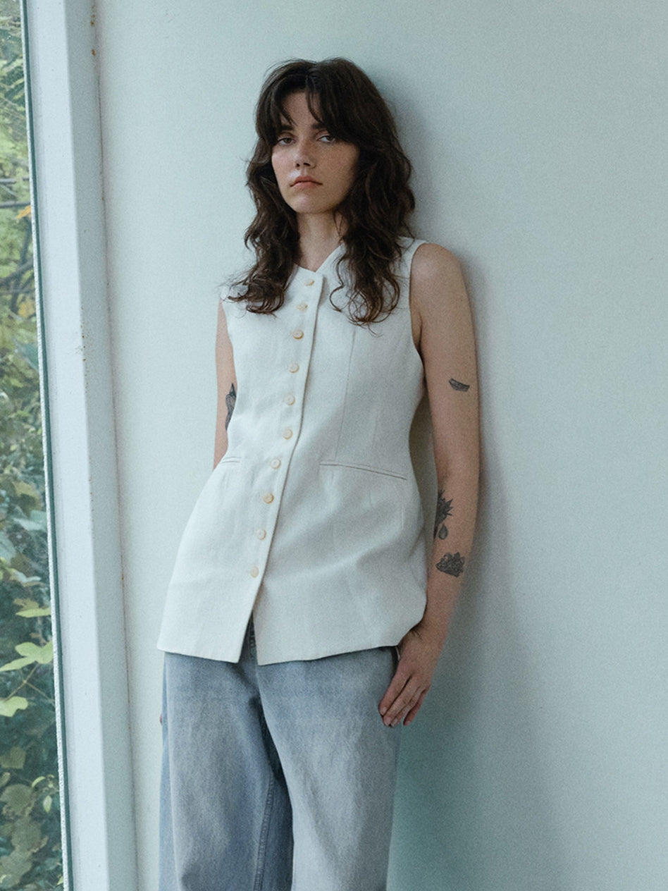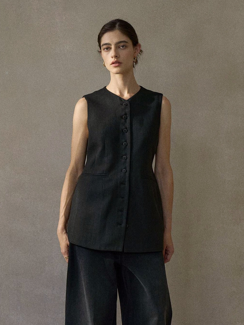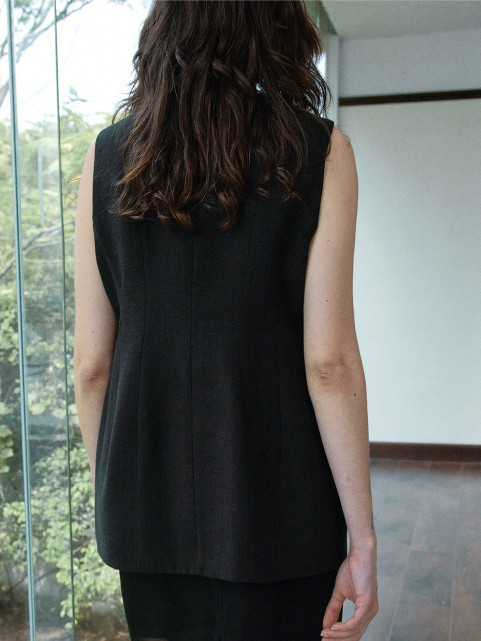 すっきりとウエストに沿うラインシルエットが美しい、リネン混ジレ。