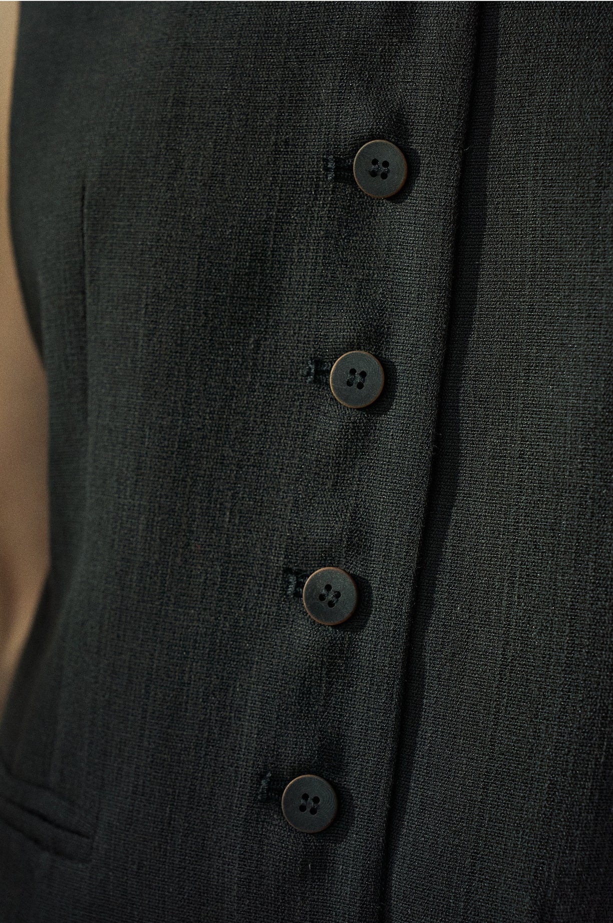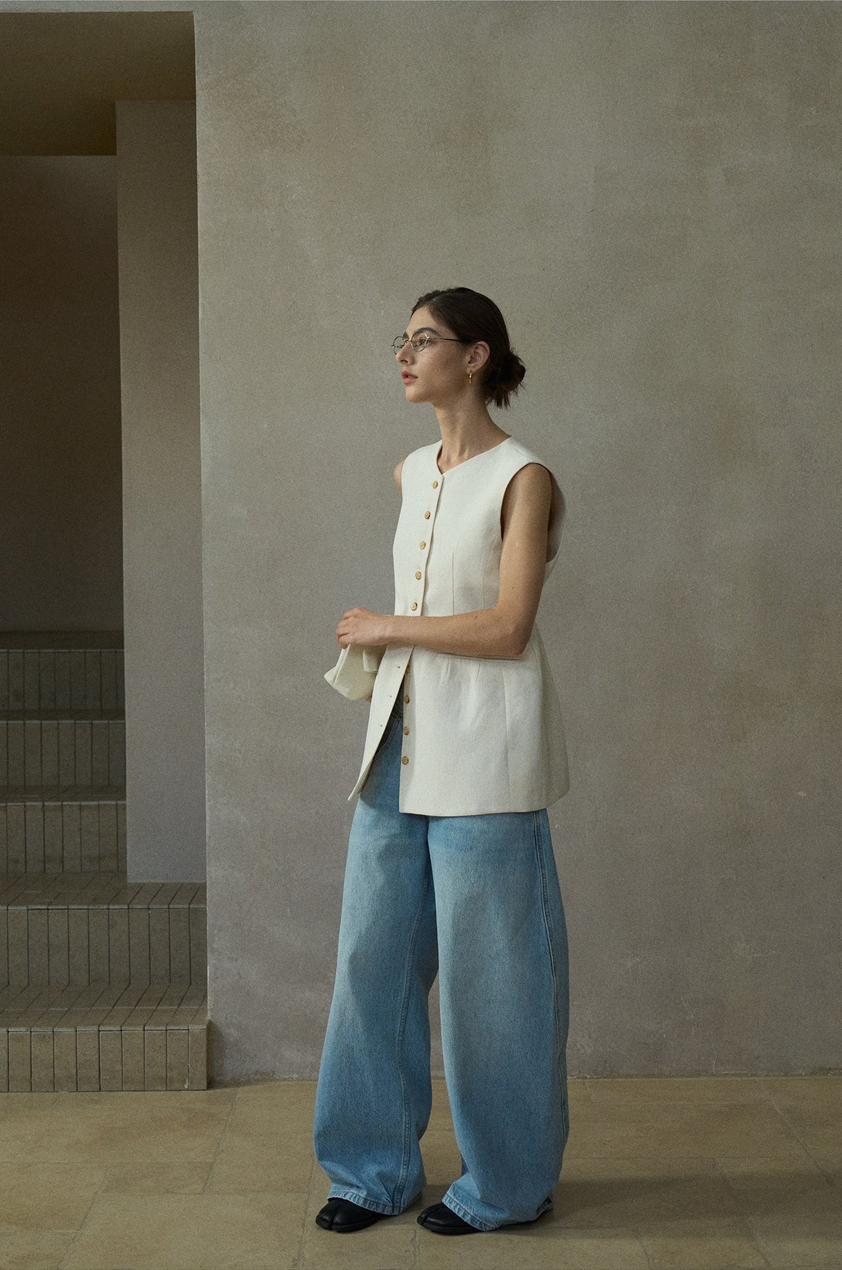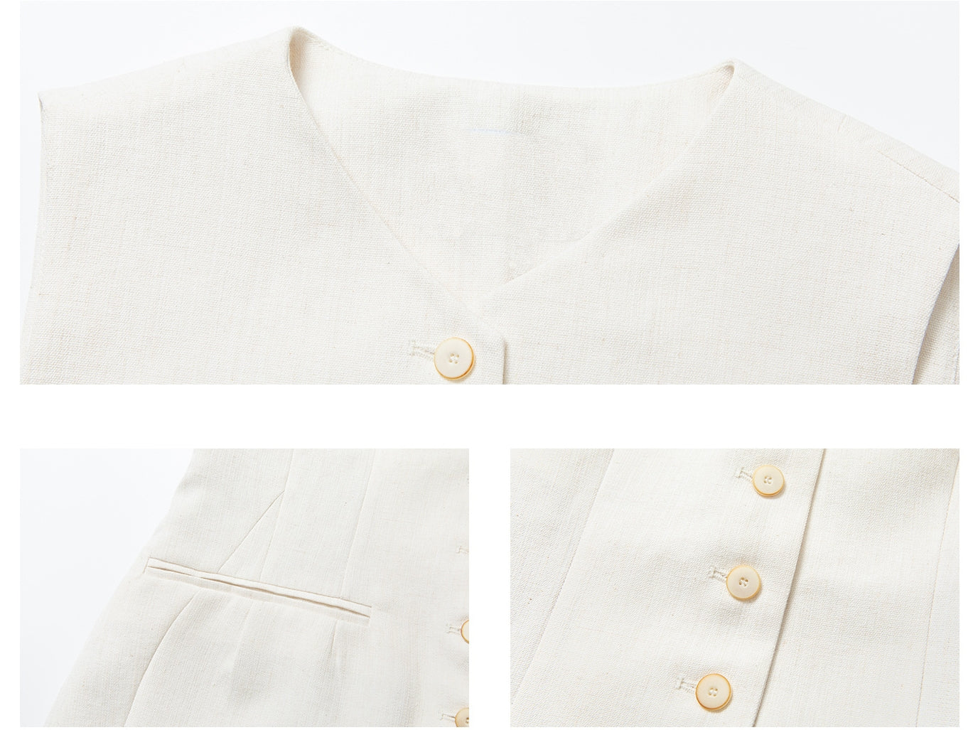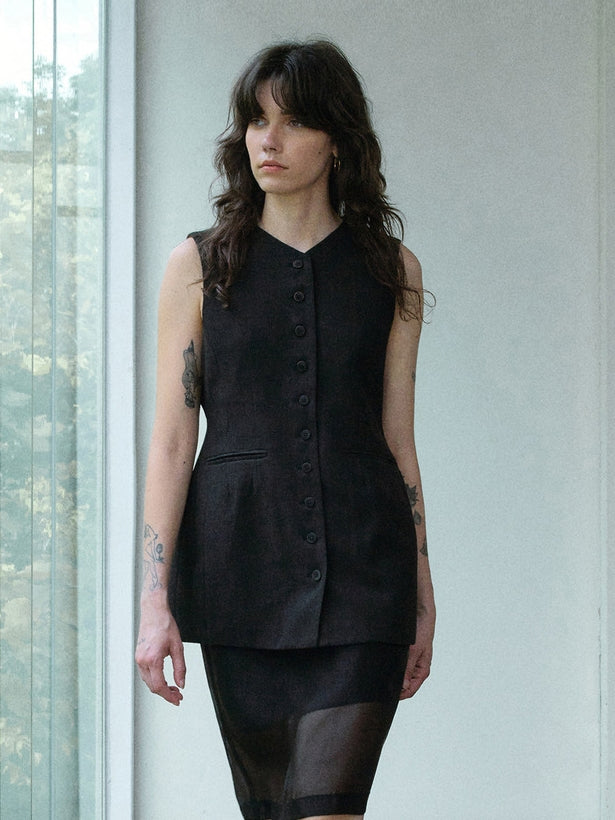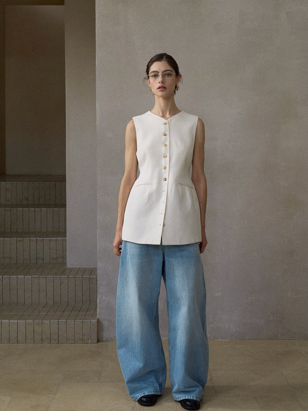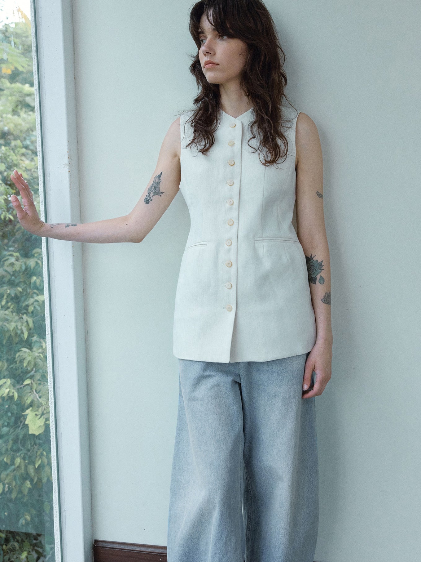 すっきりとウエストに沿うラインシルエットが美しい、リネン混ジレ。