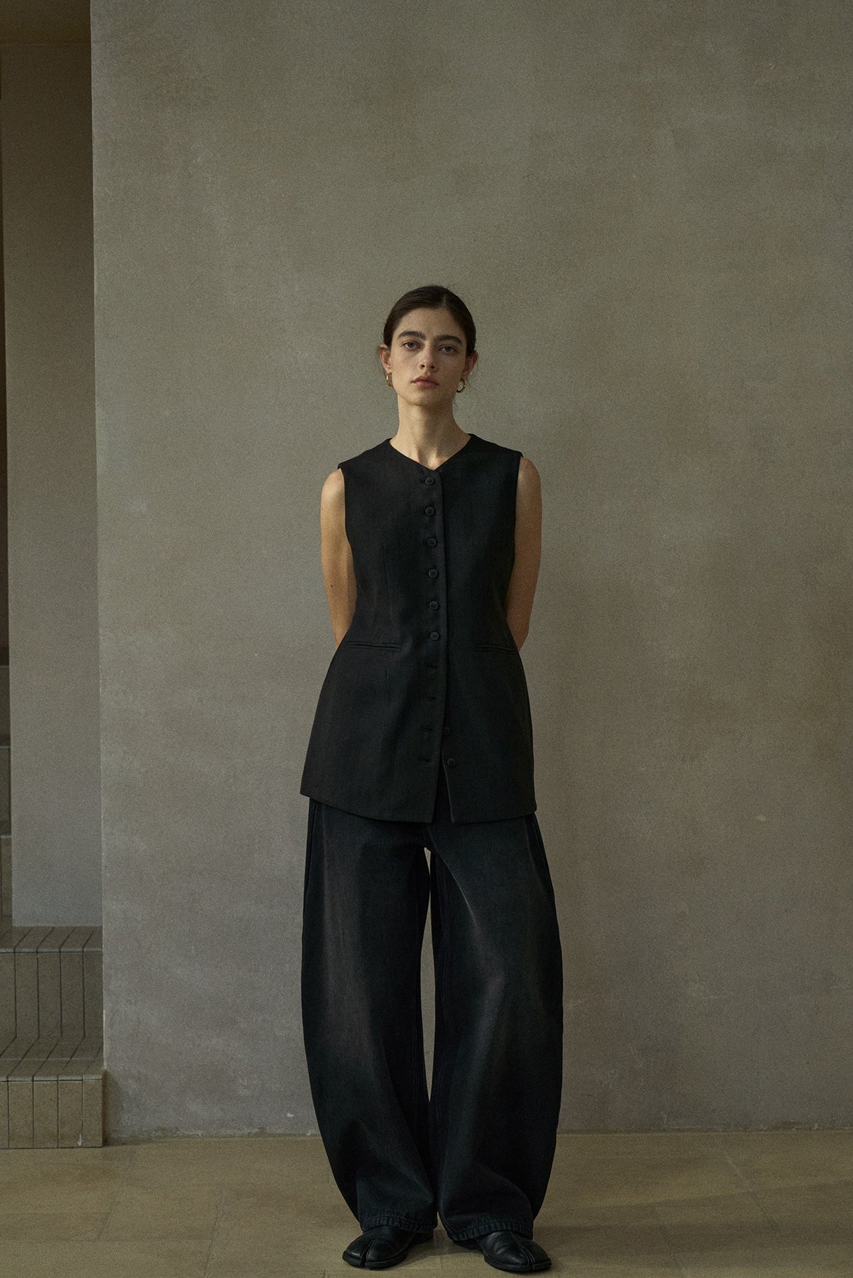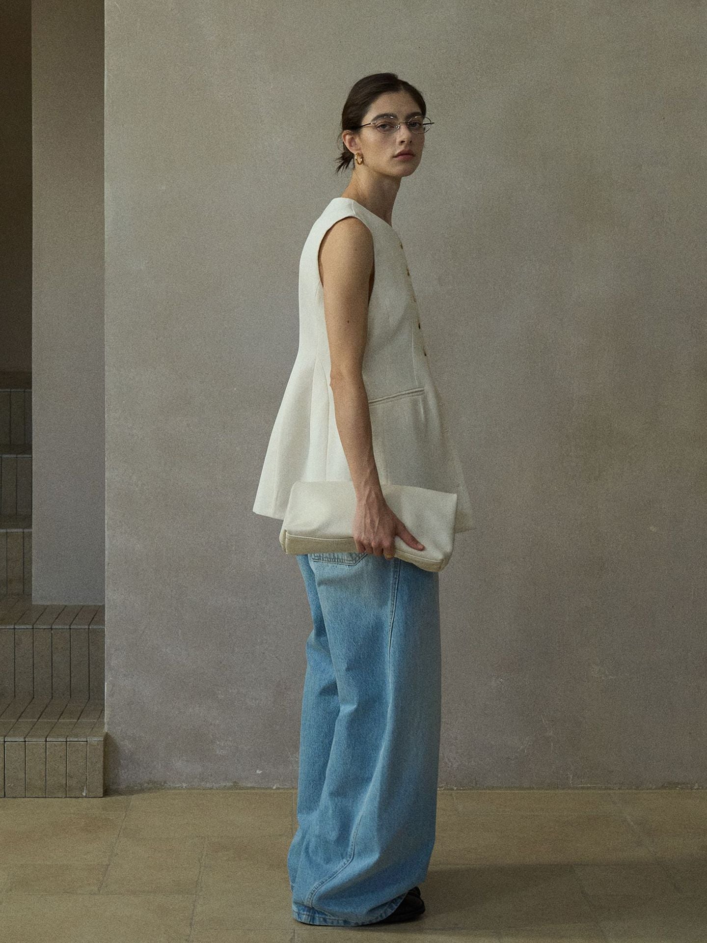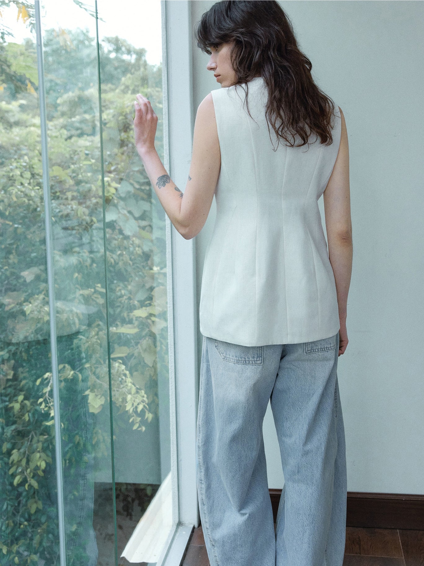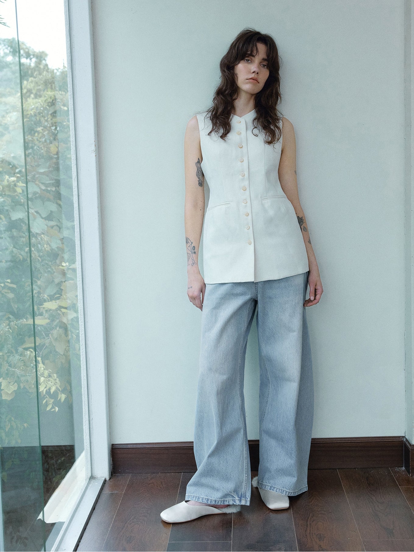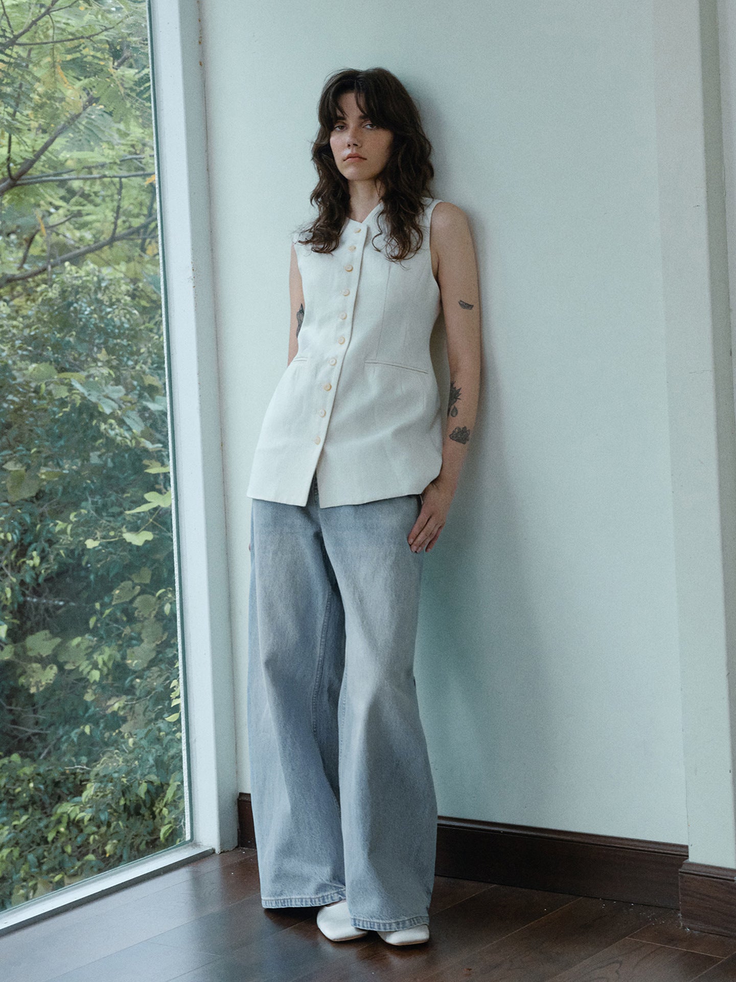 すっきりとウエストに沿うラインシルエットが美しい、リネン混ジレ。