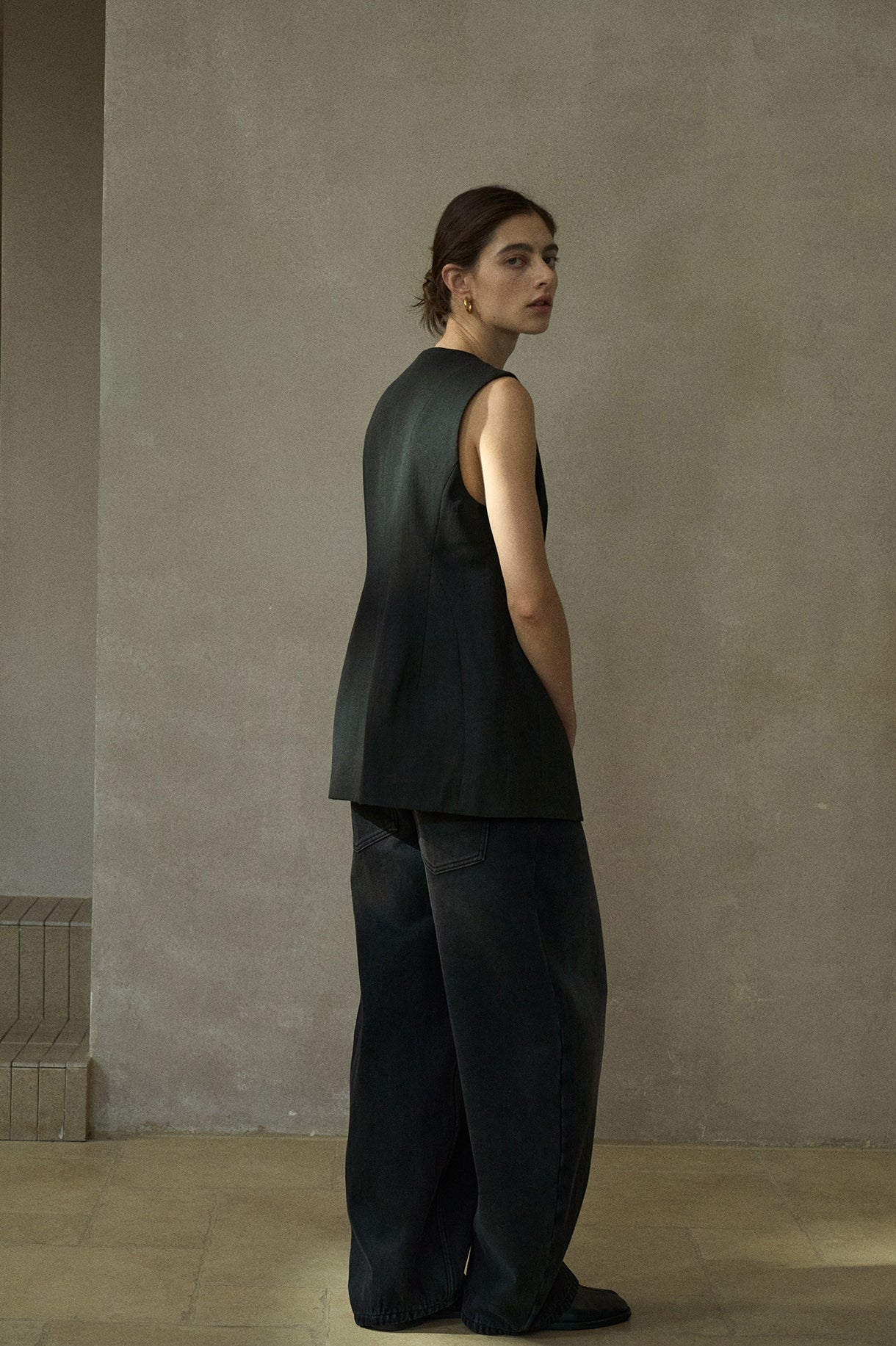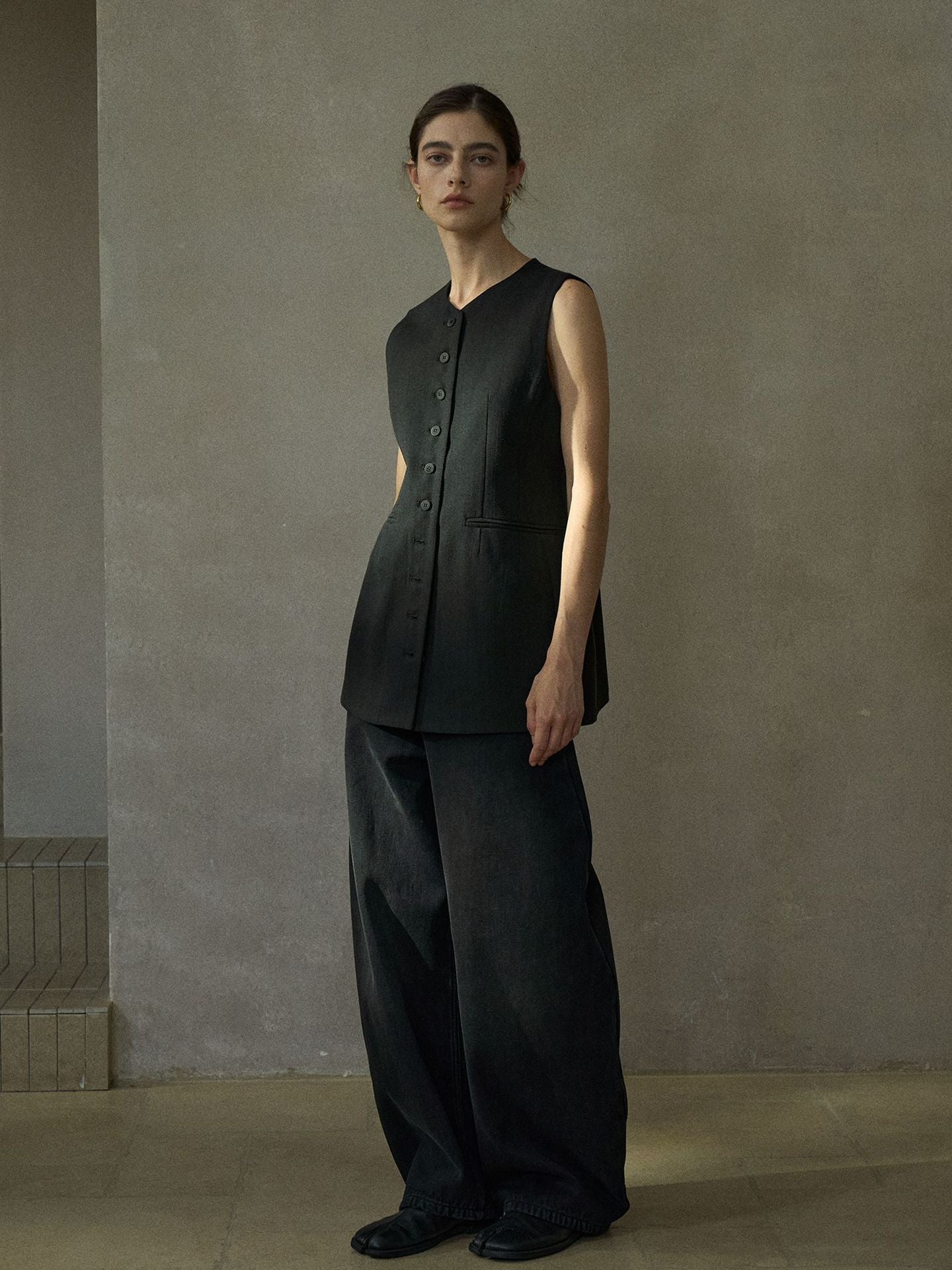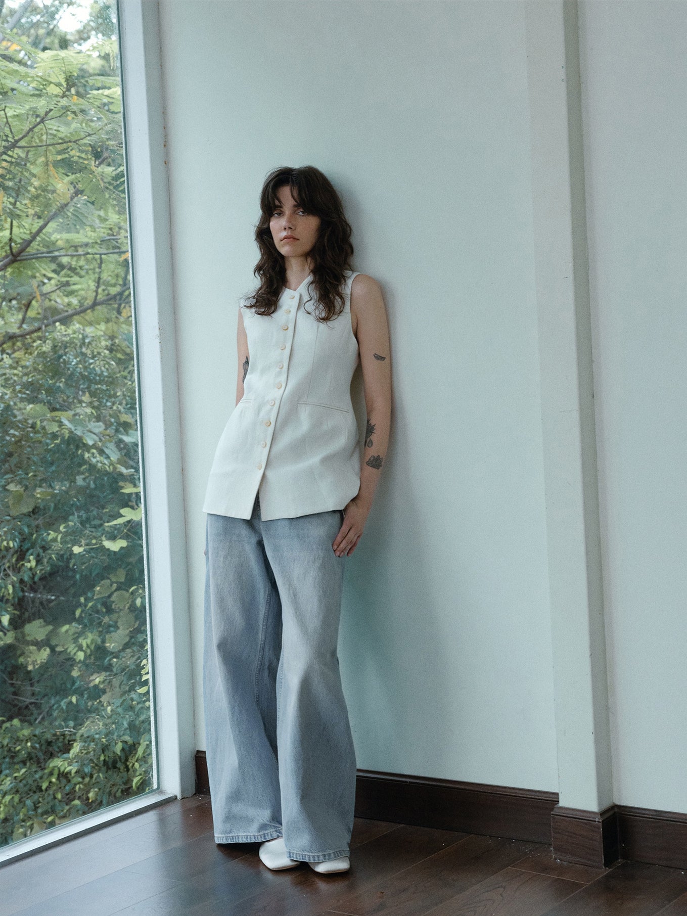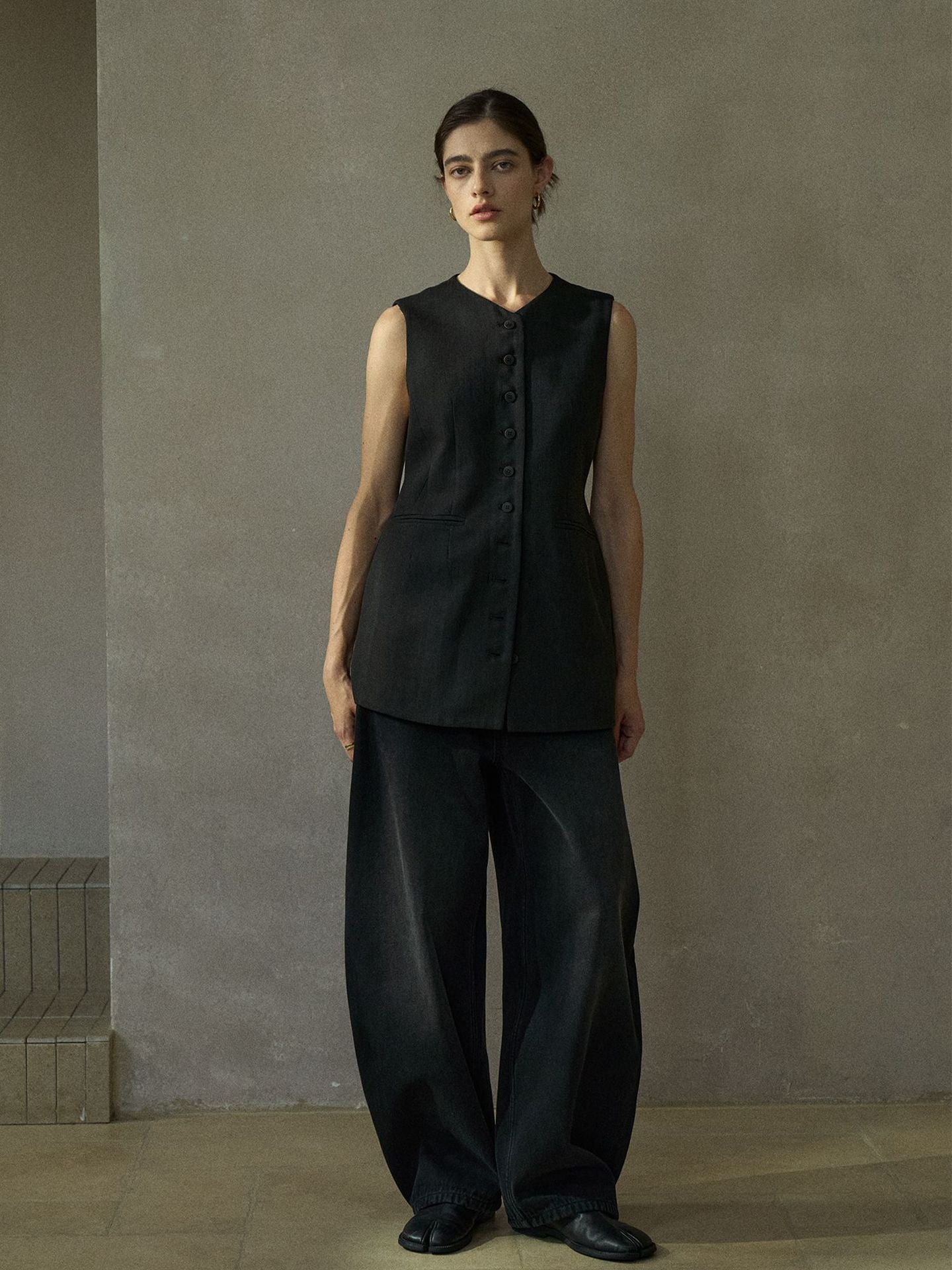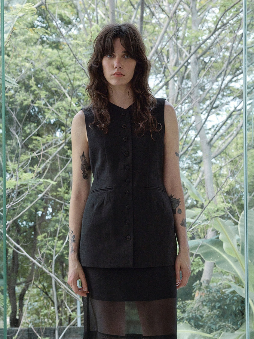すっきりとウエストに沿うラインシルエットが美しい、リネン混ジレ。