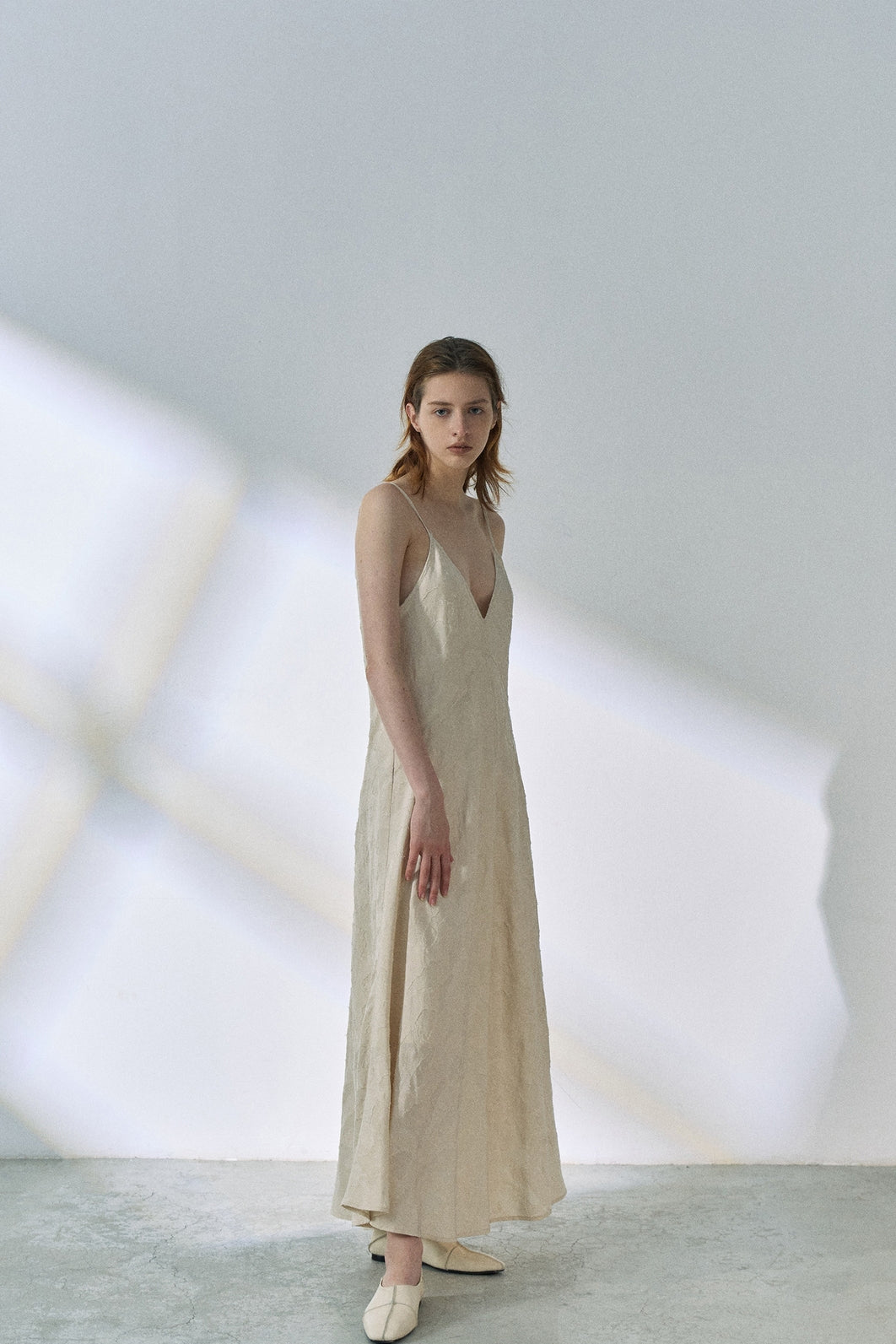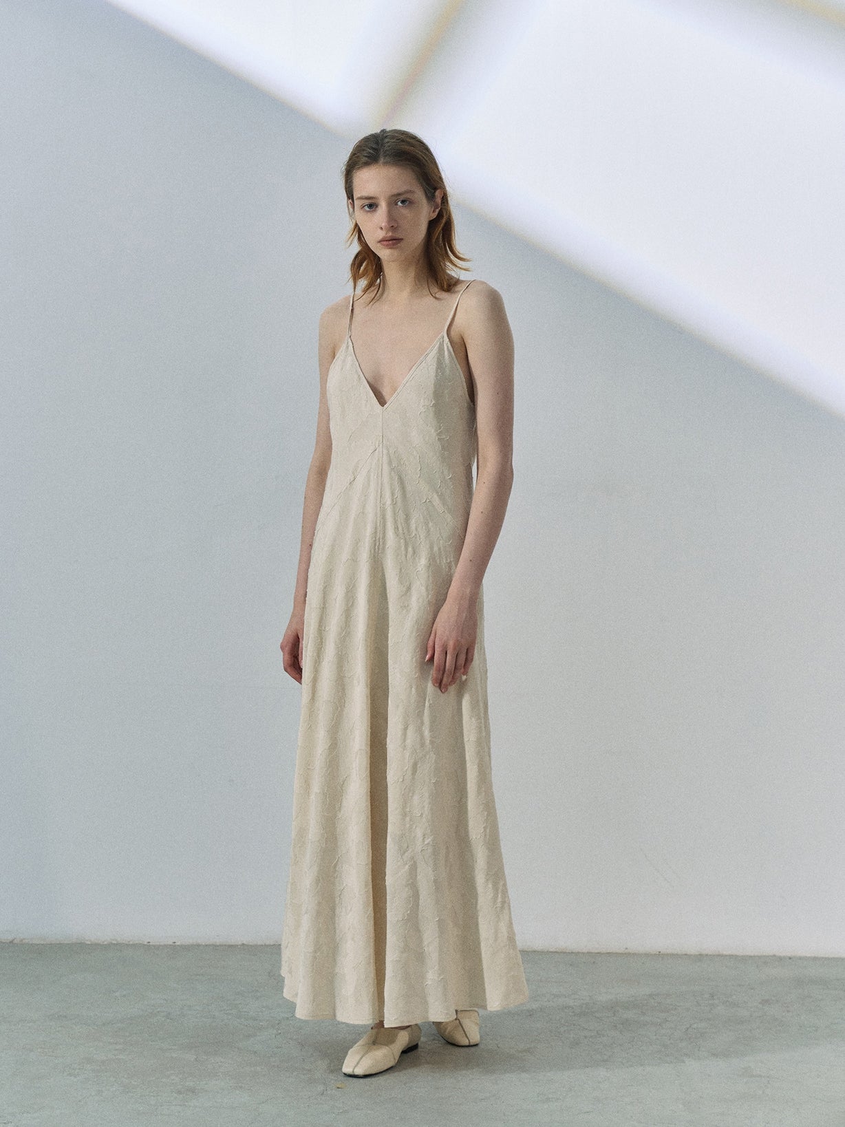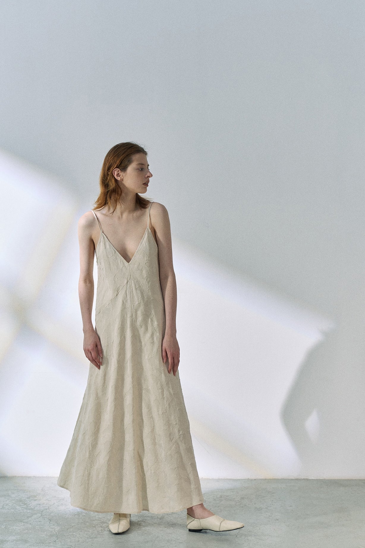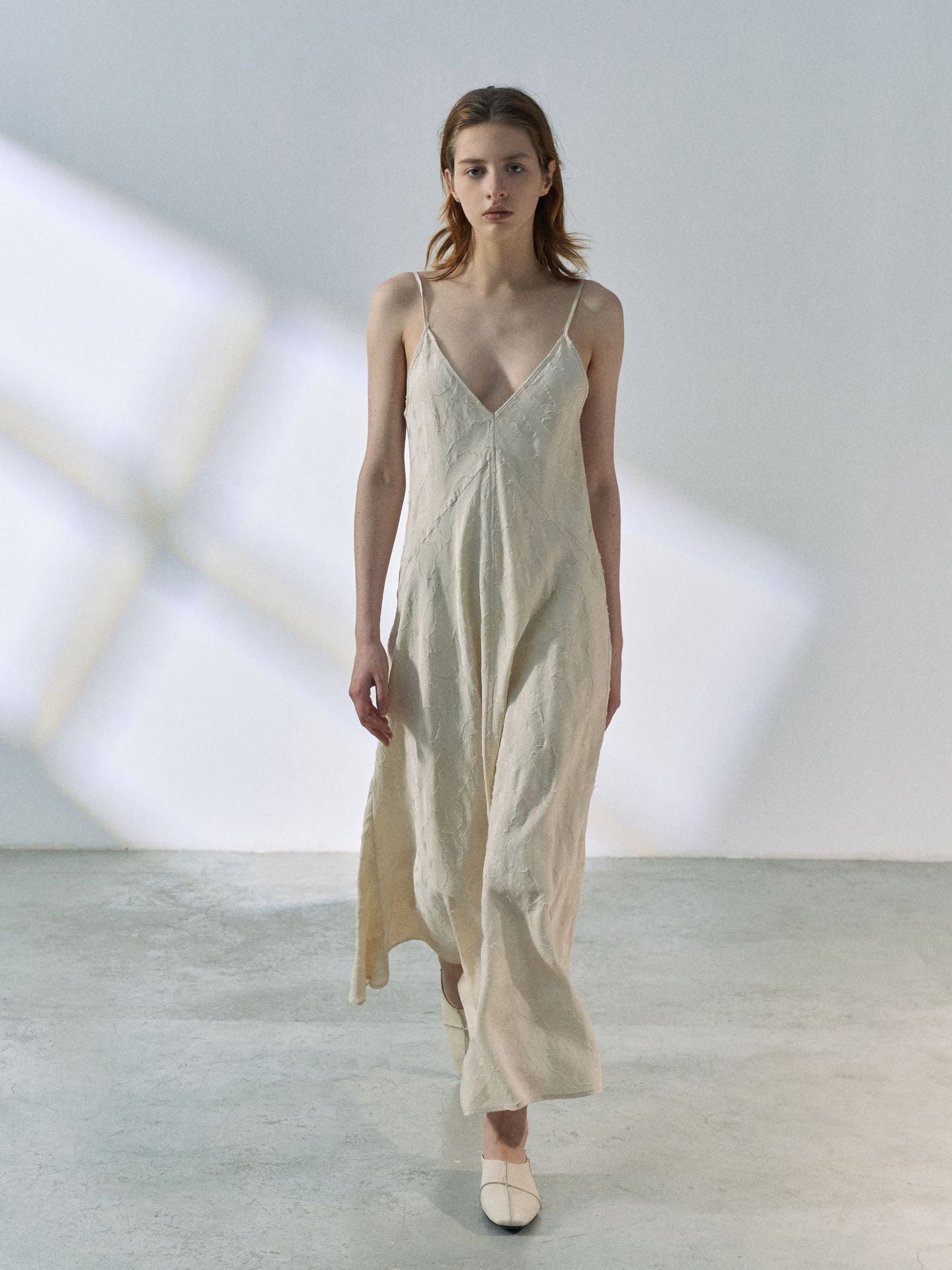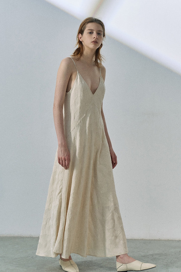 華やかさとカジュアルを兼ね備えたリネン混のジャガードVネックキャミワンピース。