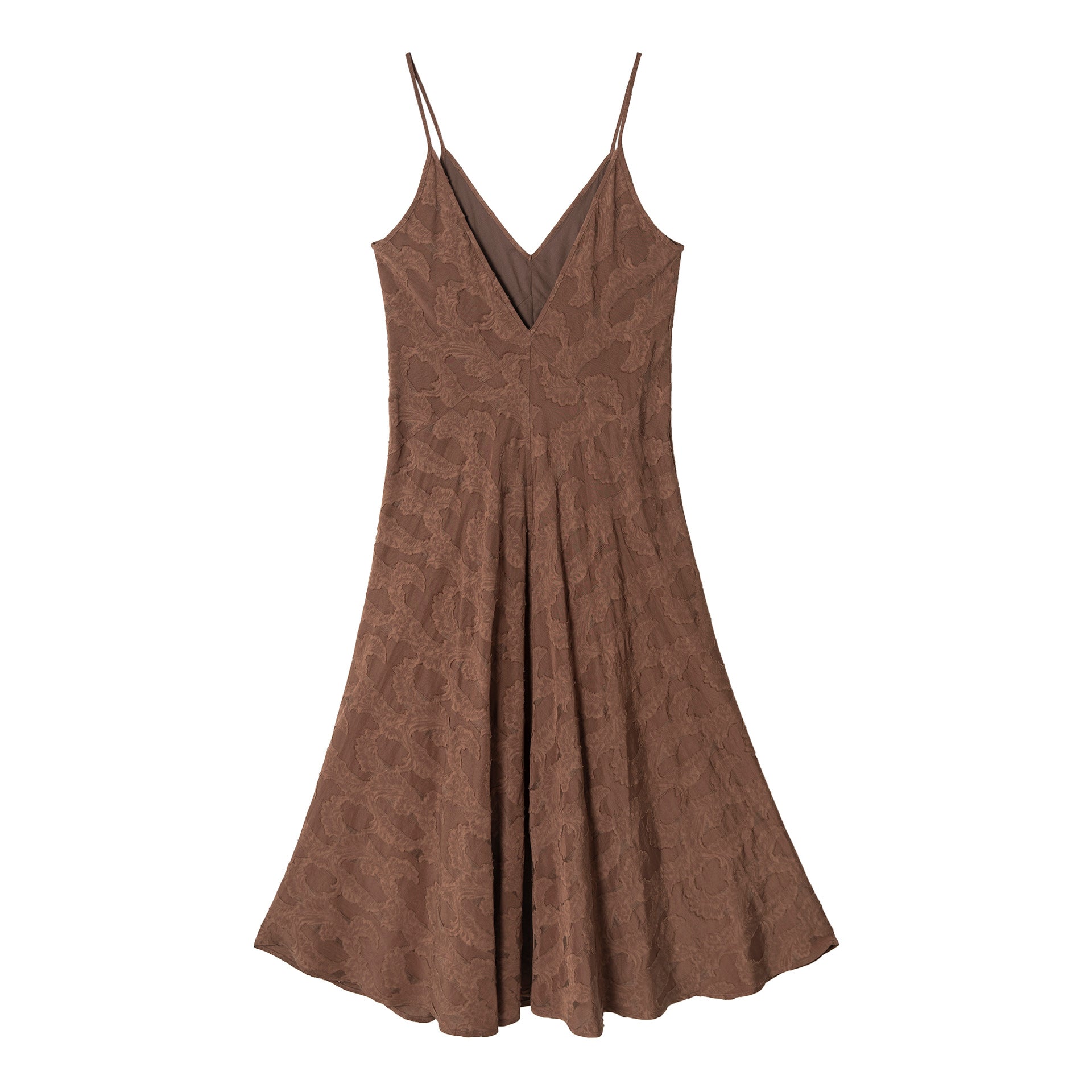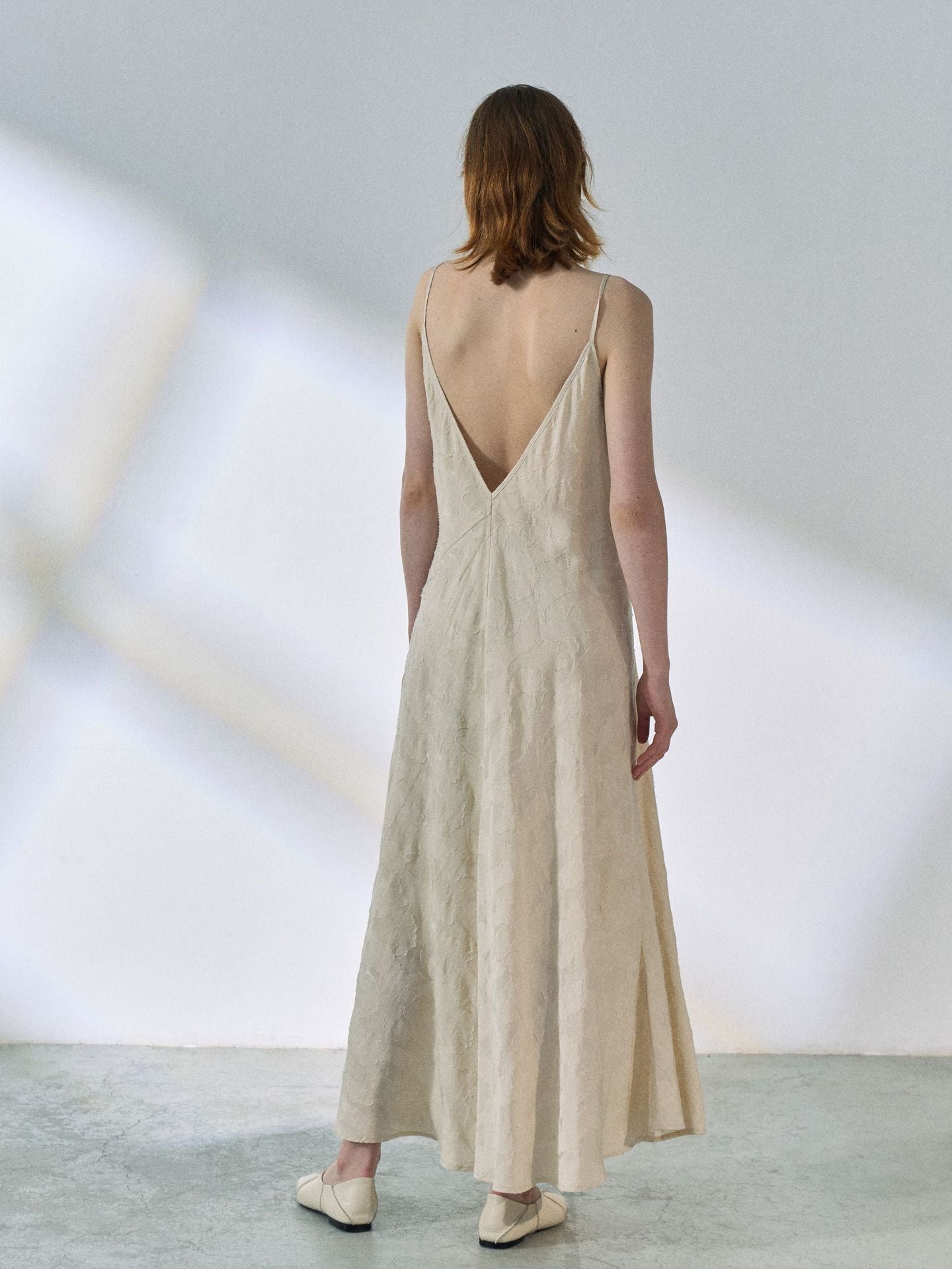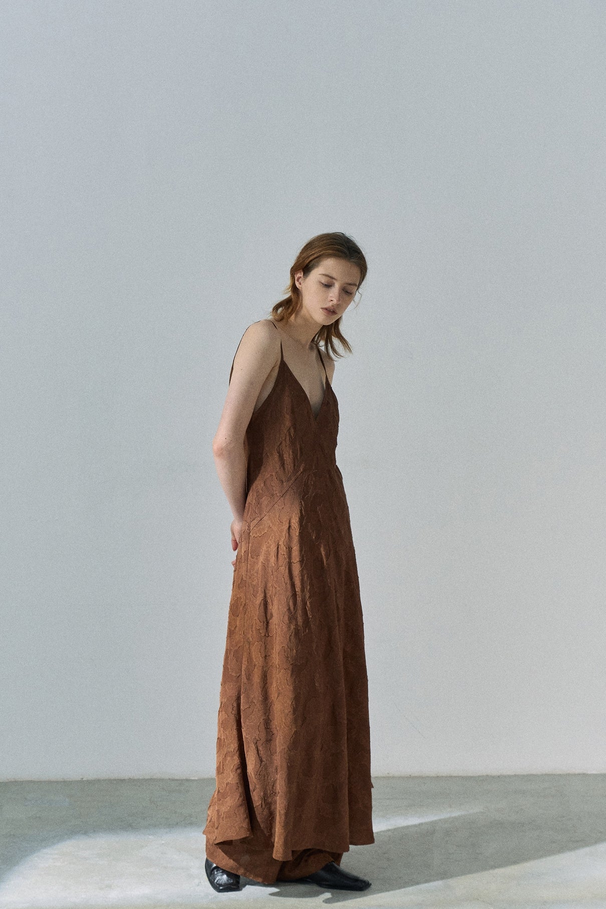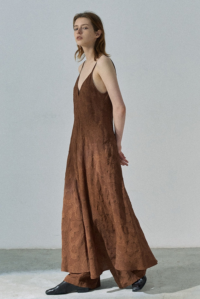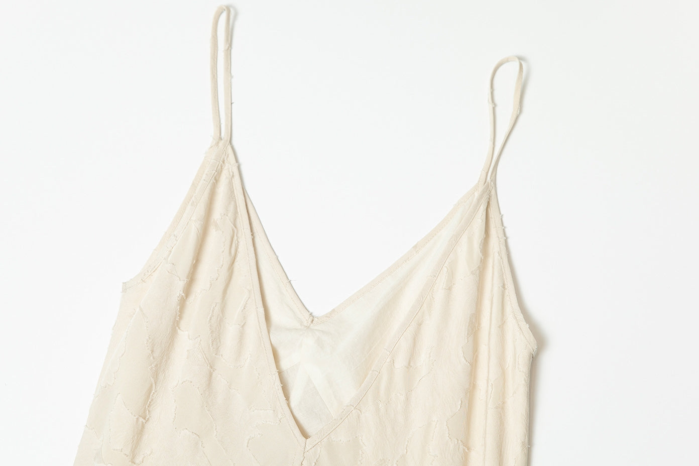 華やかさとカジュアルを兼ね備えたリネン混のジャガードVネックキャミワンピース。