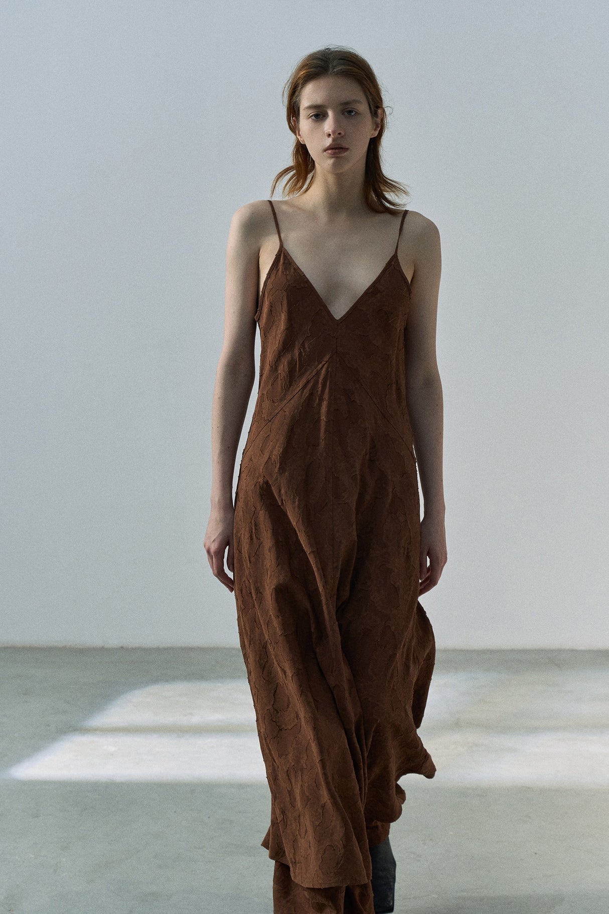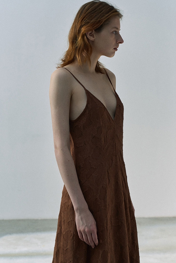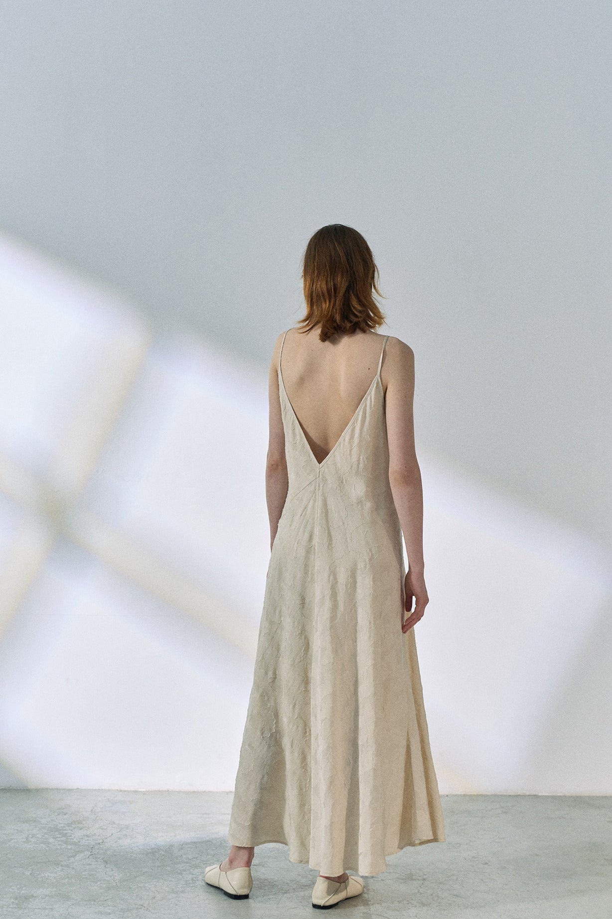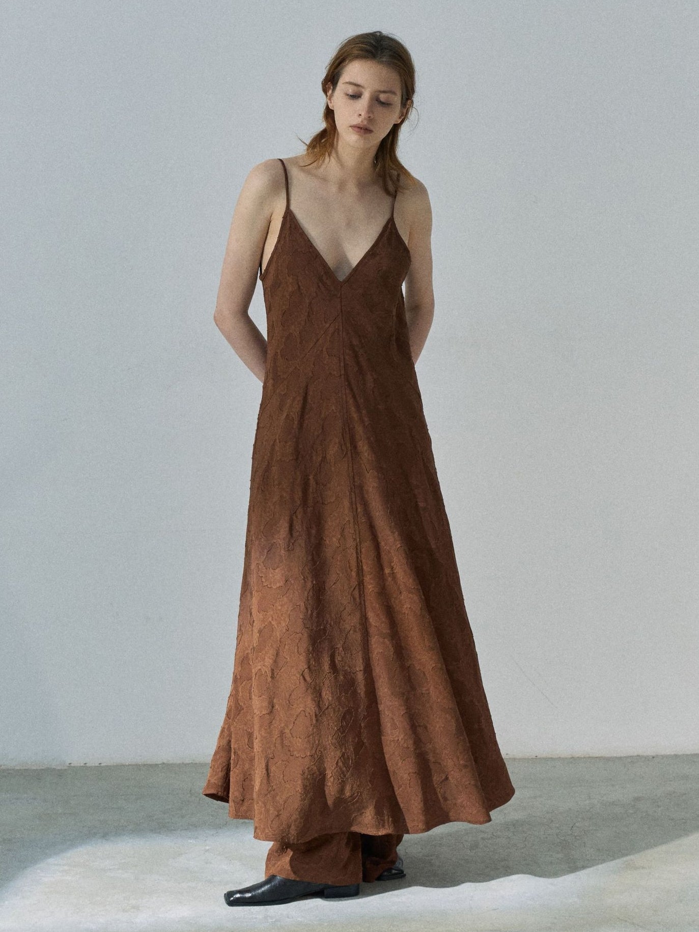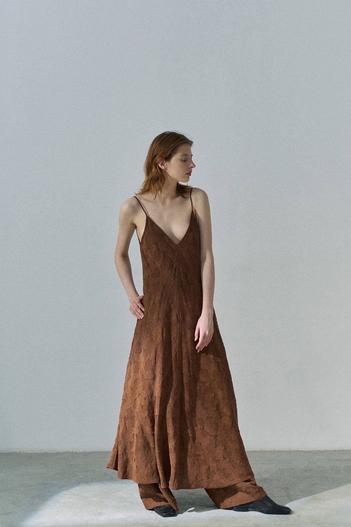 華やかさとカジュアルを兼ね備えたリネン混のジャガードVネックキャミワンピース。