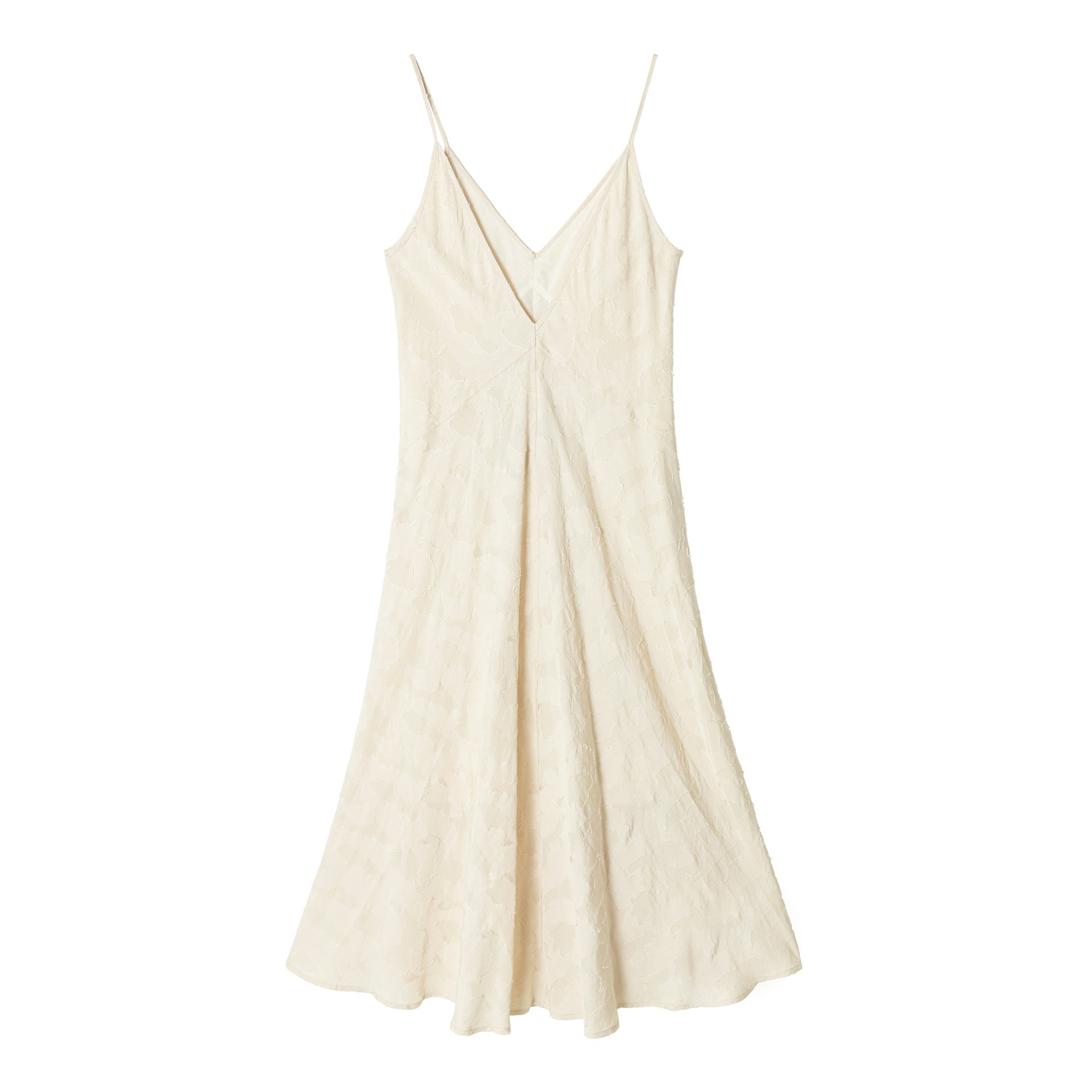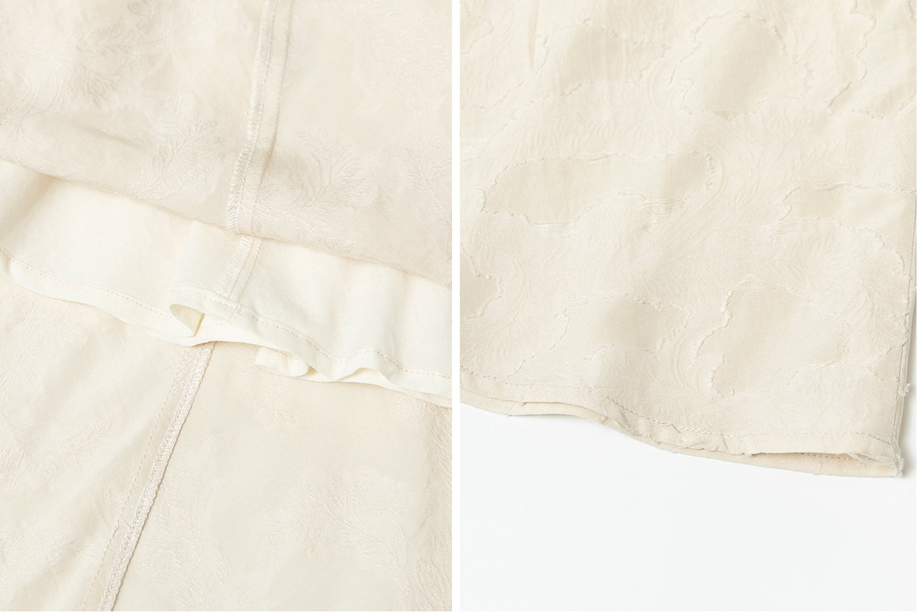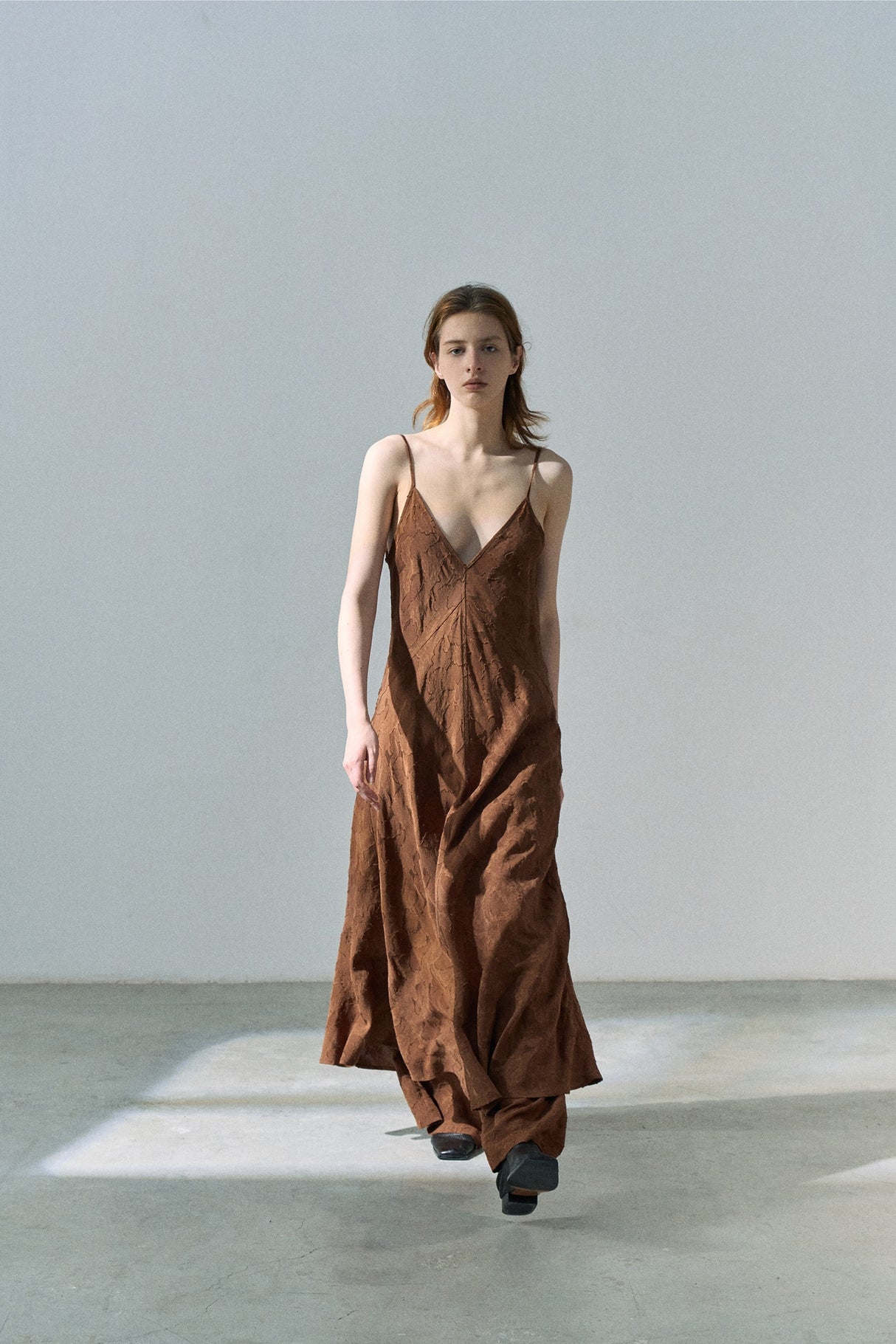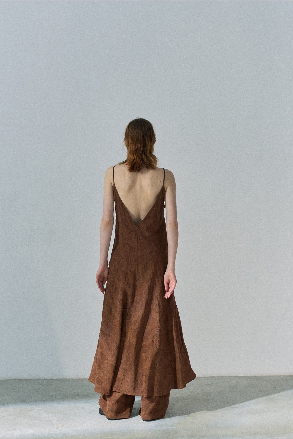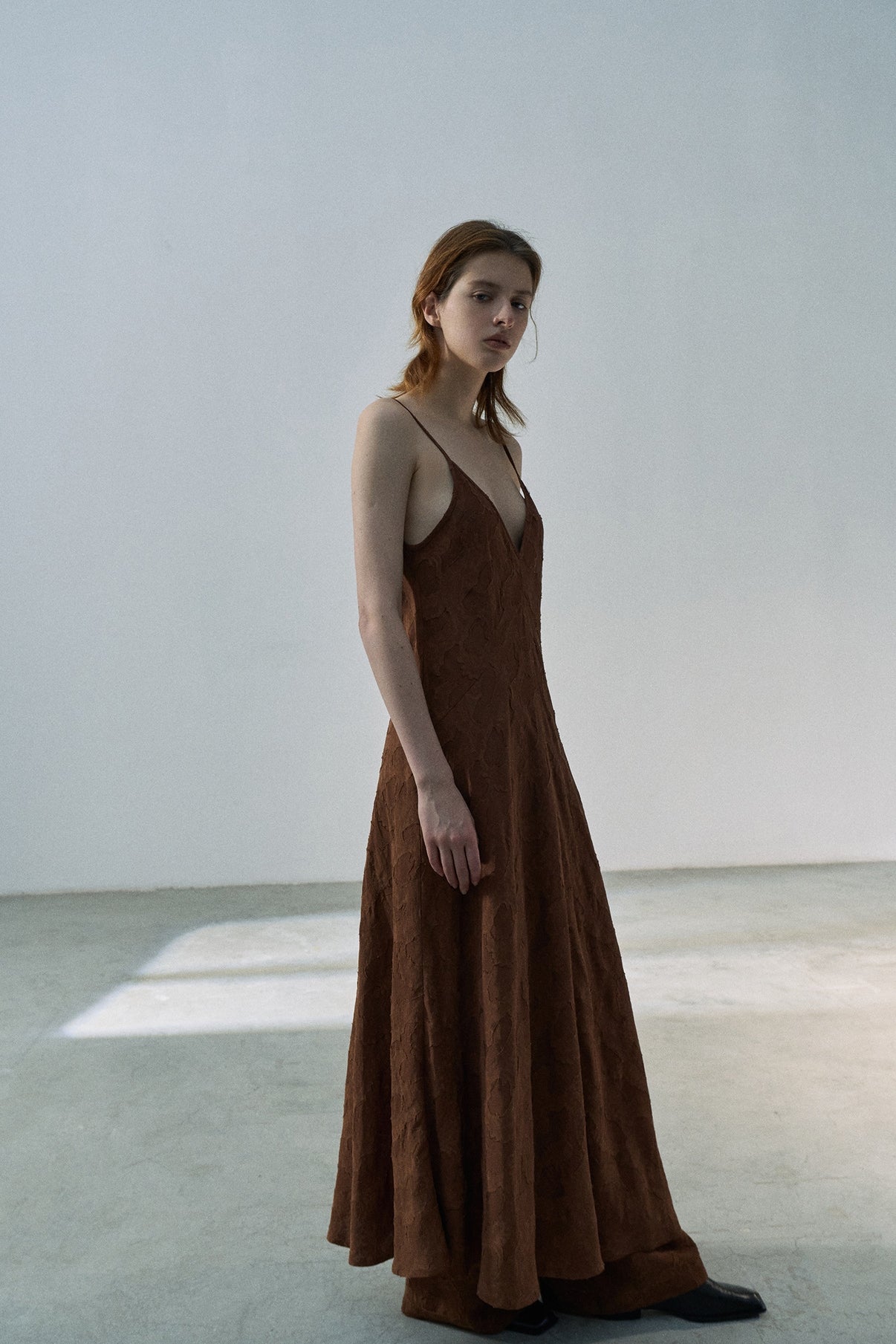 華やかさとカジュアルを兼ね備えたリネン混のジャガードVネックキャミワンピース。