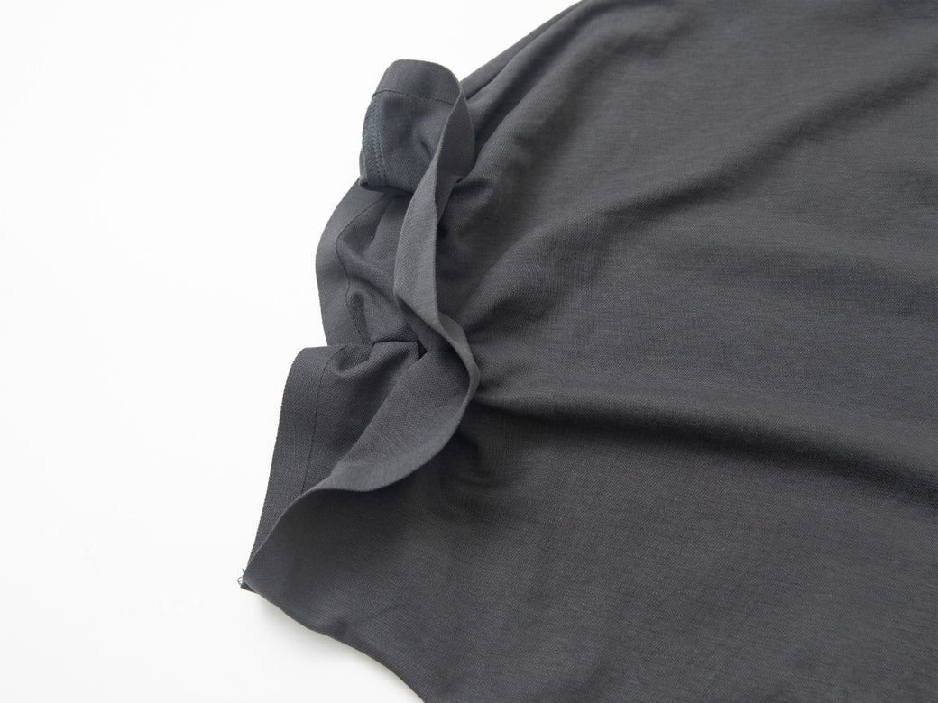肩からゆるやかに落ちるラインに、控えめなフリルを添えた一枚。