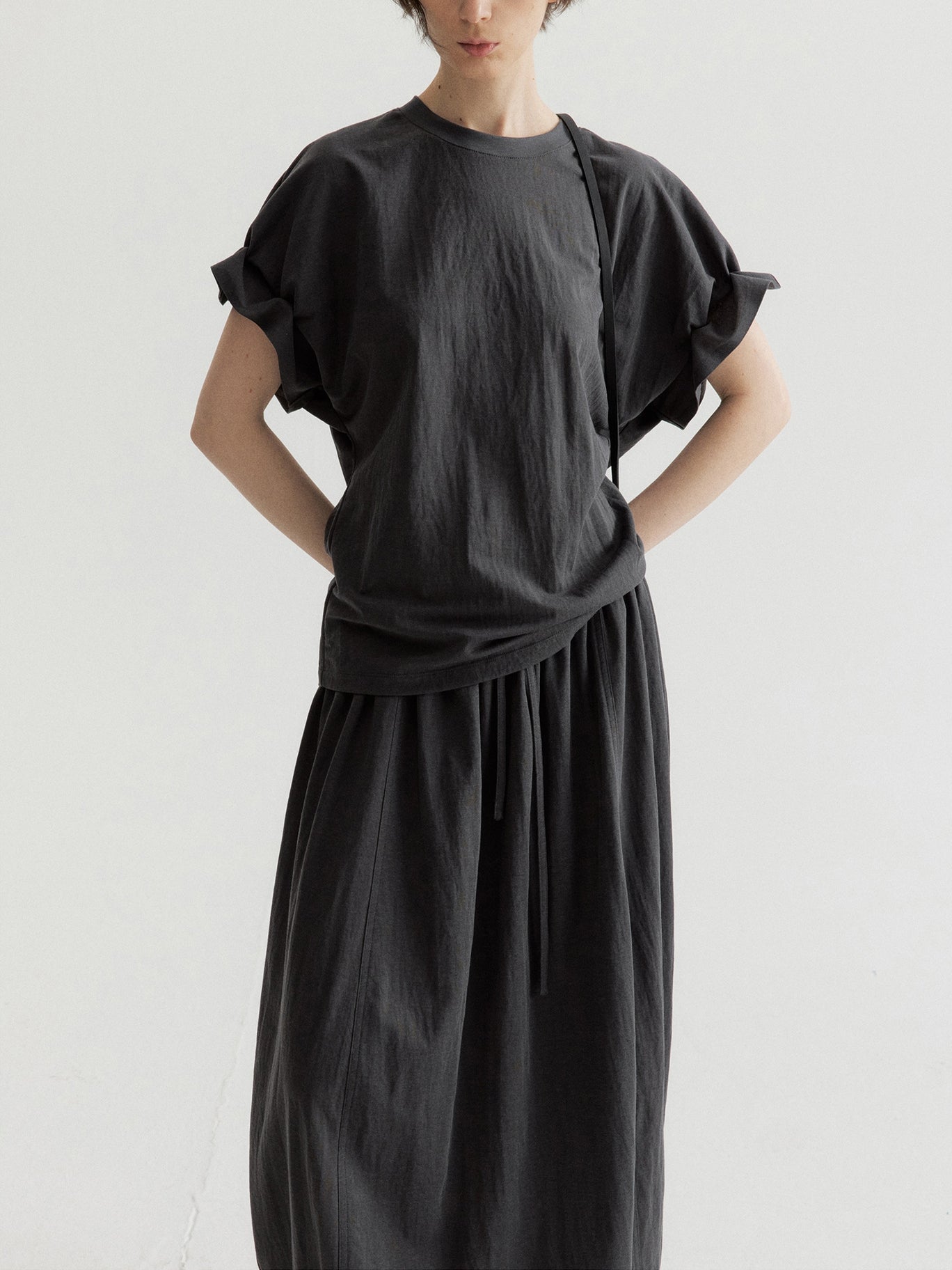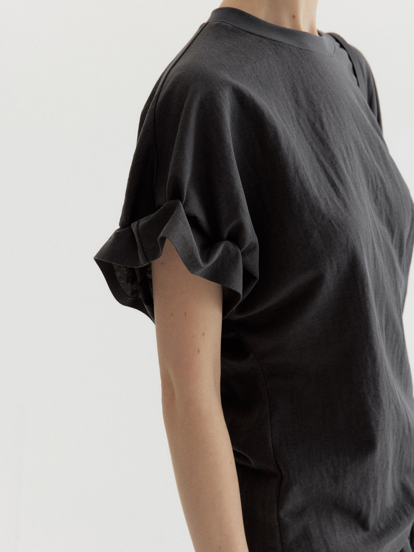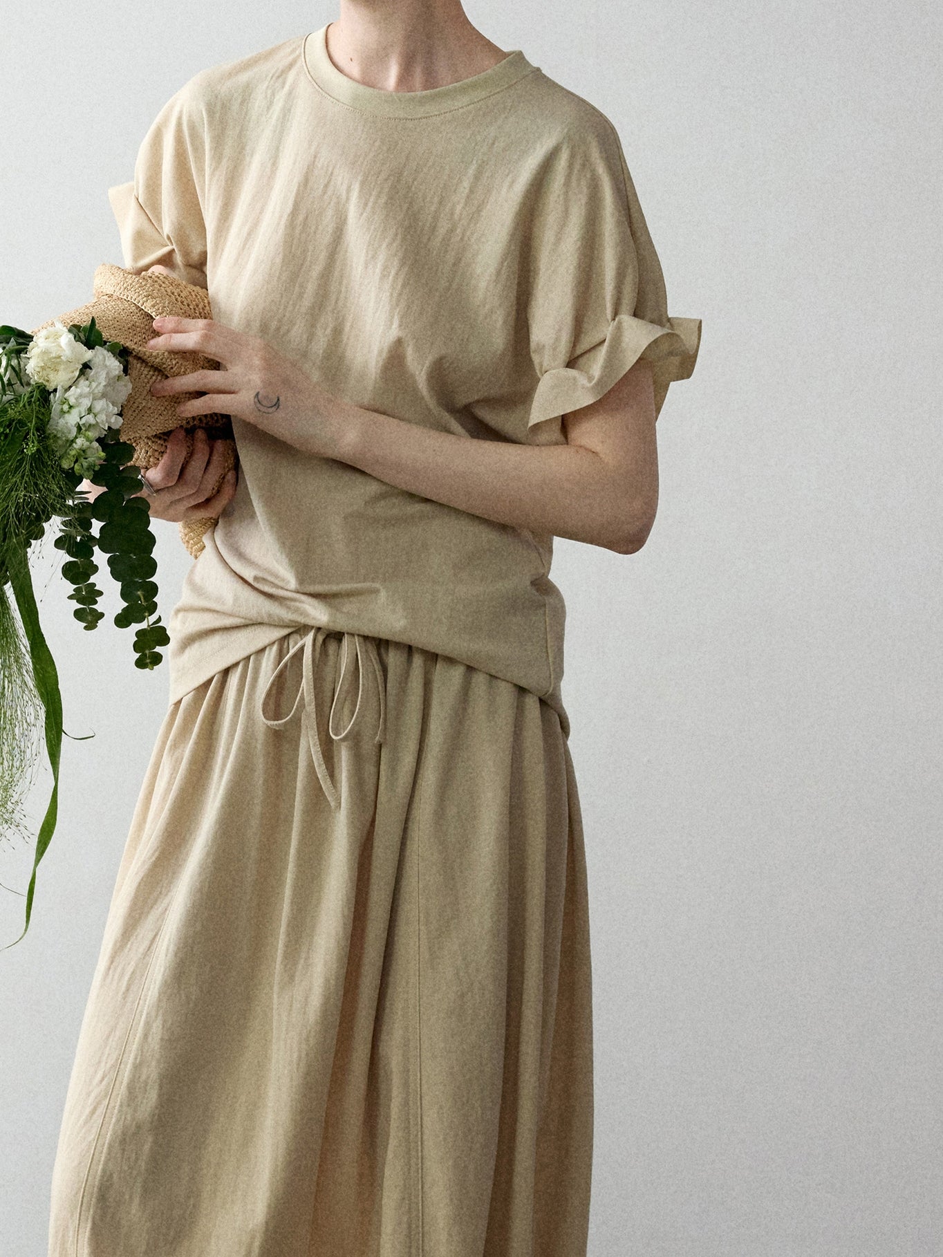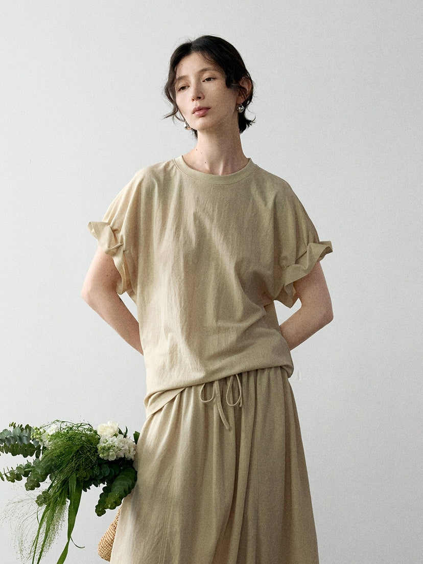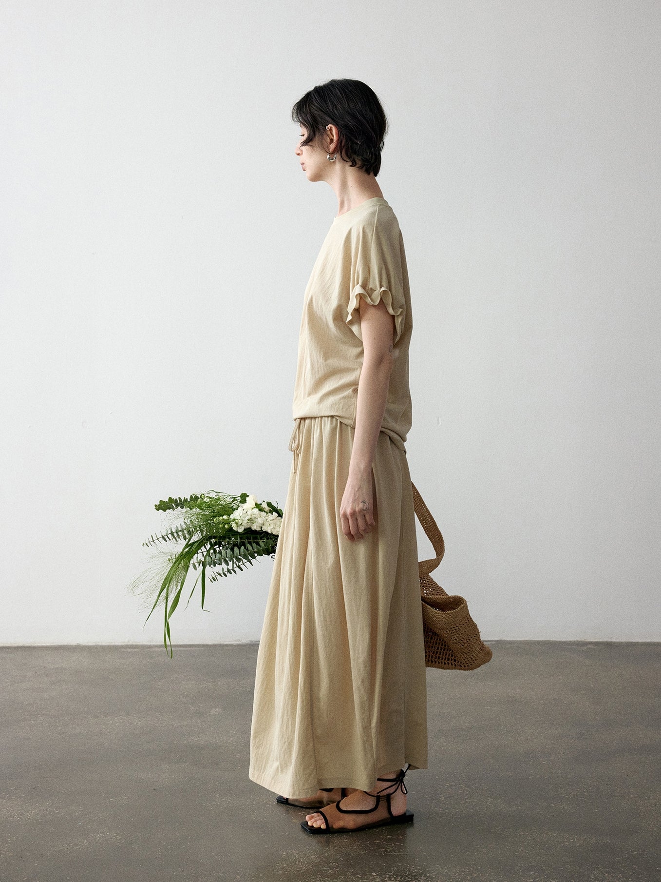 リネン混フリルスリーブドロップショルダーTシャツ【セットアップ可】