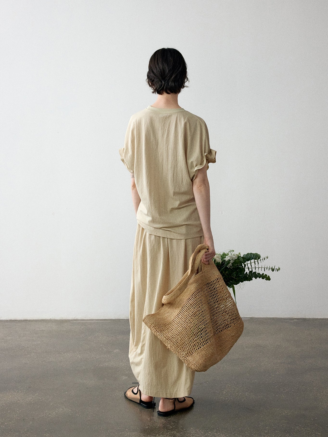 素材はリネン混でドライな肌ざわりと自然なシワ感が、抜けのある表情をつくる。