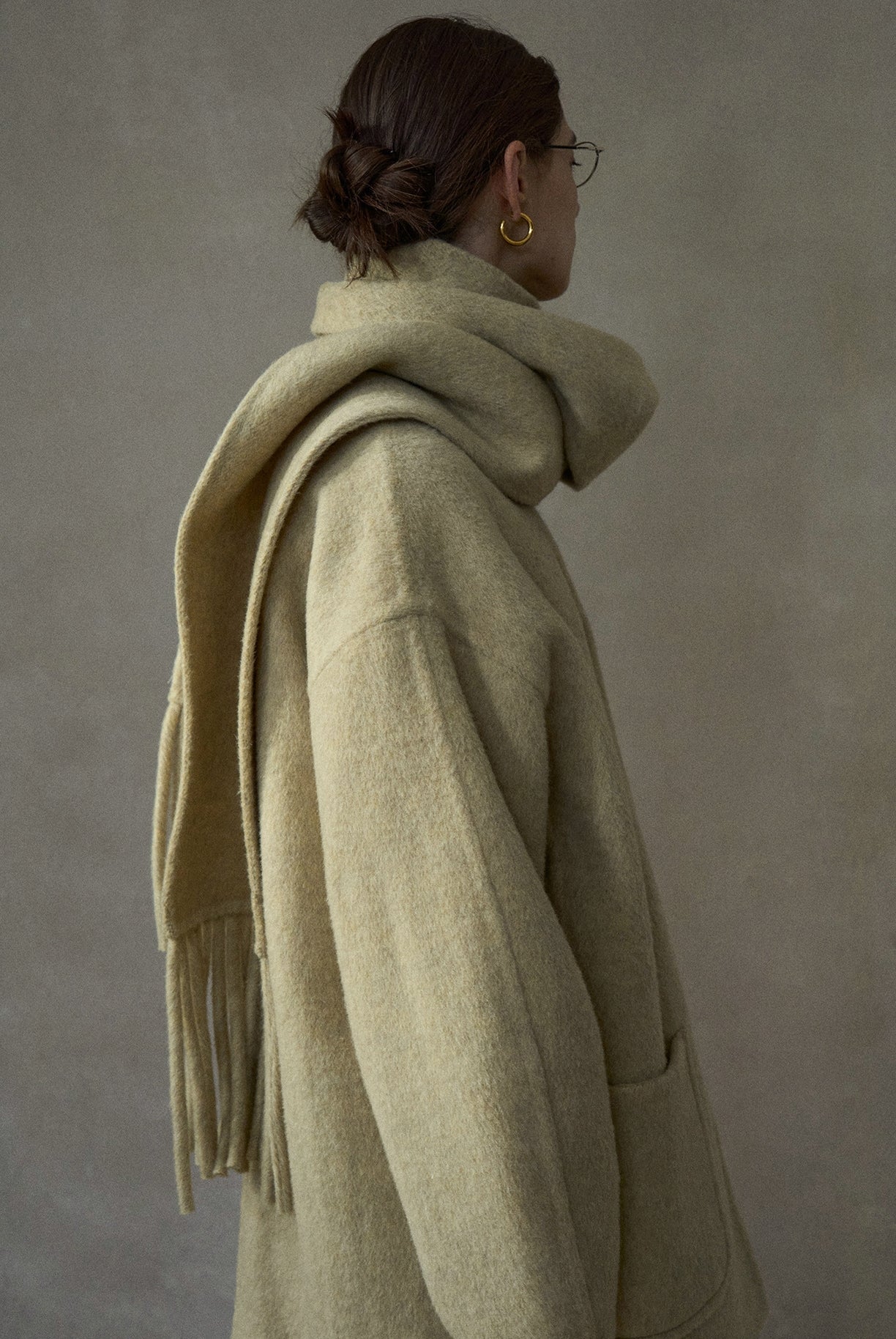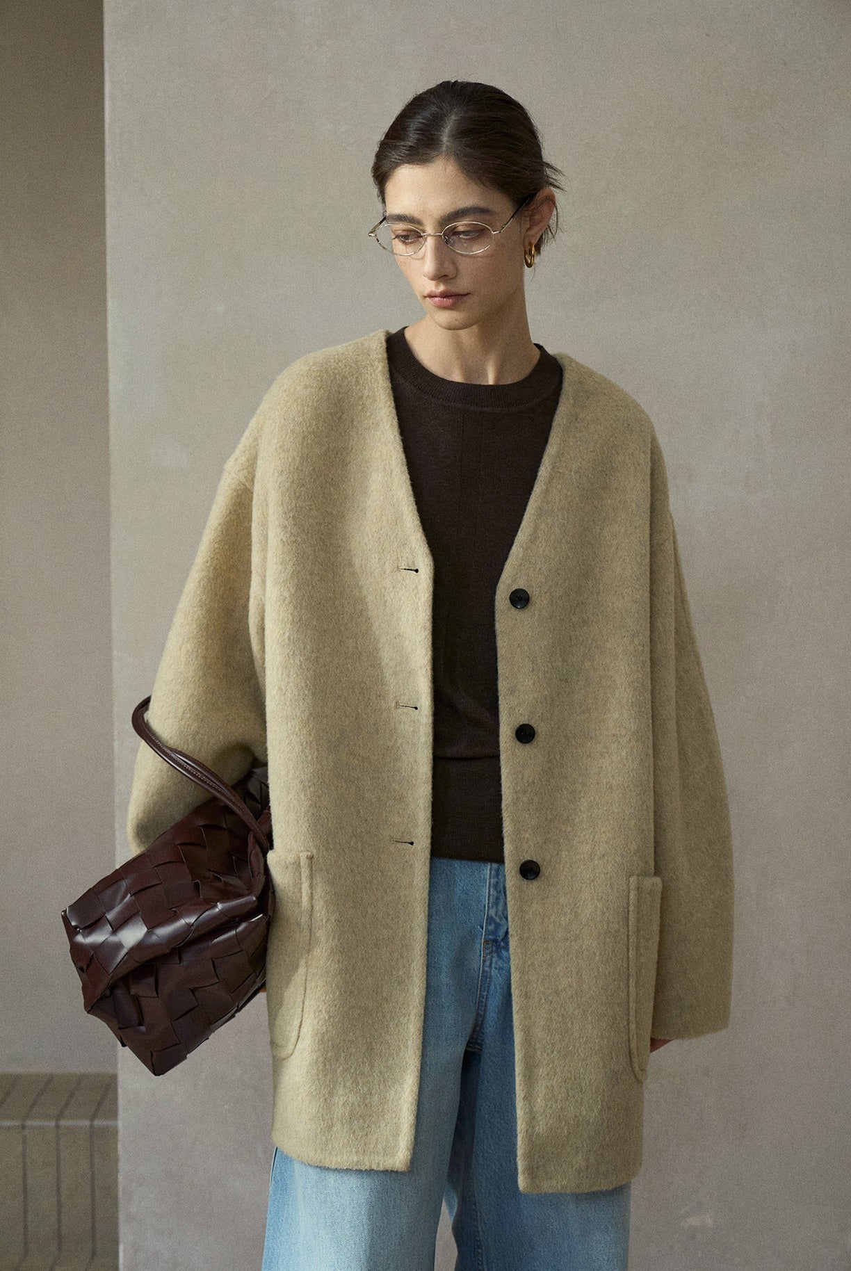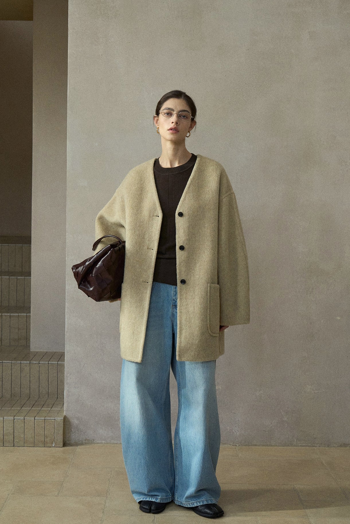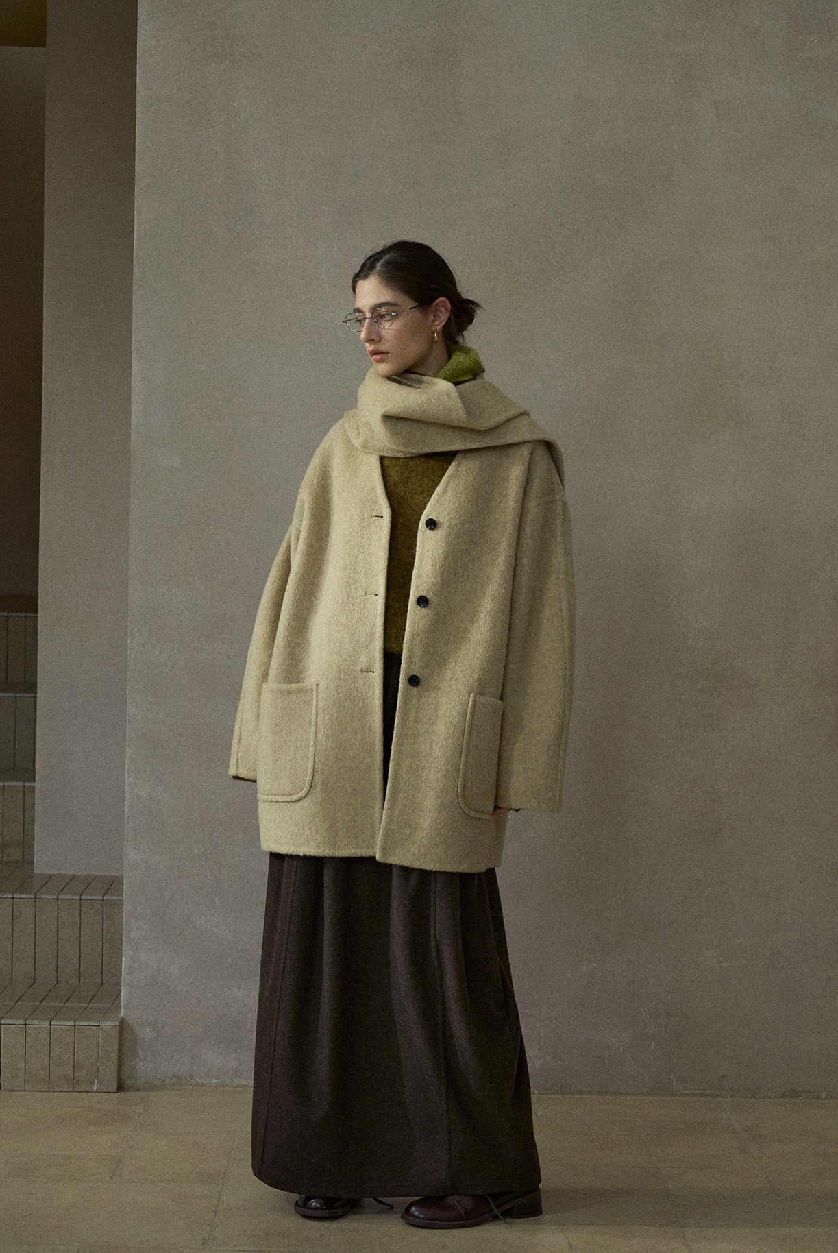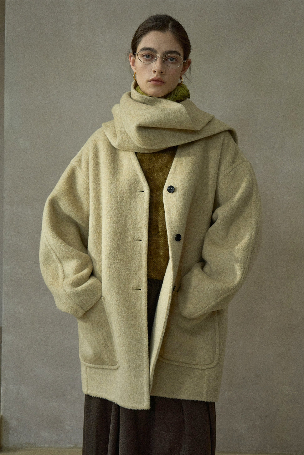 ノーカラーを採用したミニマルなミドル丈コート。