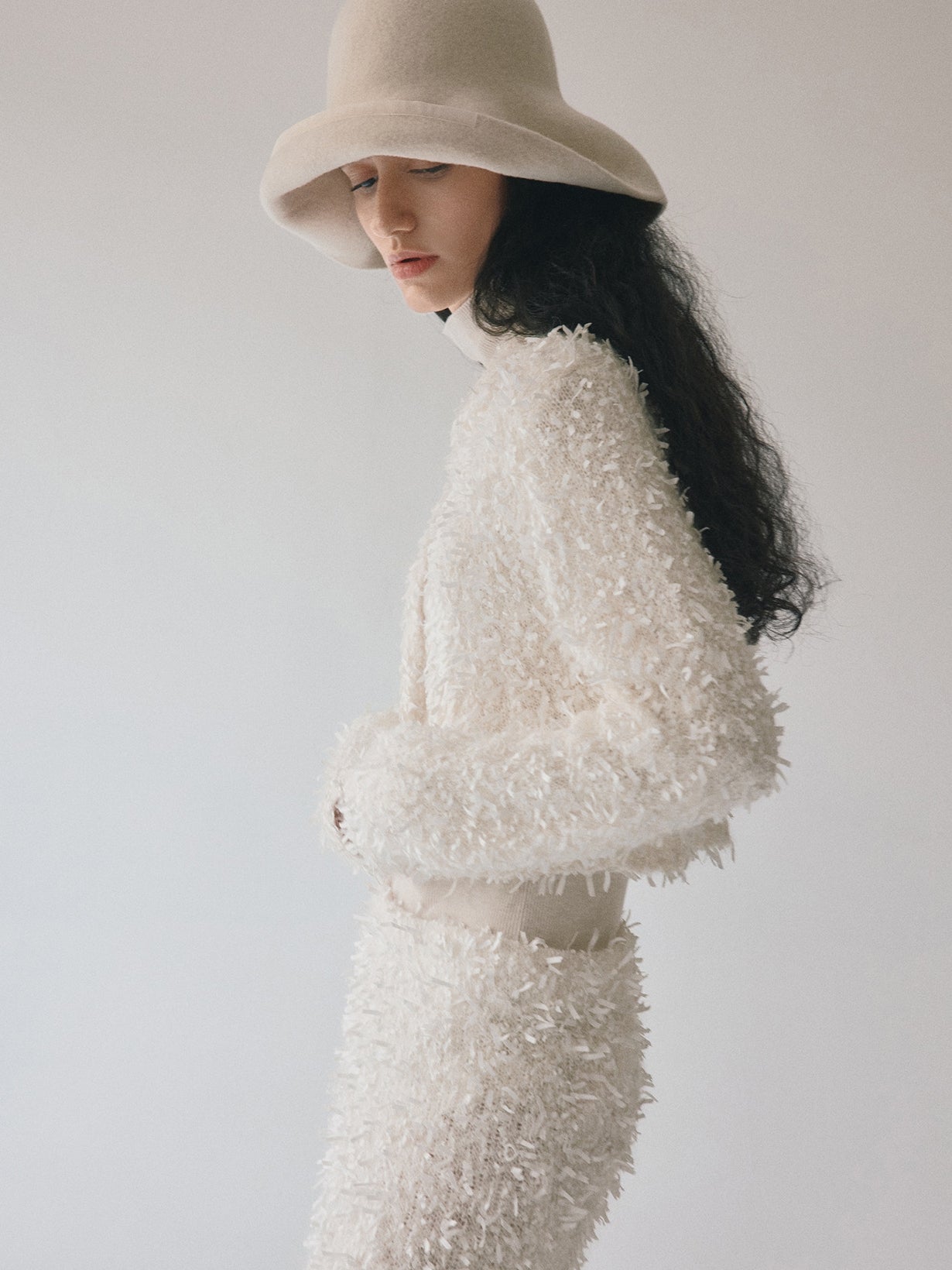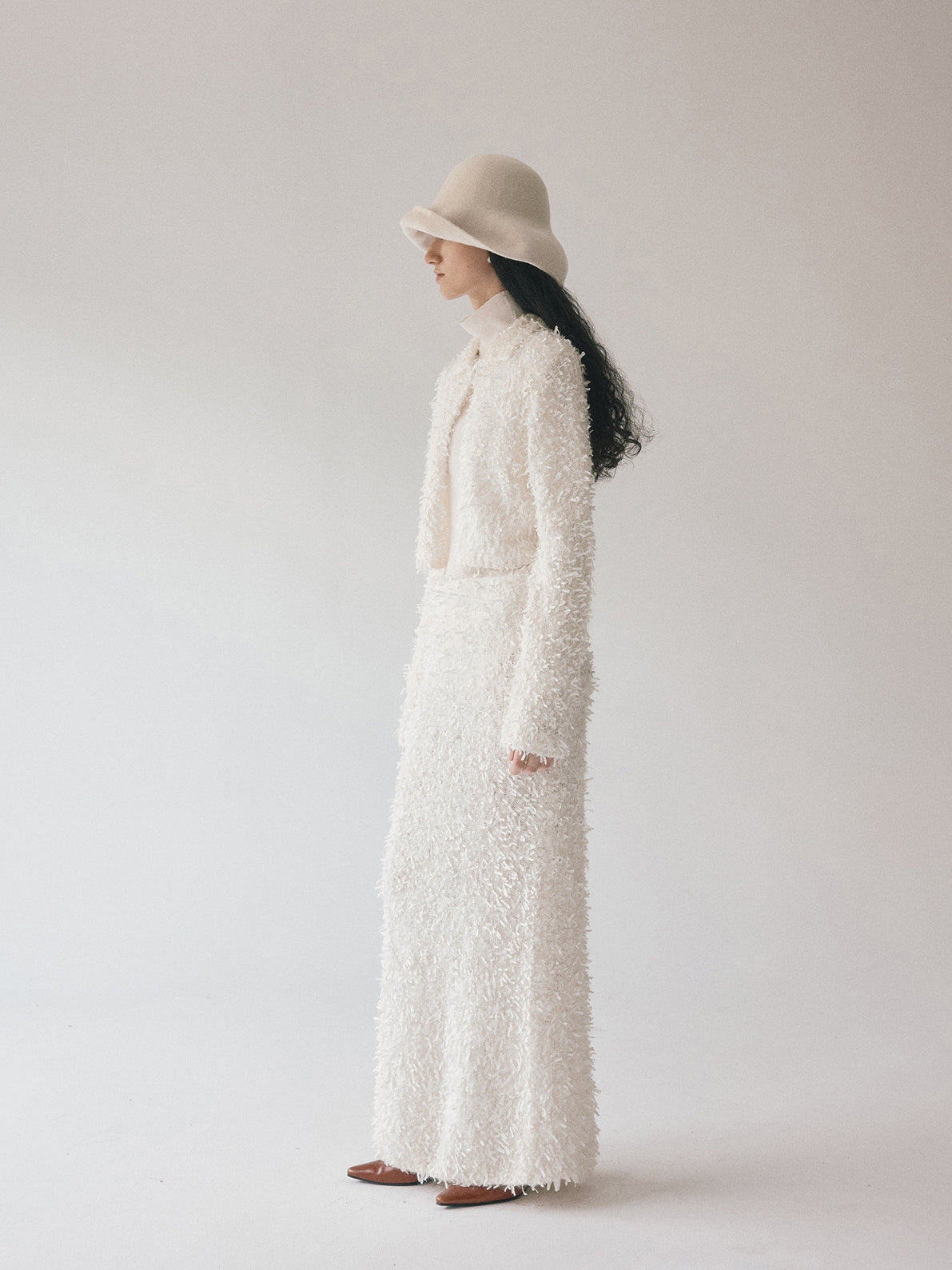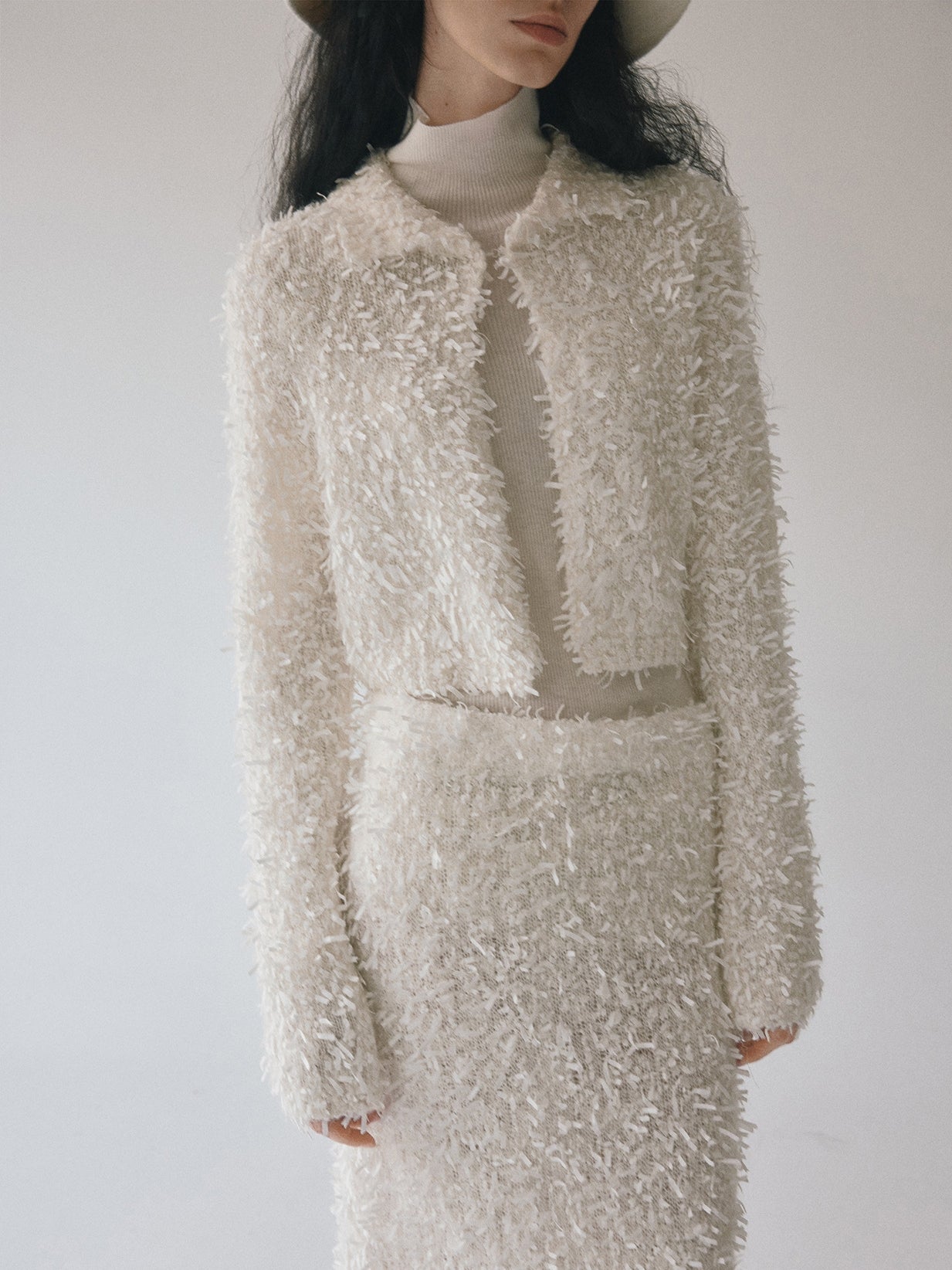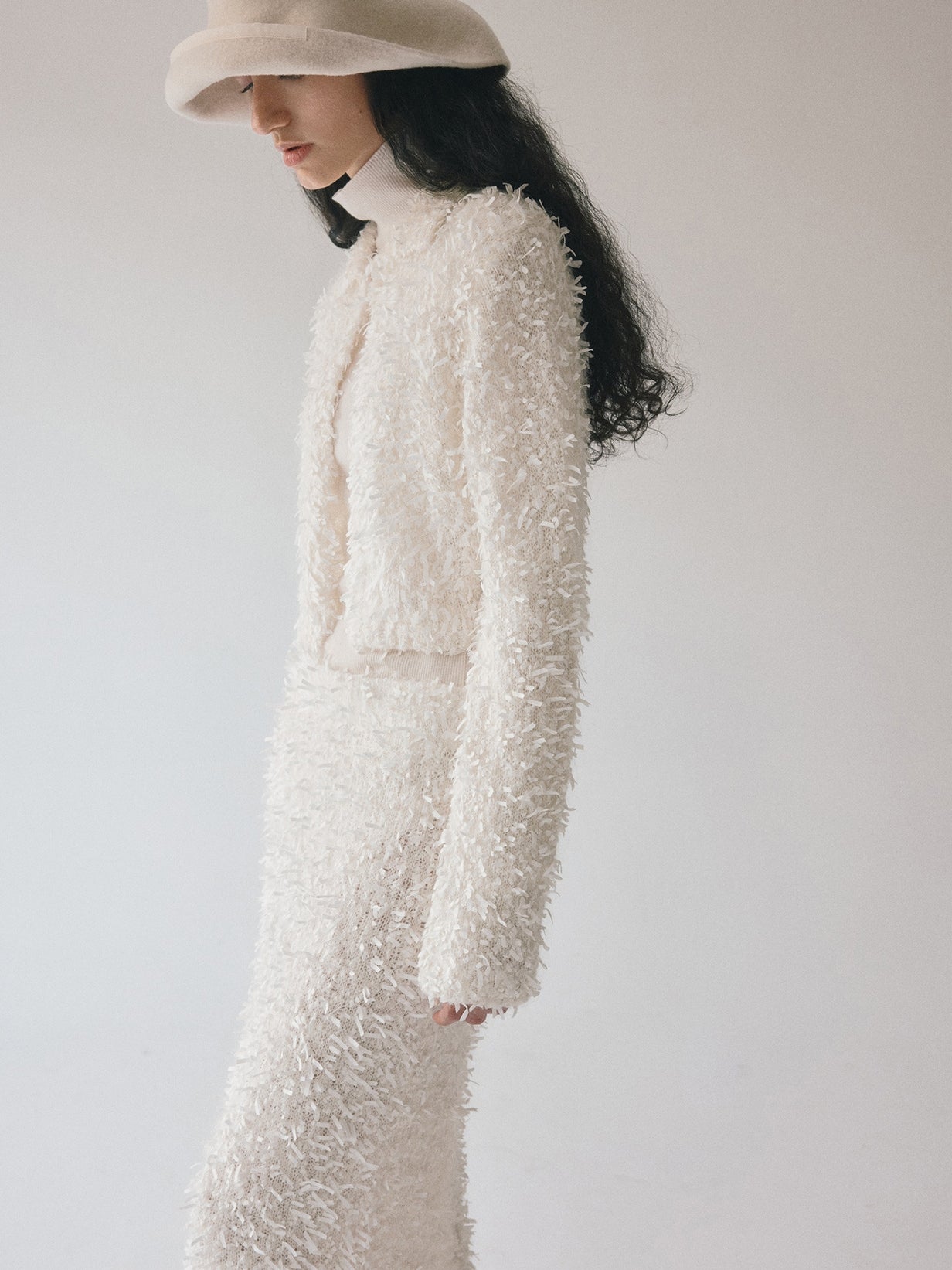 同素材の「モヘアテープヤーンIラインスカート」とセットアップでの着用もおすすめです。