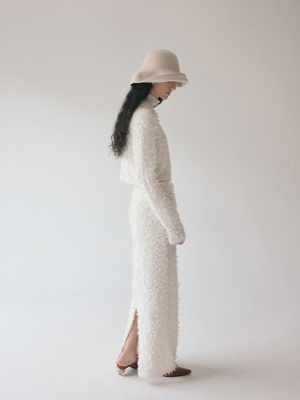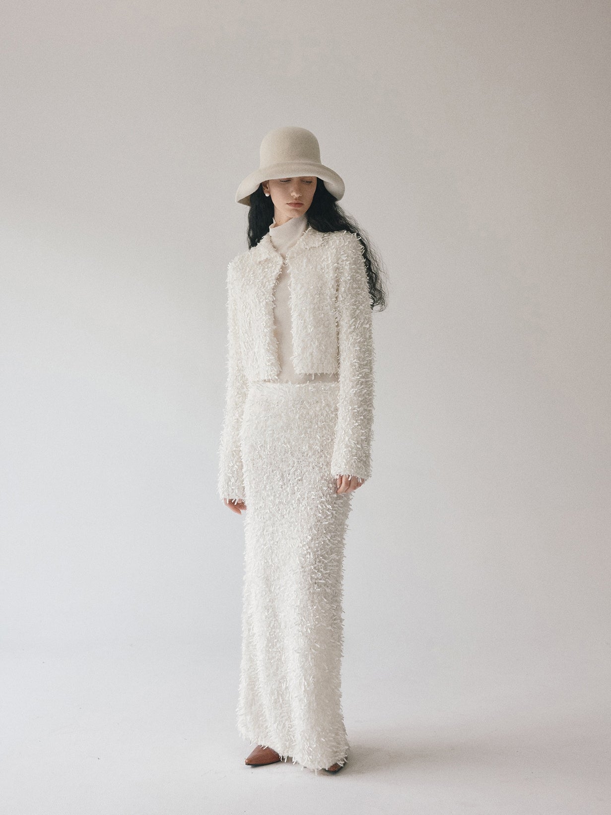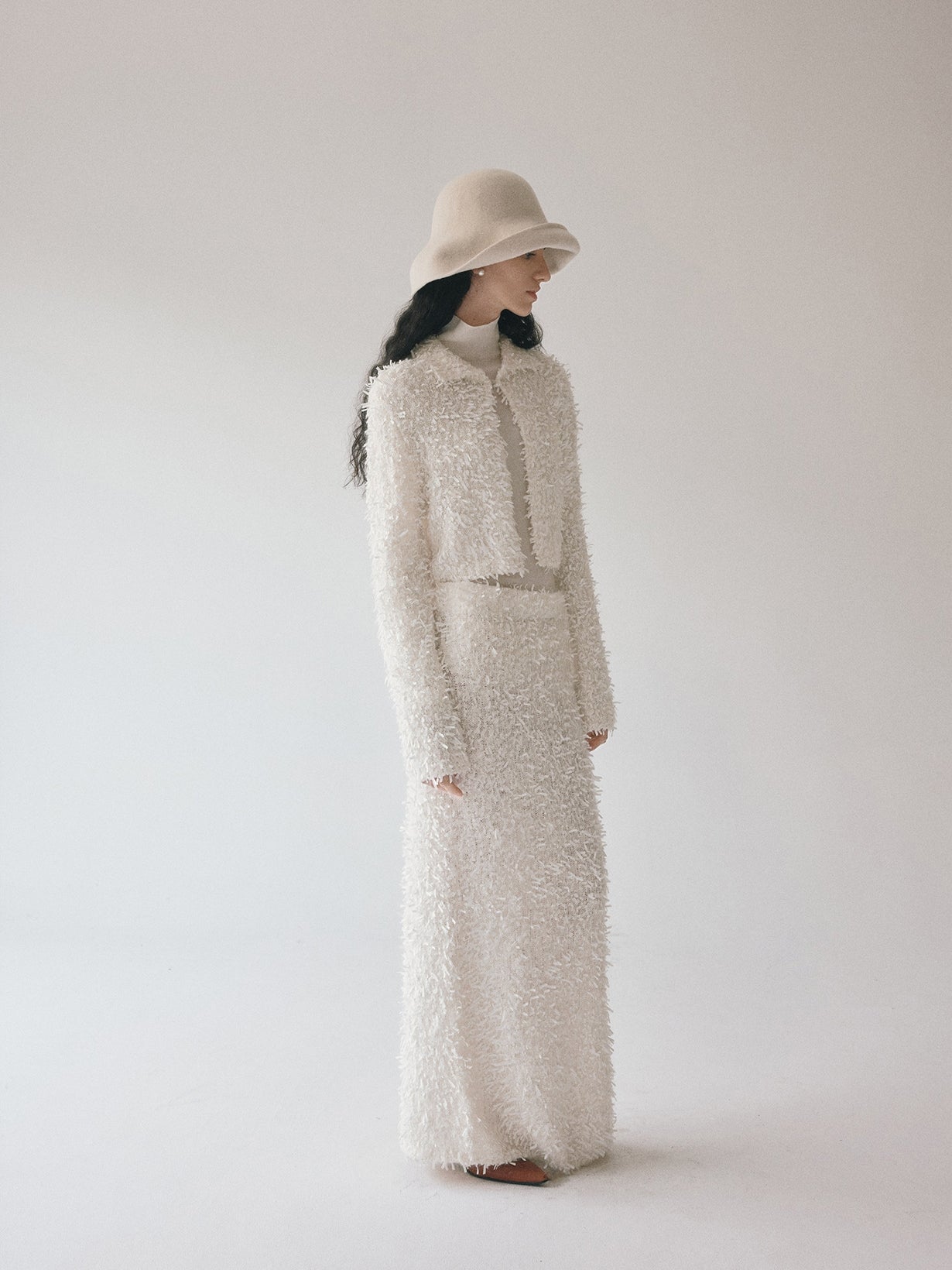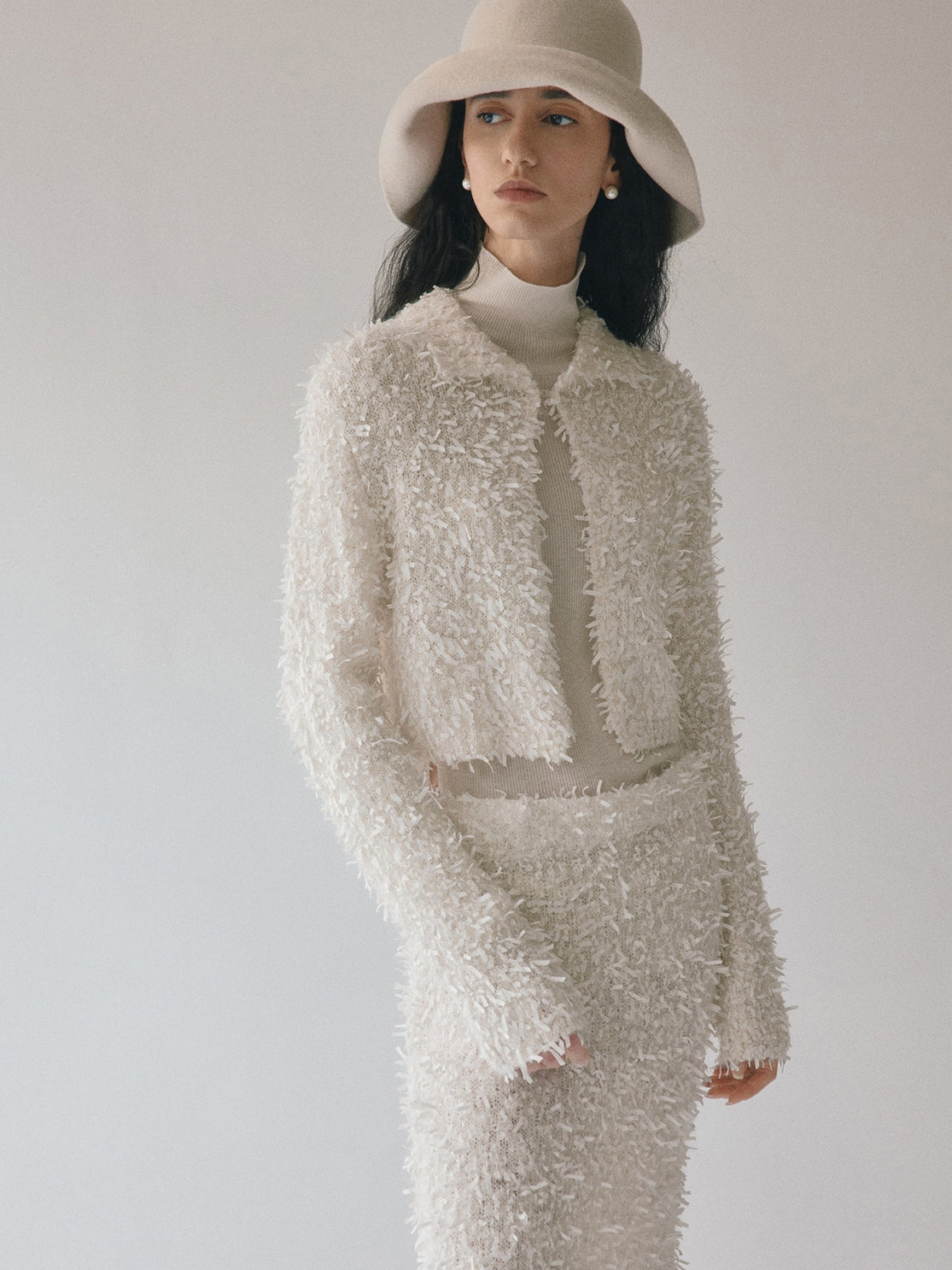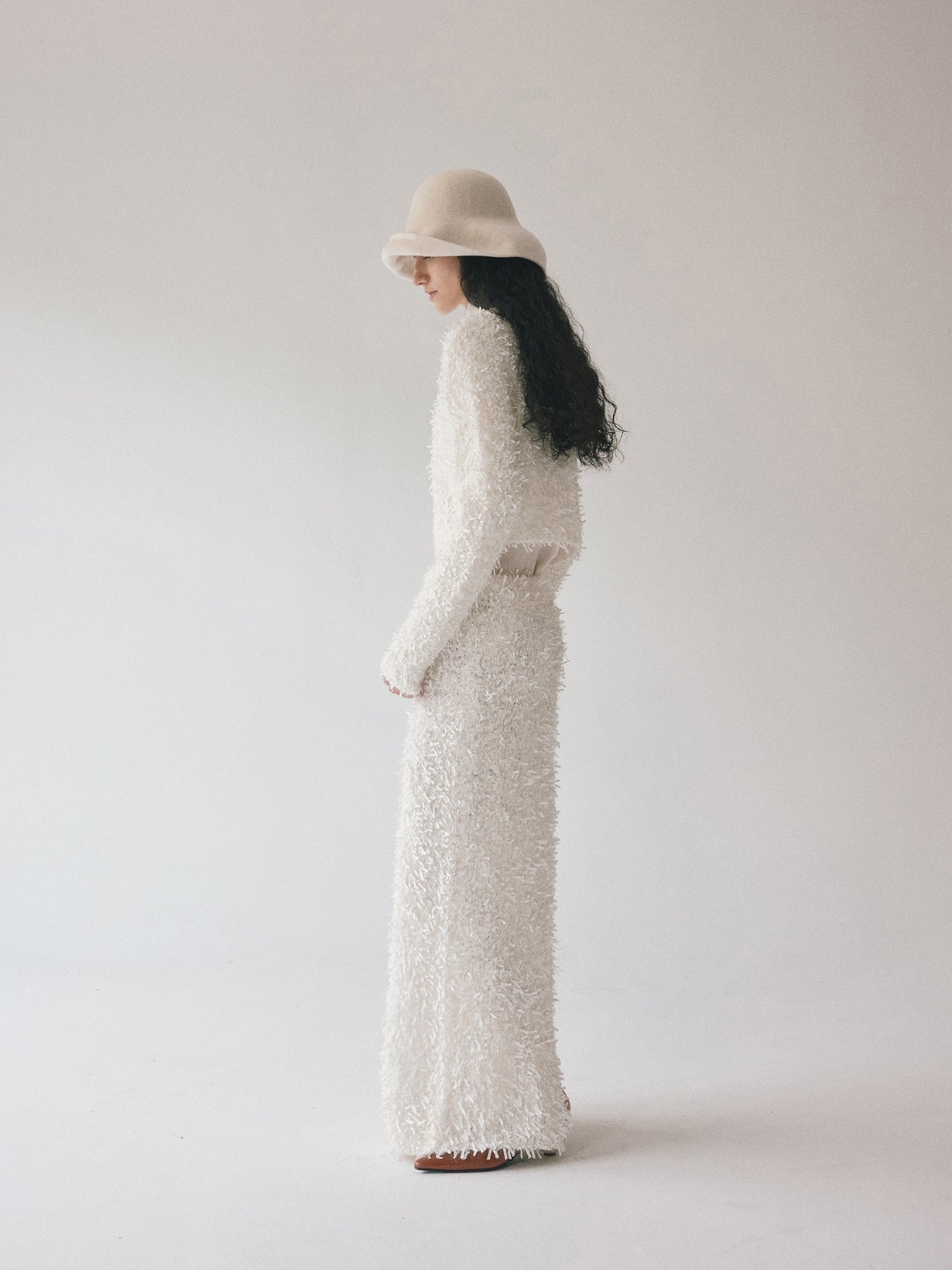 同素材の「モヘアテープヤーンIラインスカート」とセットアップでの着用もおすすめです。