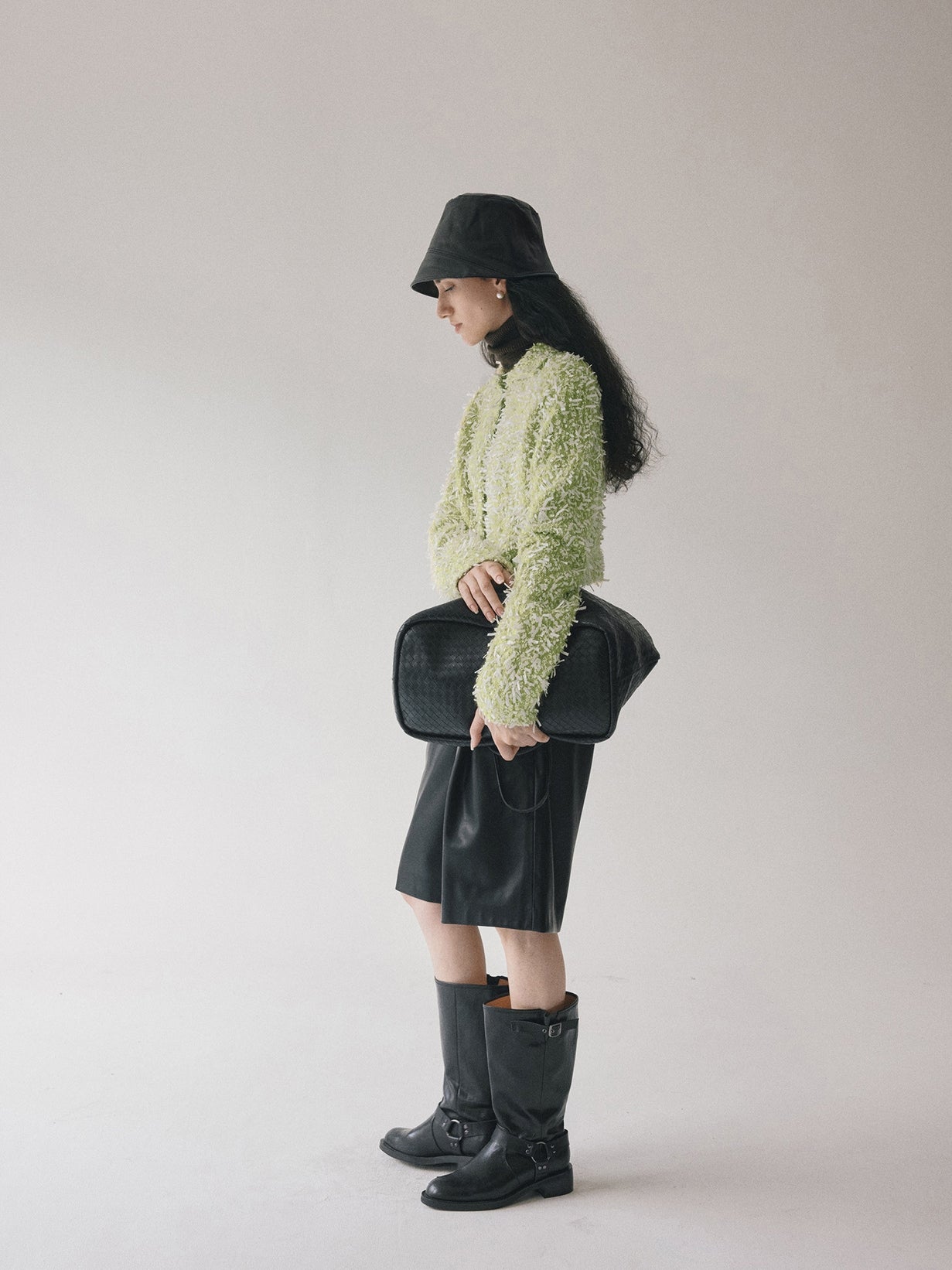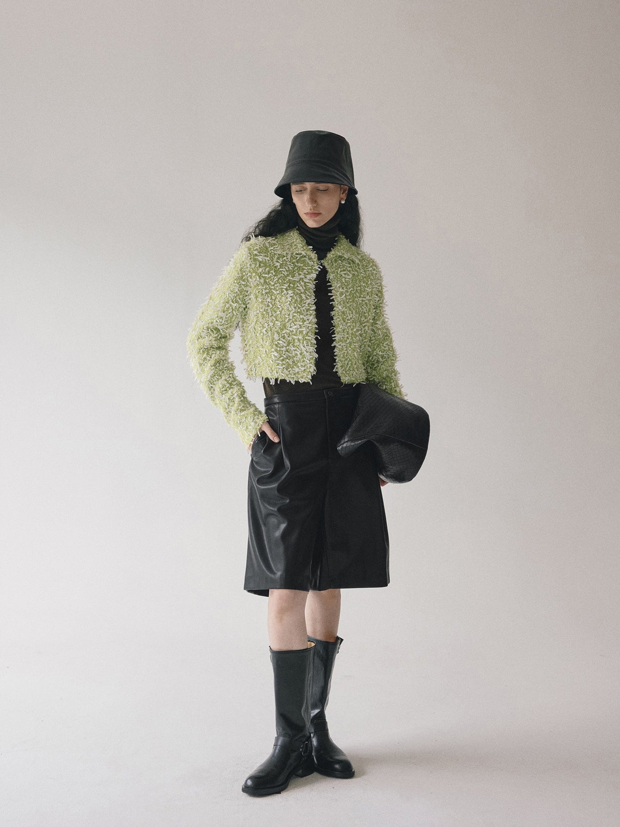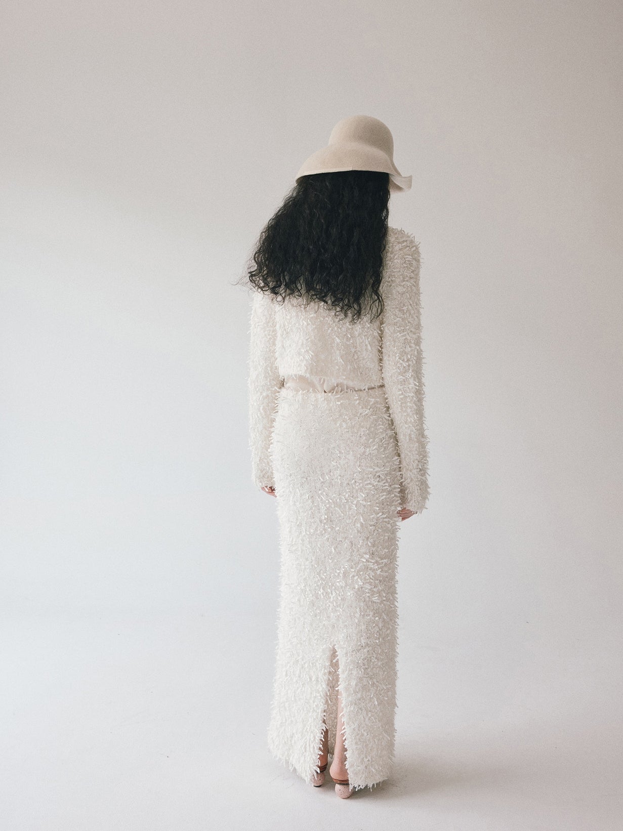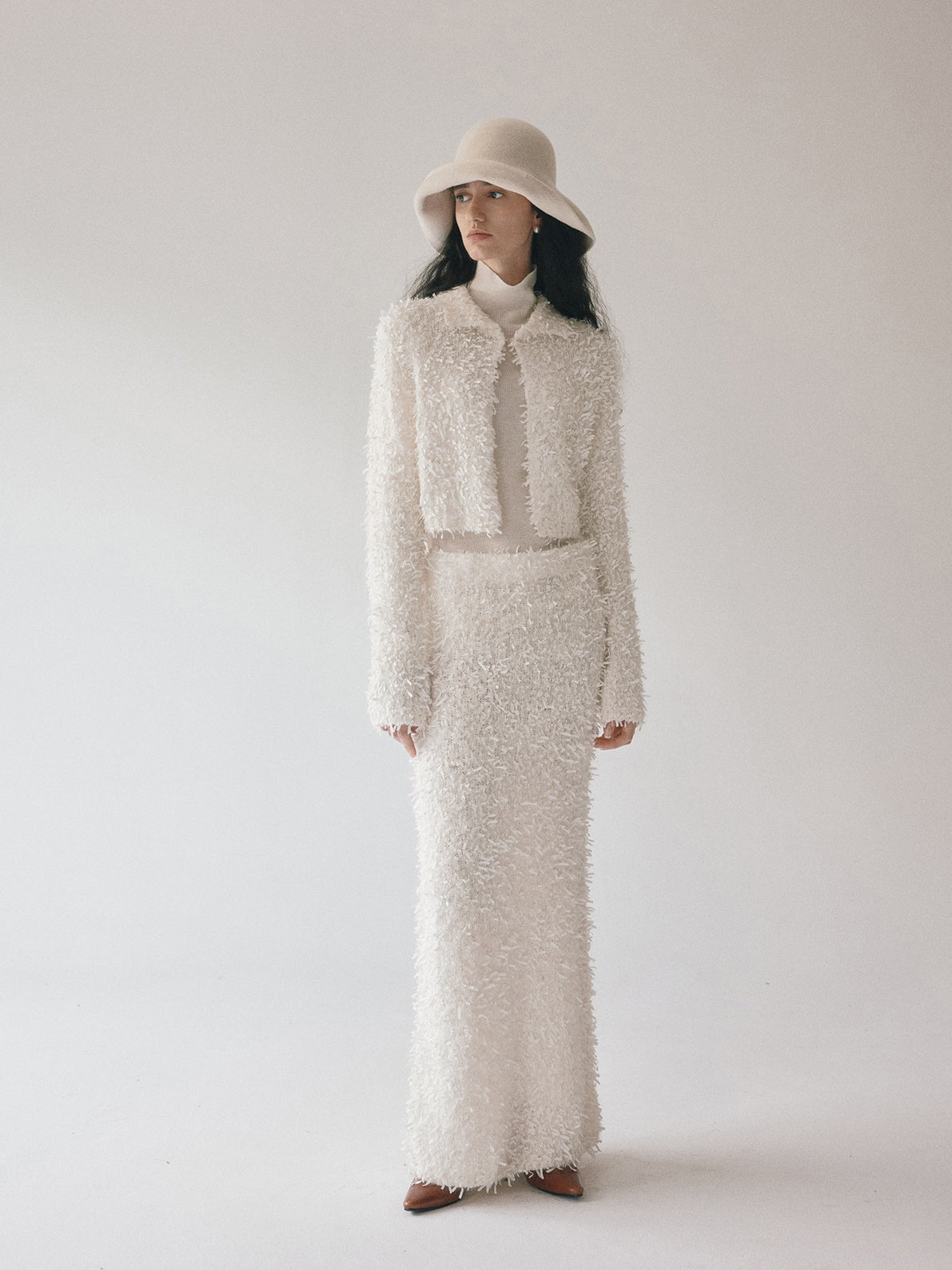 同素材の「モヘアテープヤーンIラインスカート」とセットアップでの着用もおすすめです。