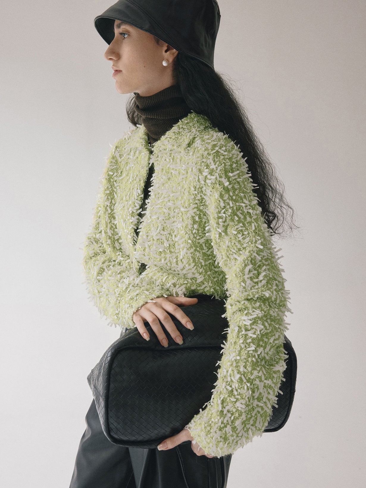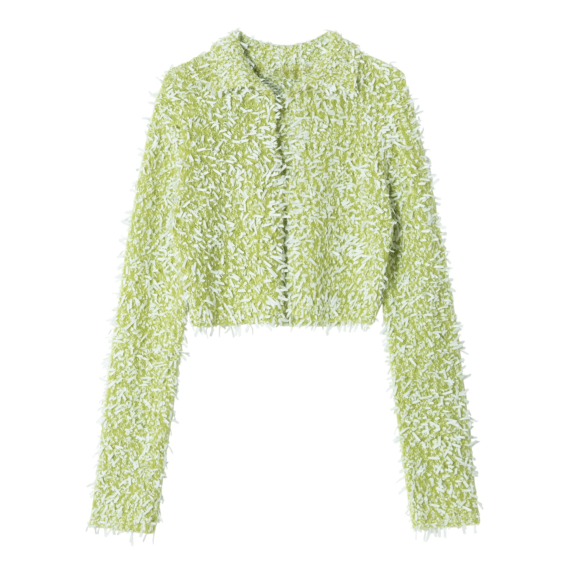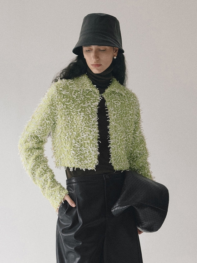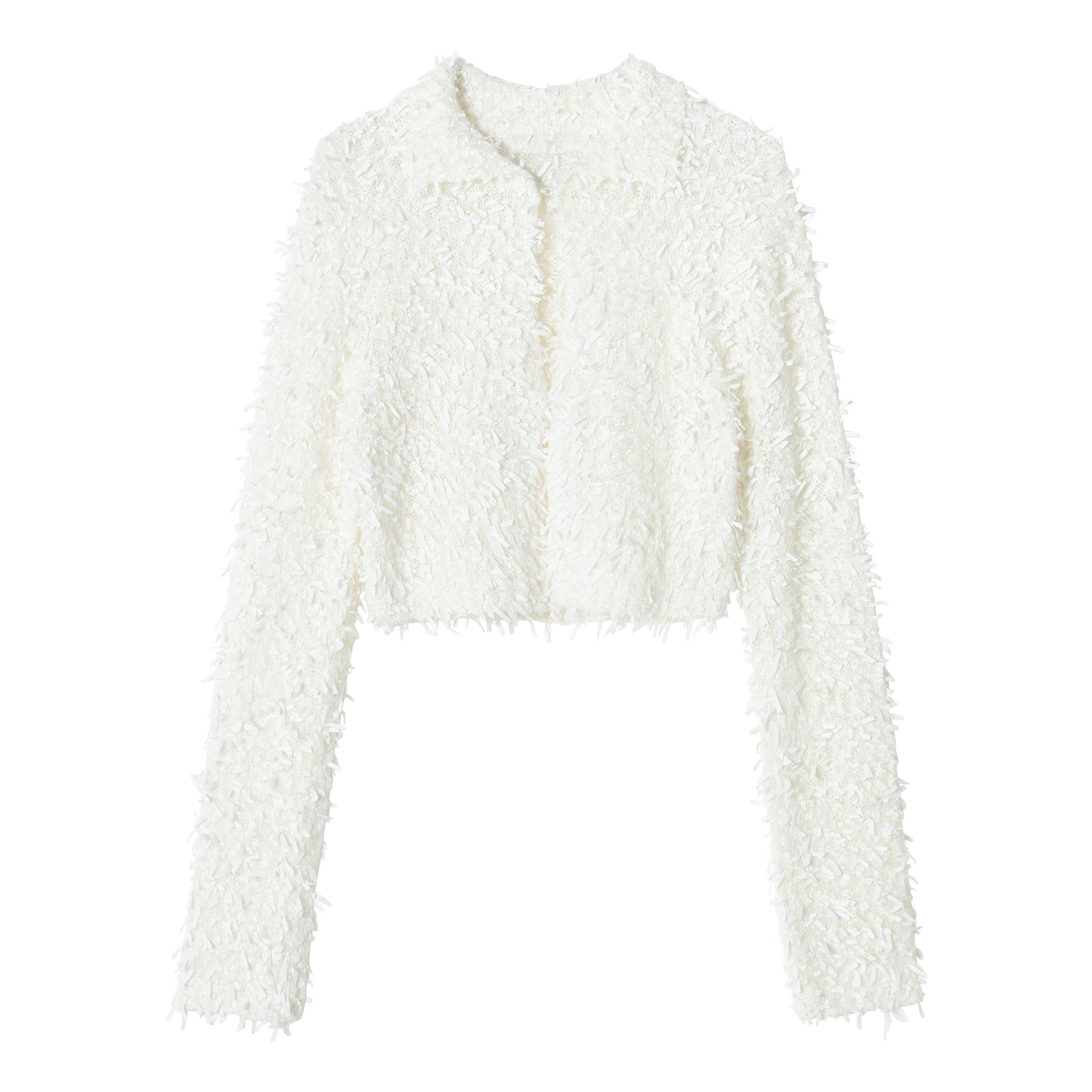 立体感のあるモヘア混のしなやかなテープヤーンボレロ。