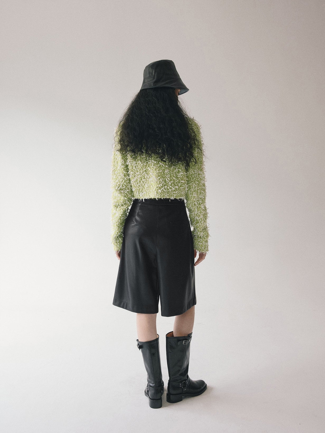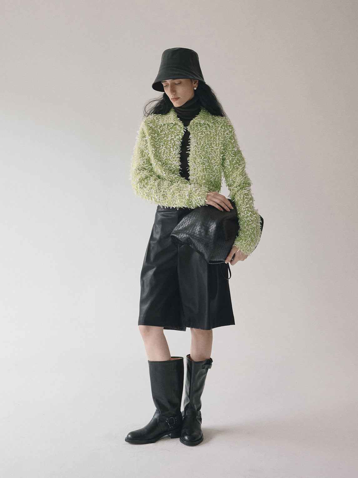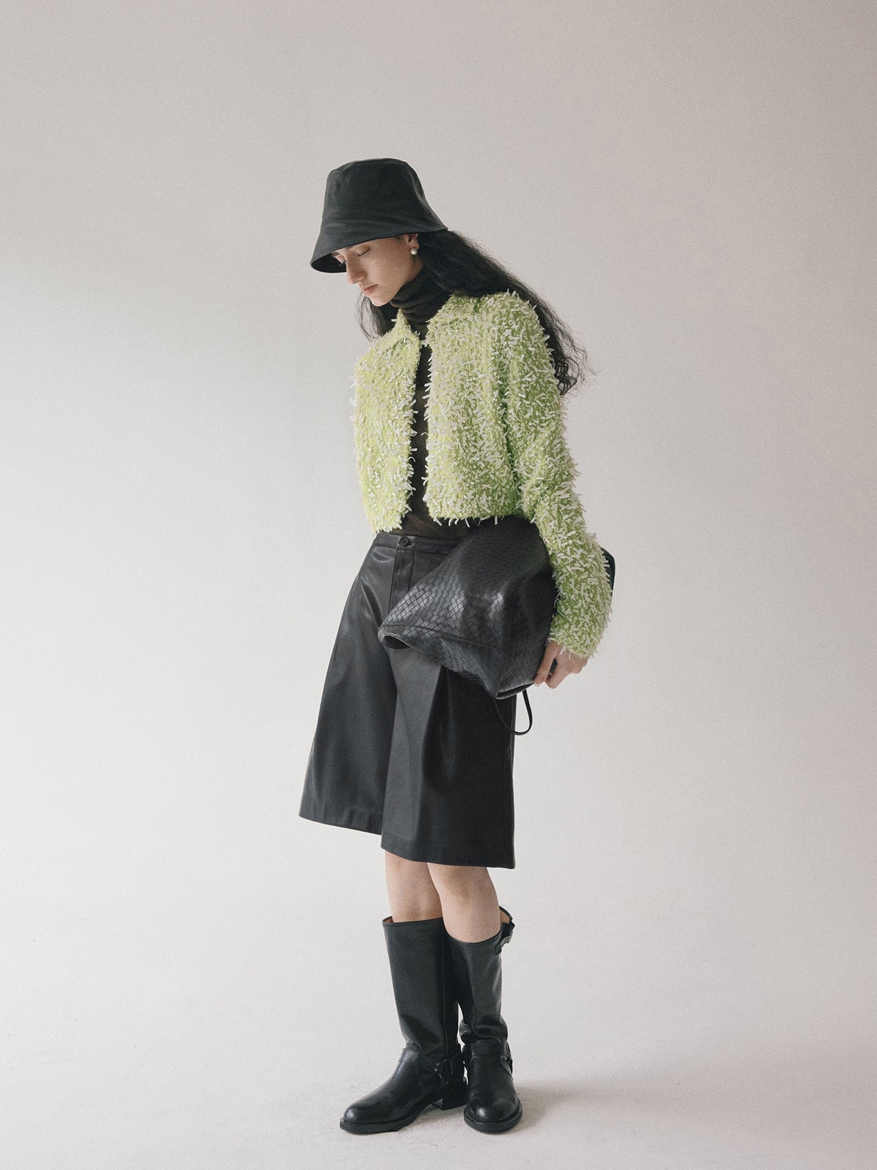 立体感のあるモヘア混のしなやかなテープヤーンボレロ。