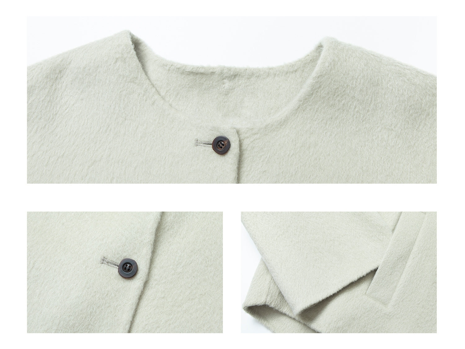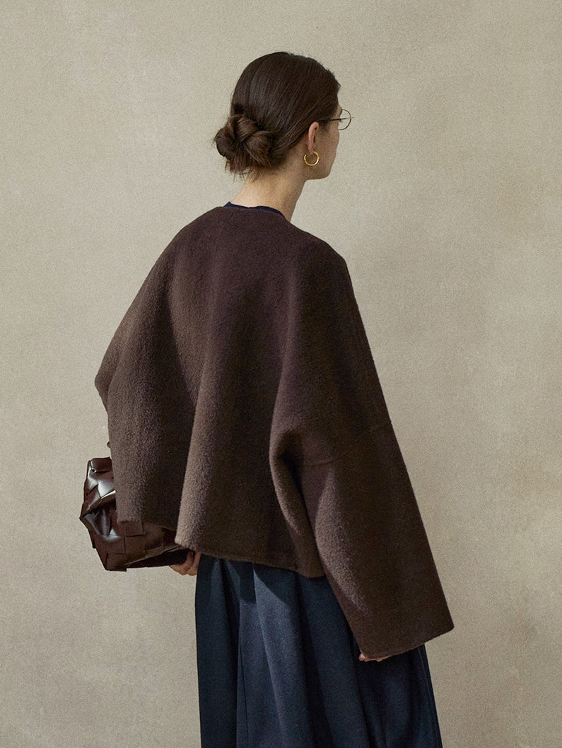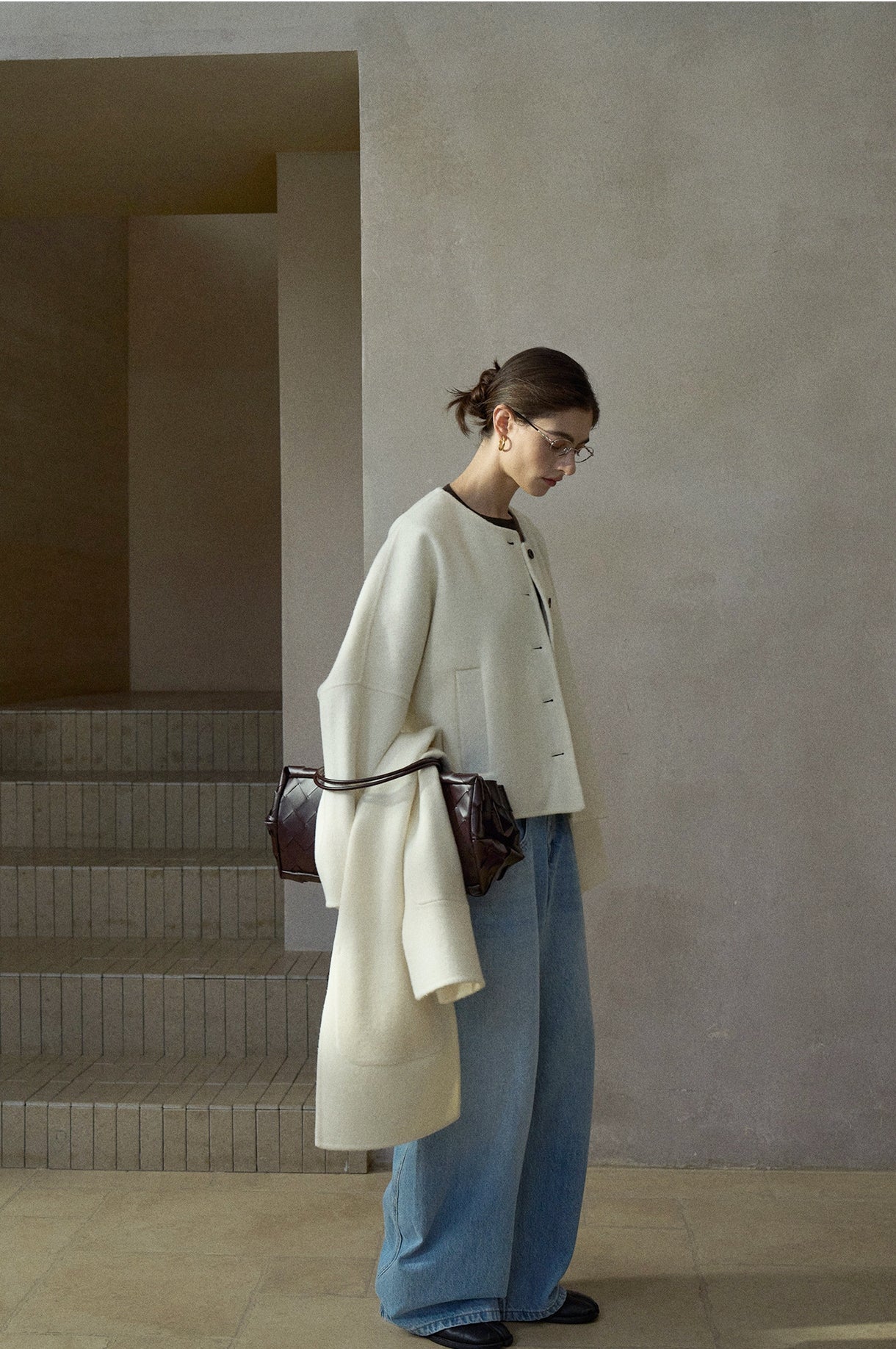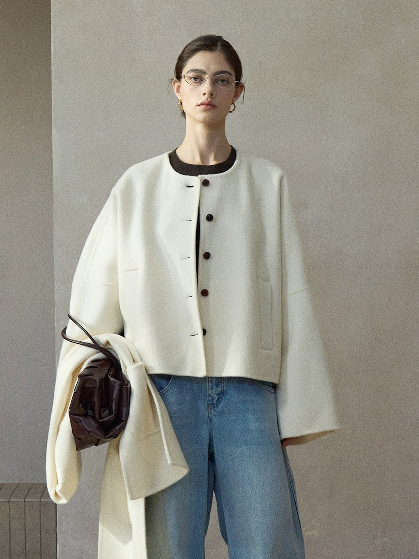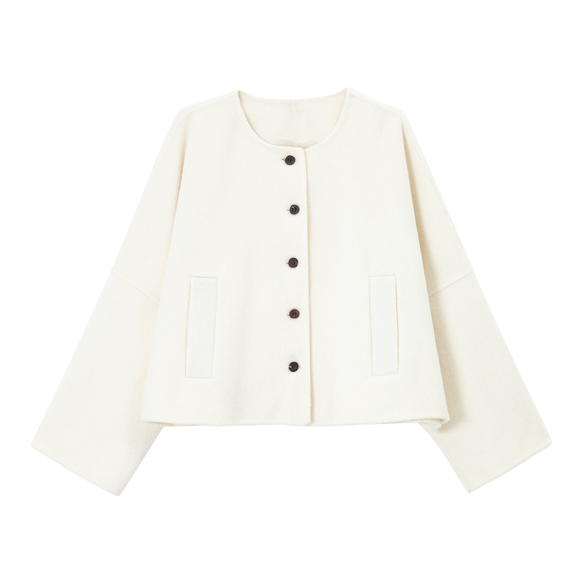 ノーカラーデザインで首回りをすっきりと仕上げたショートコート。