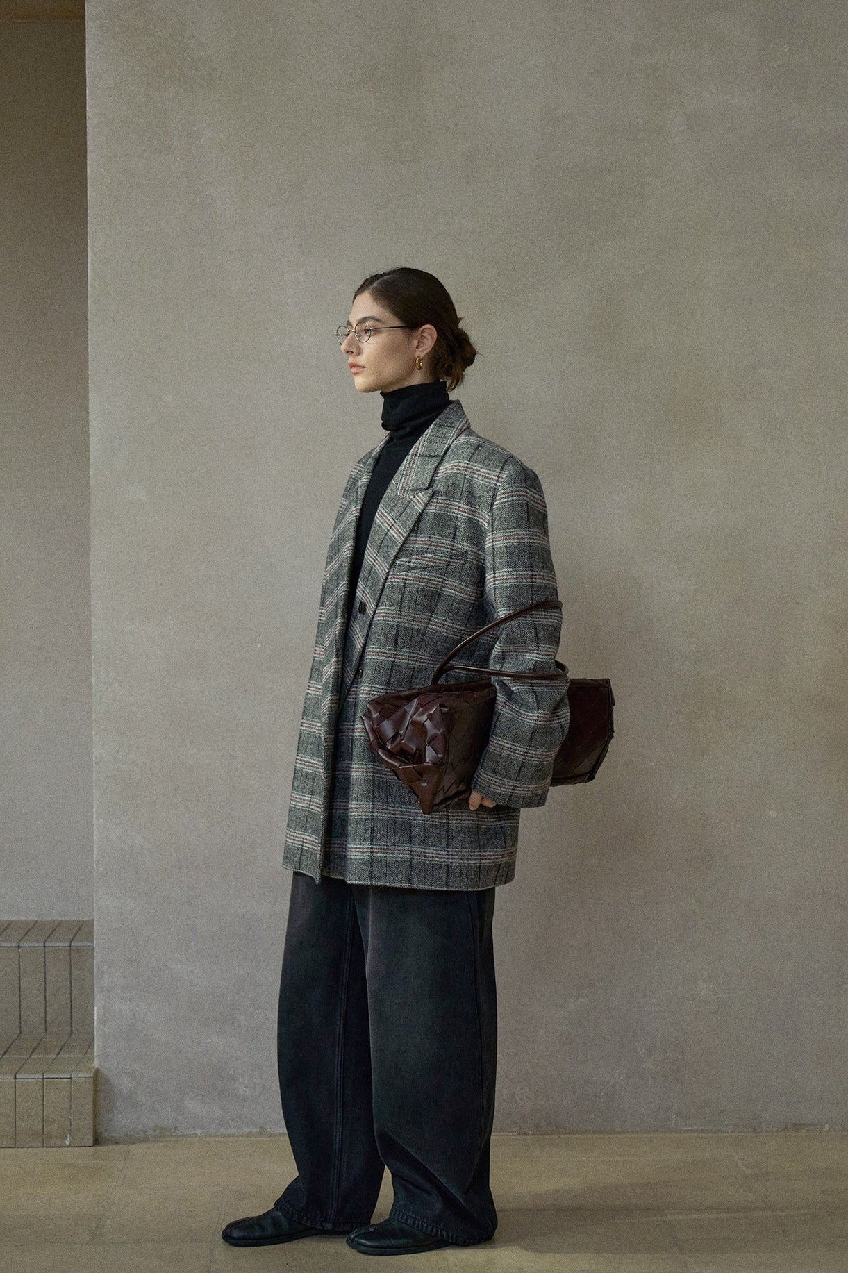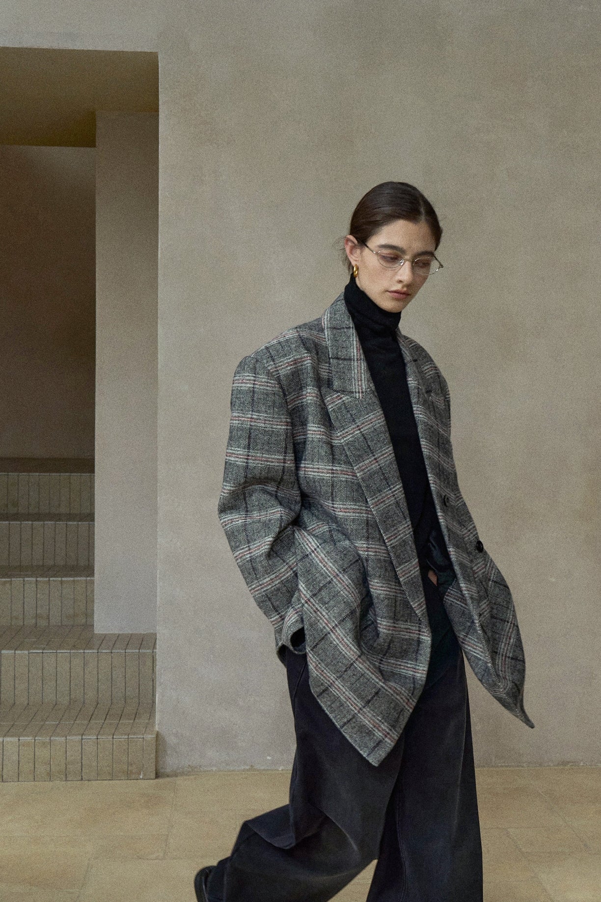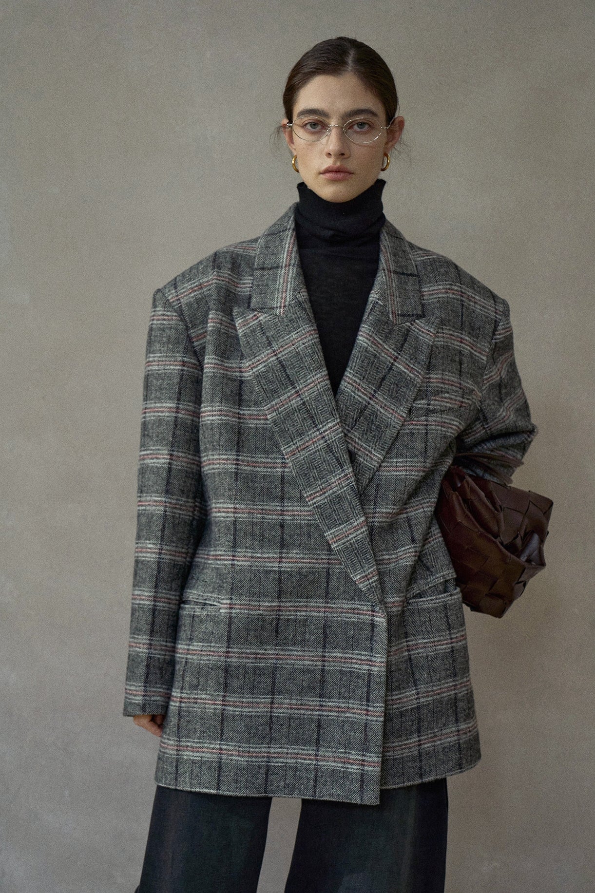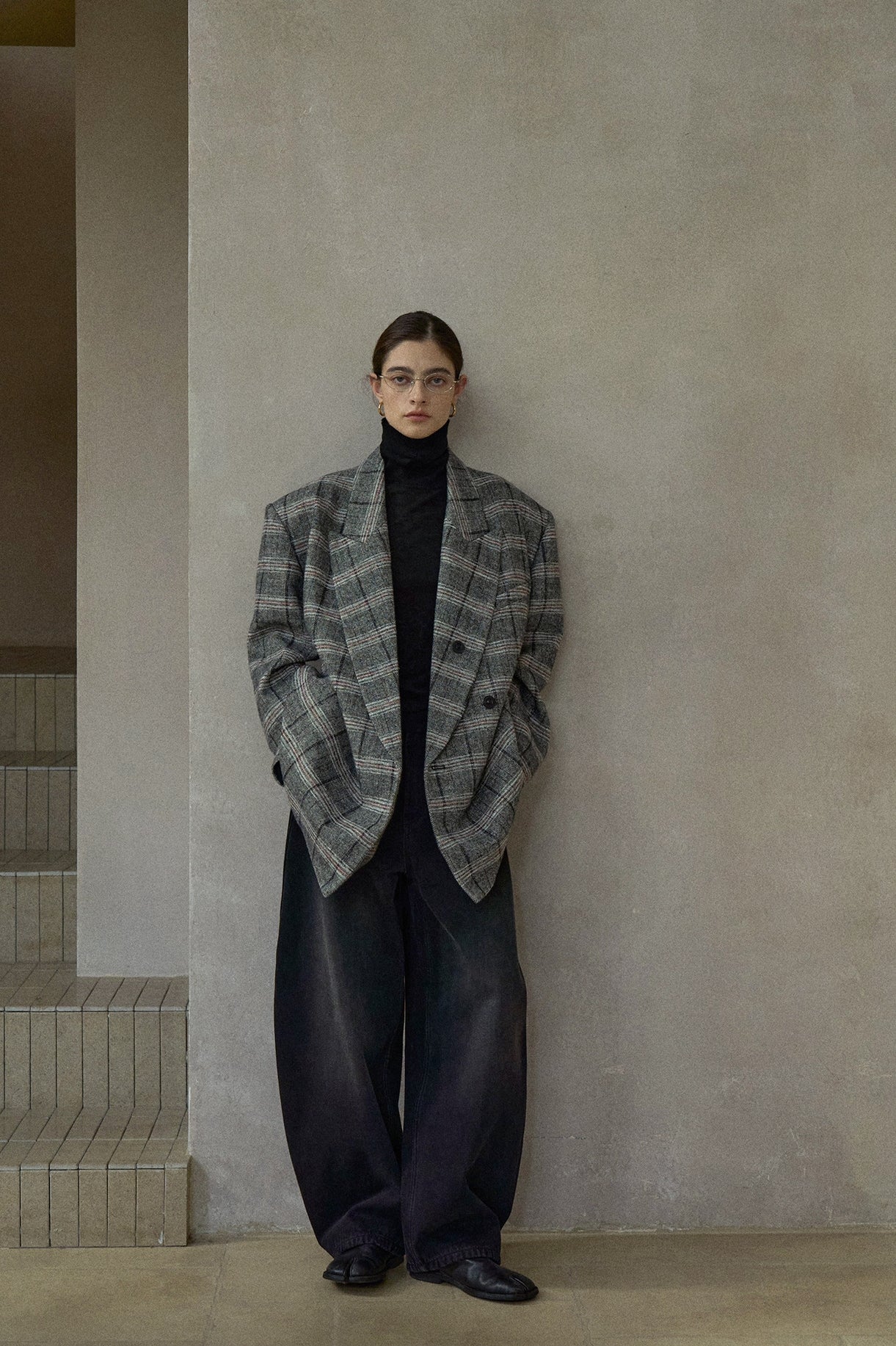 チェックの表情はクラシックな印象を保ちつつモダンなスタイリングに馴染む素材感。