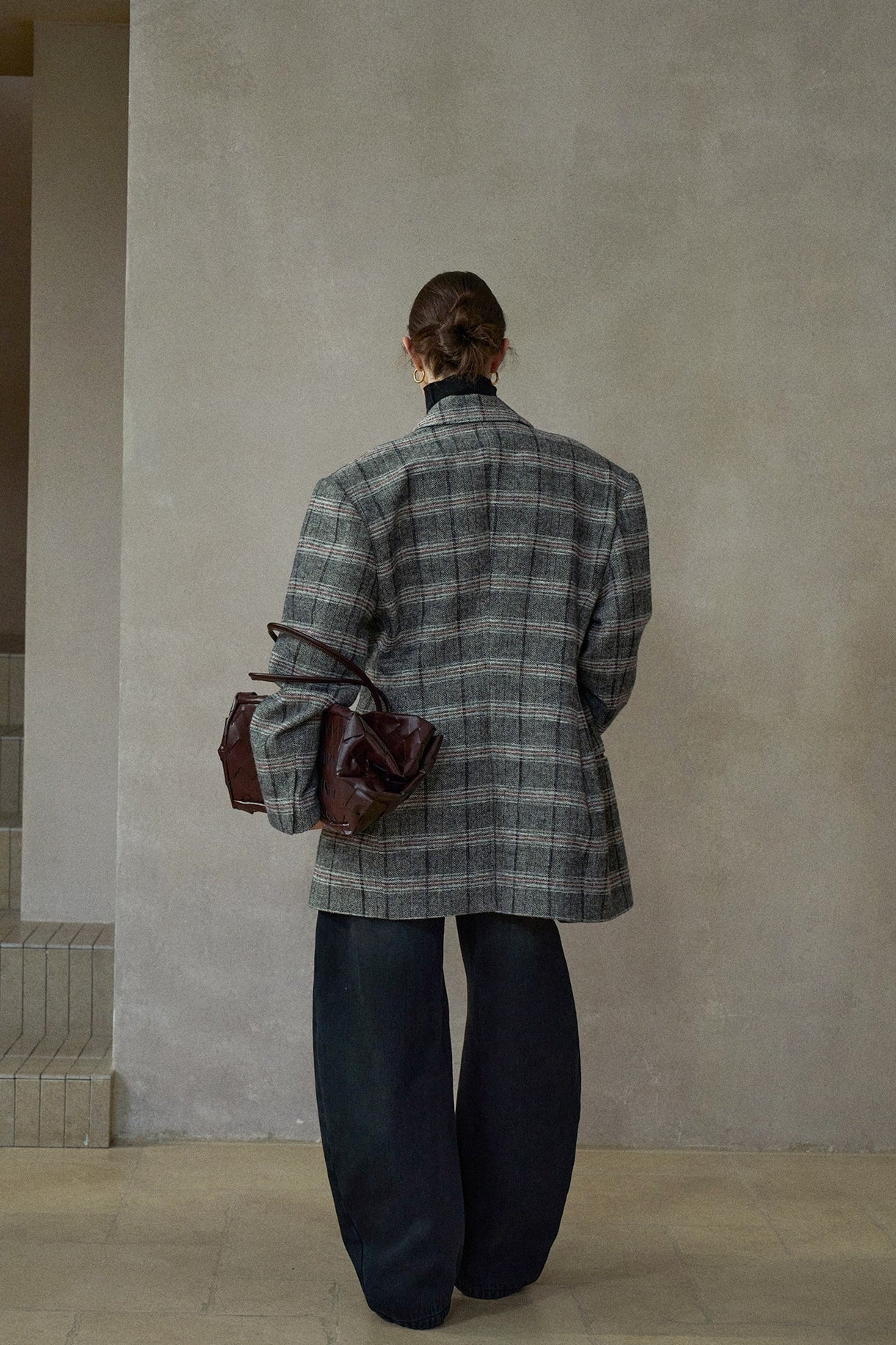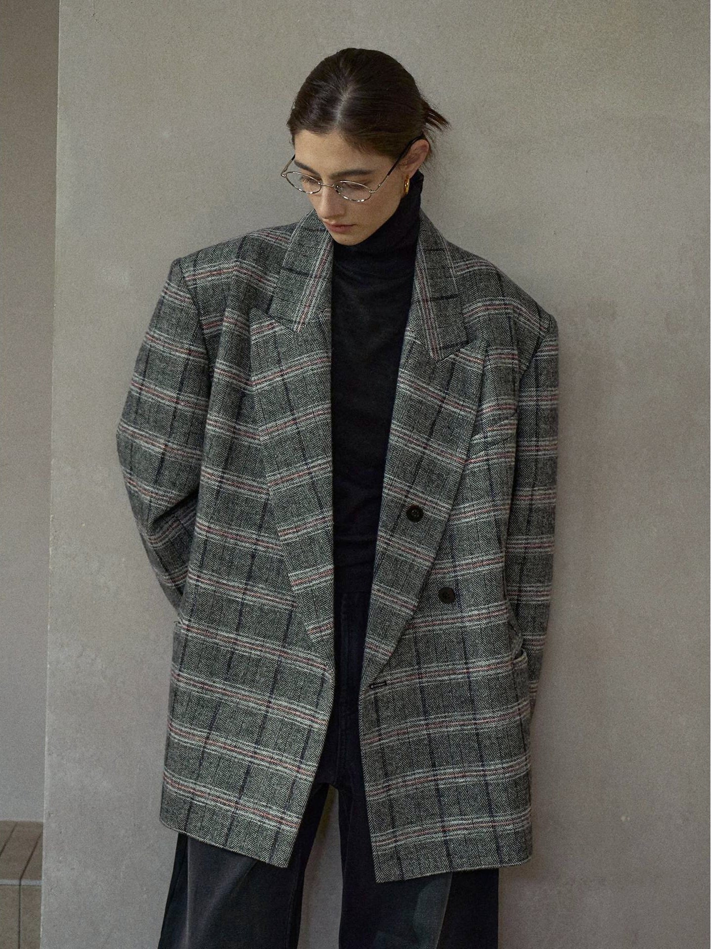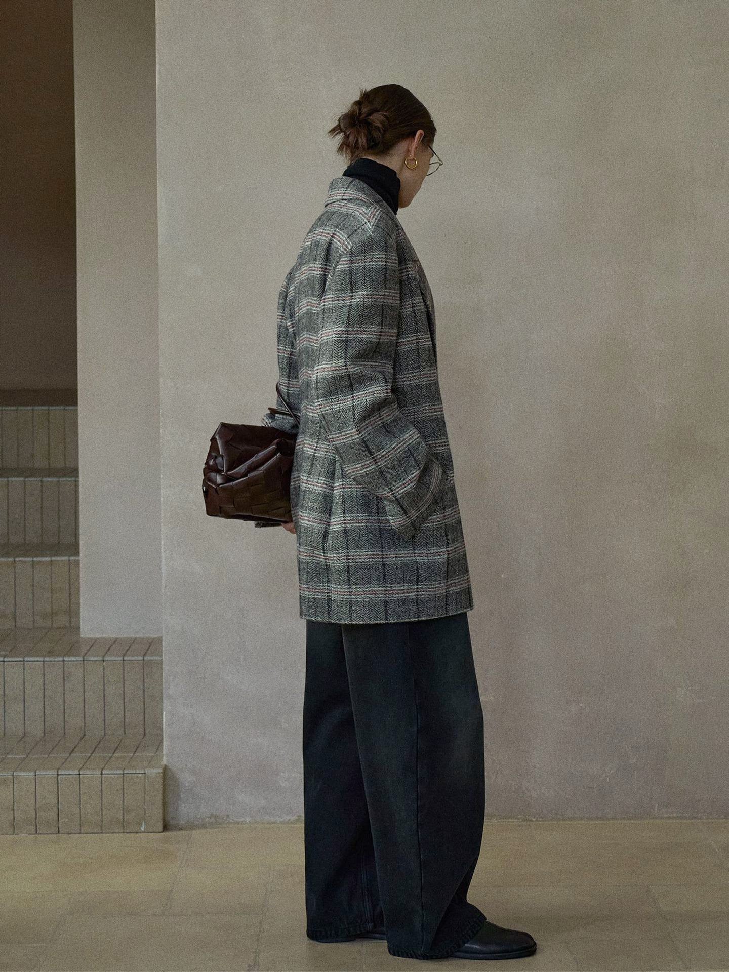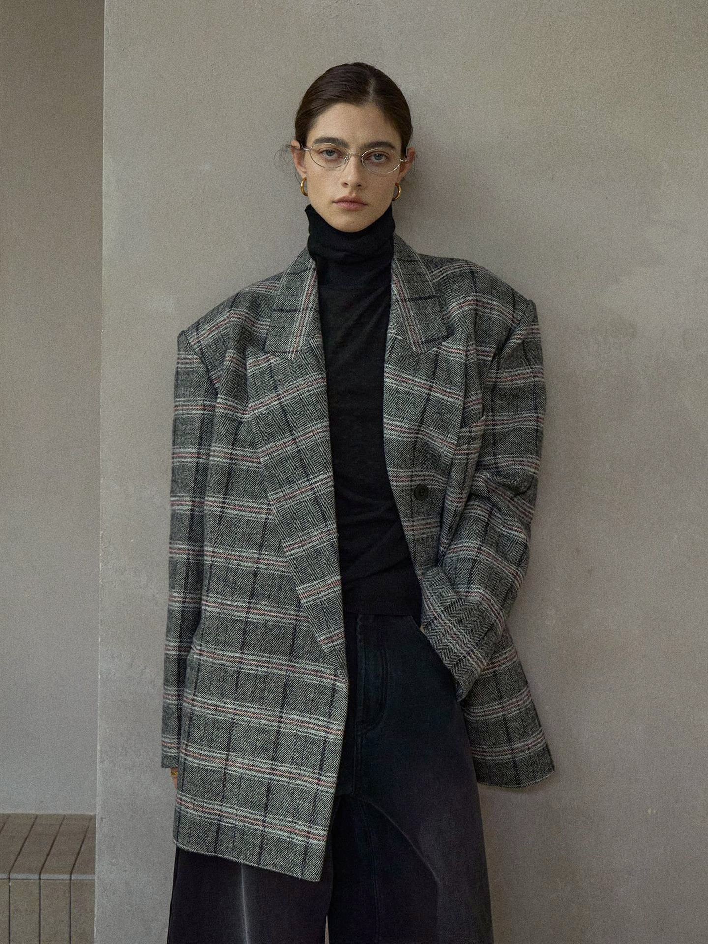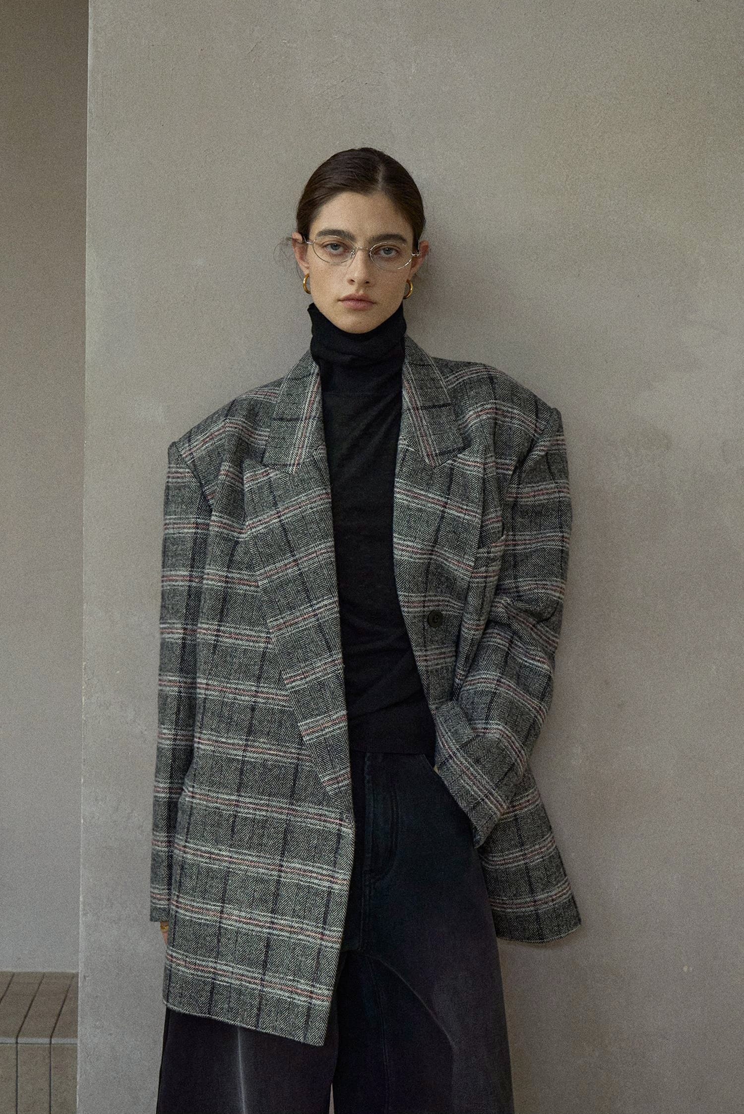 クラシカルなムードのオーバーサイズチェックテーラードジャケット。