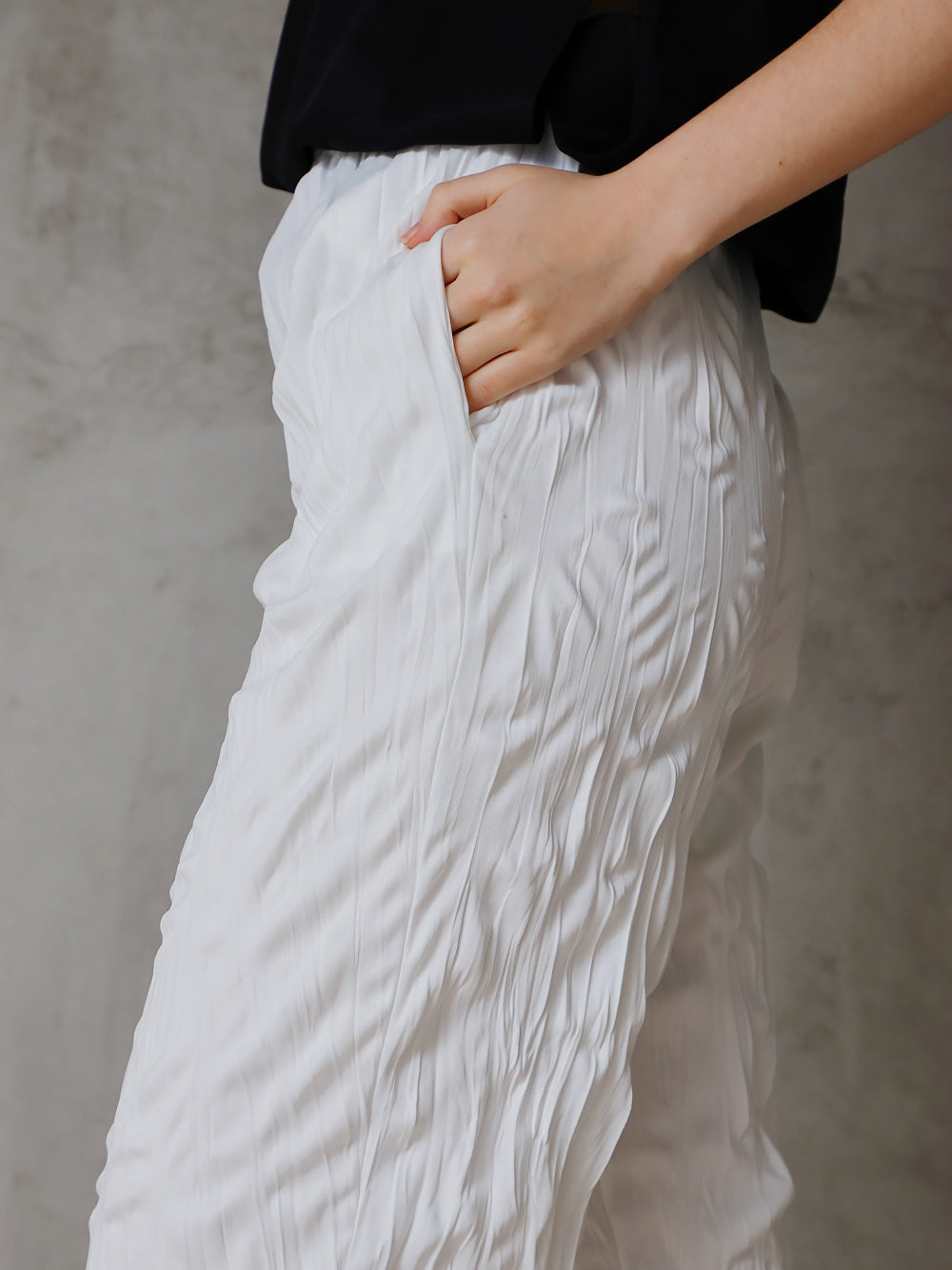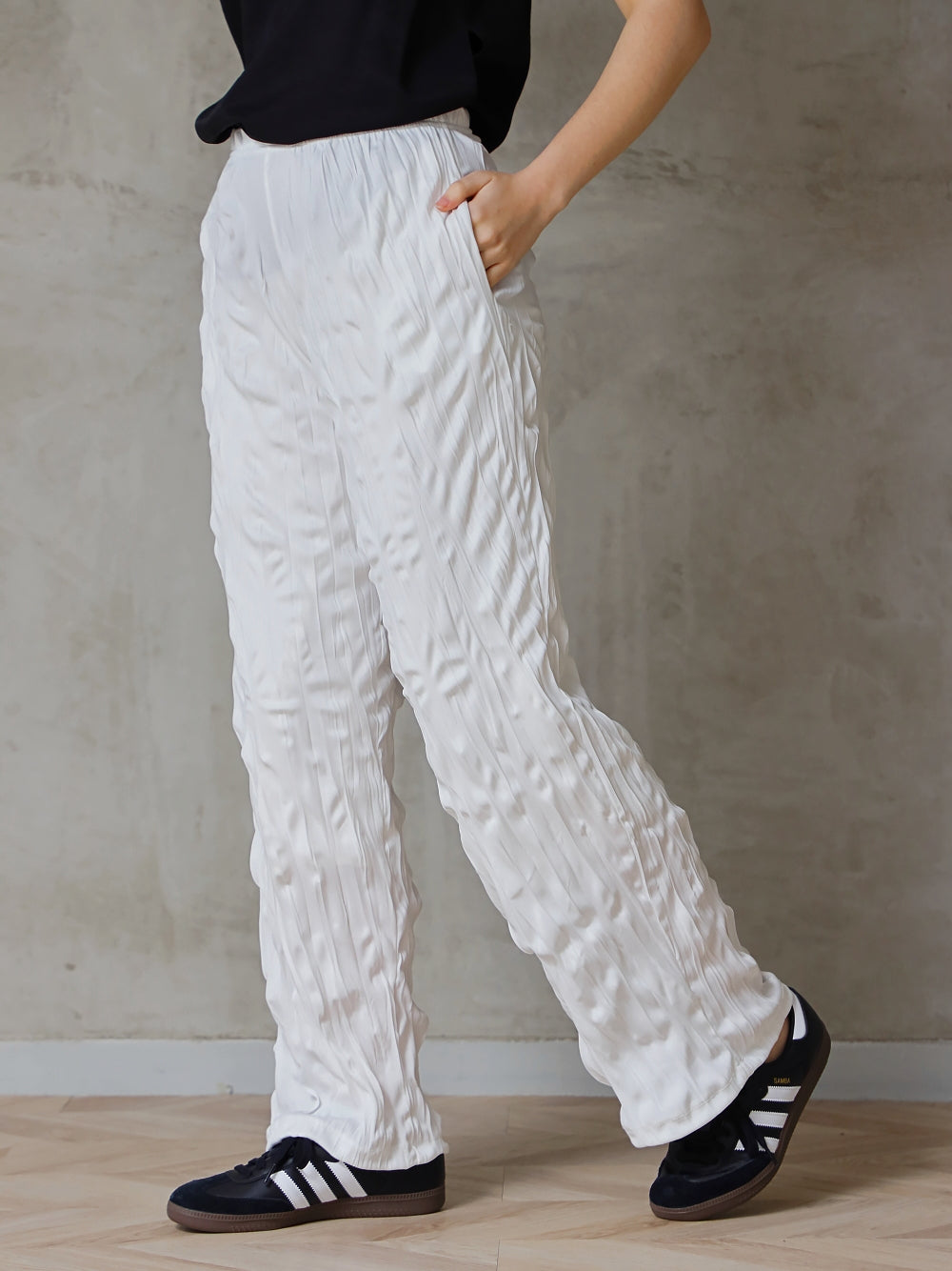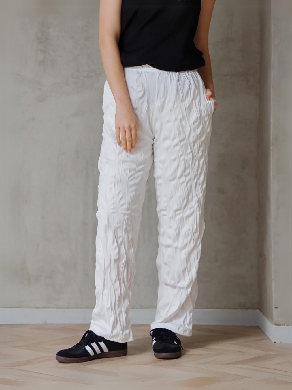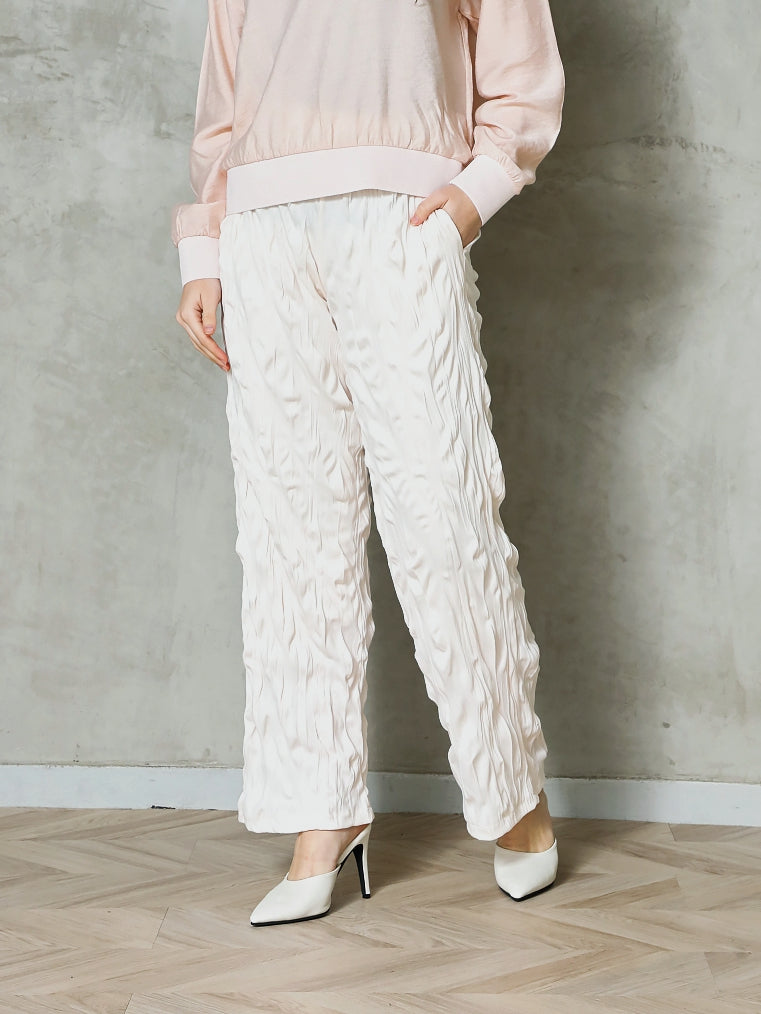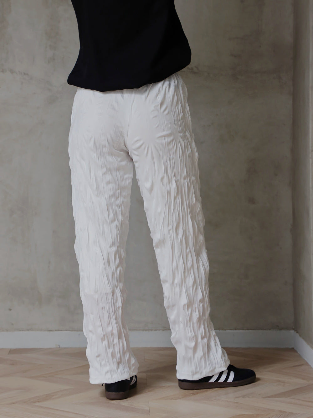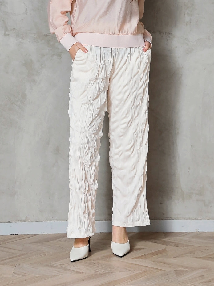 クリームの様な柔らかな生地感のランダムシワ加工イージーパンツ。