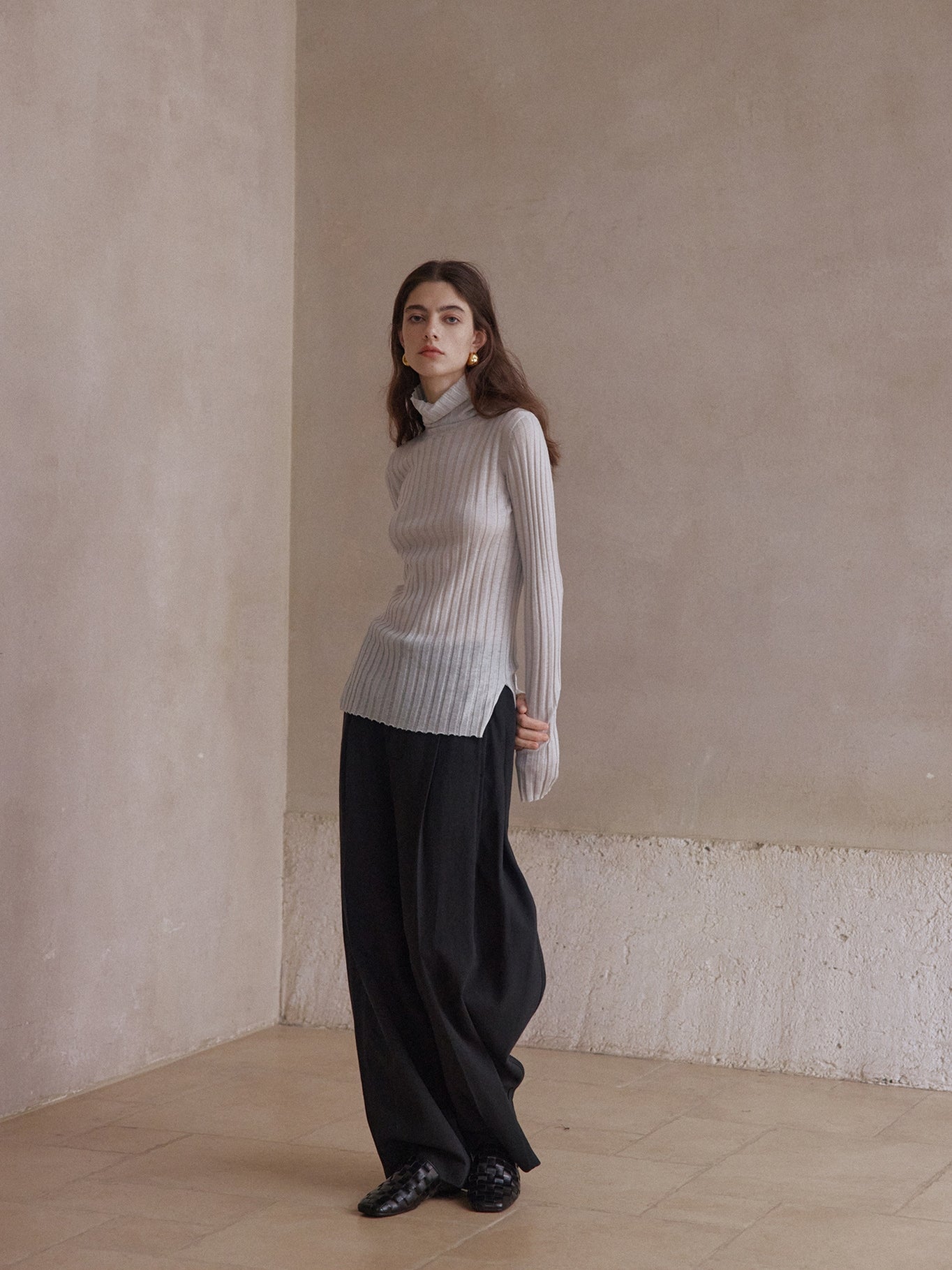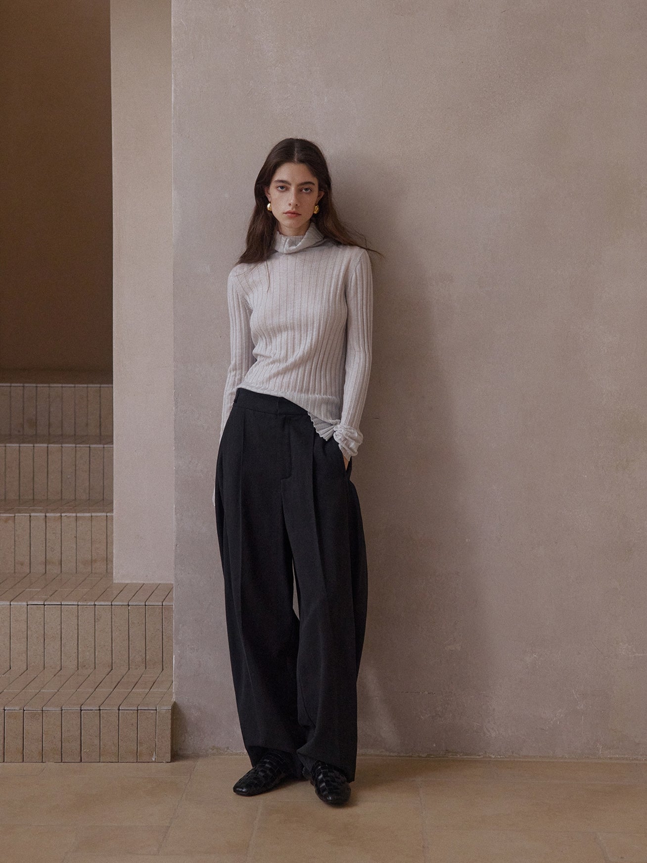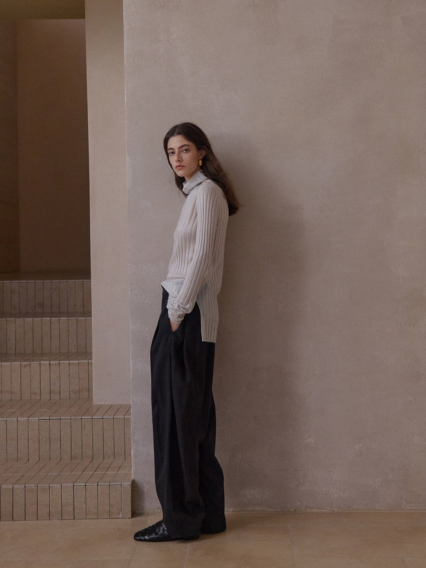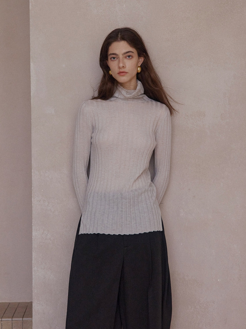 上質なウール糸を細番手で編み立てたリブニット素材。