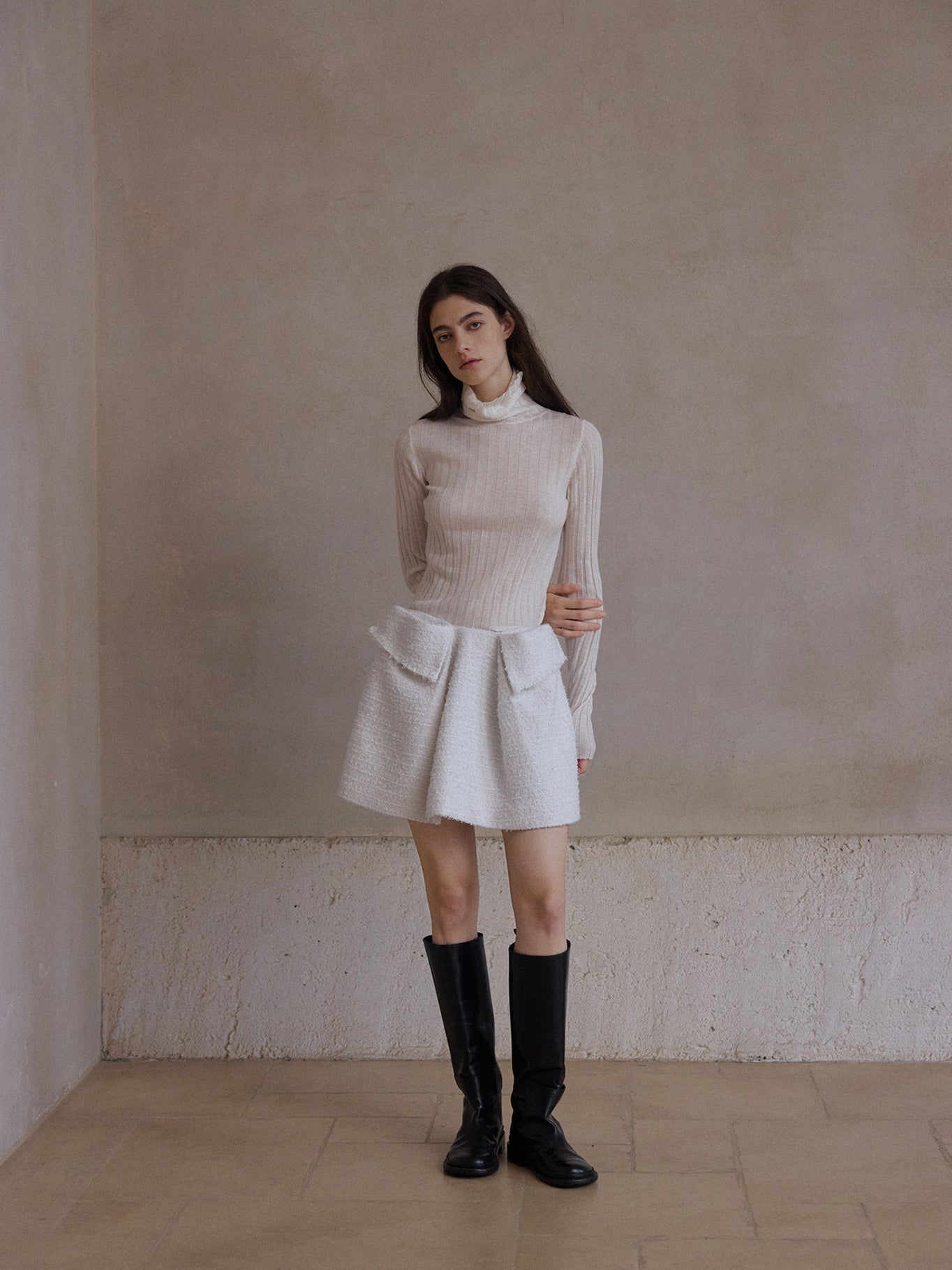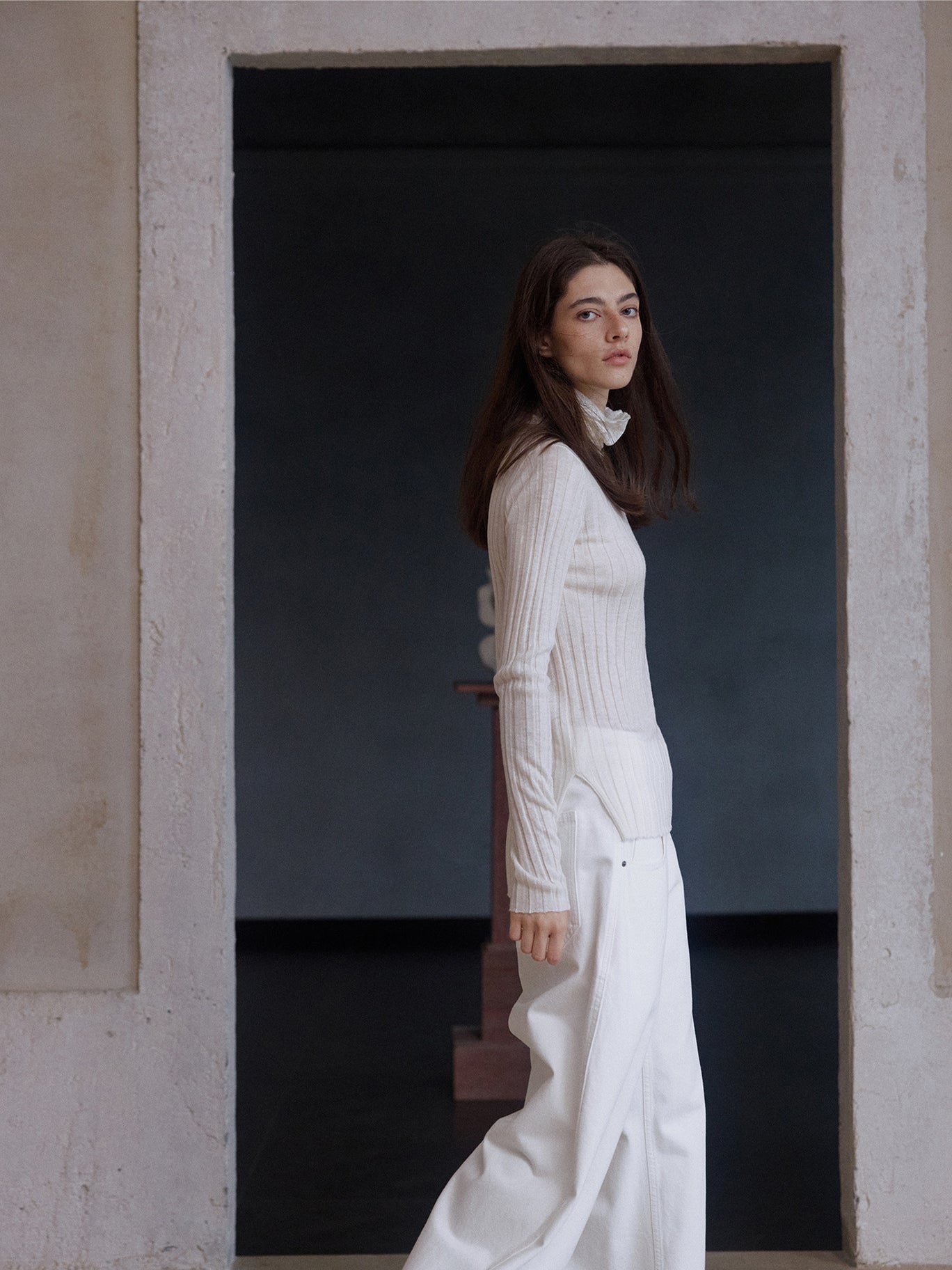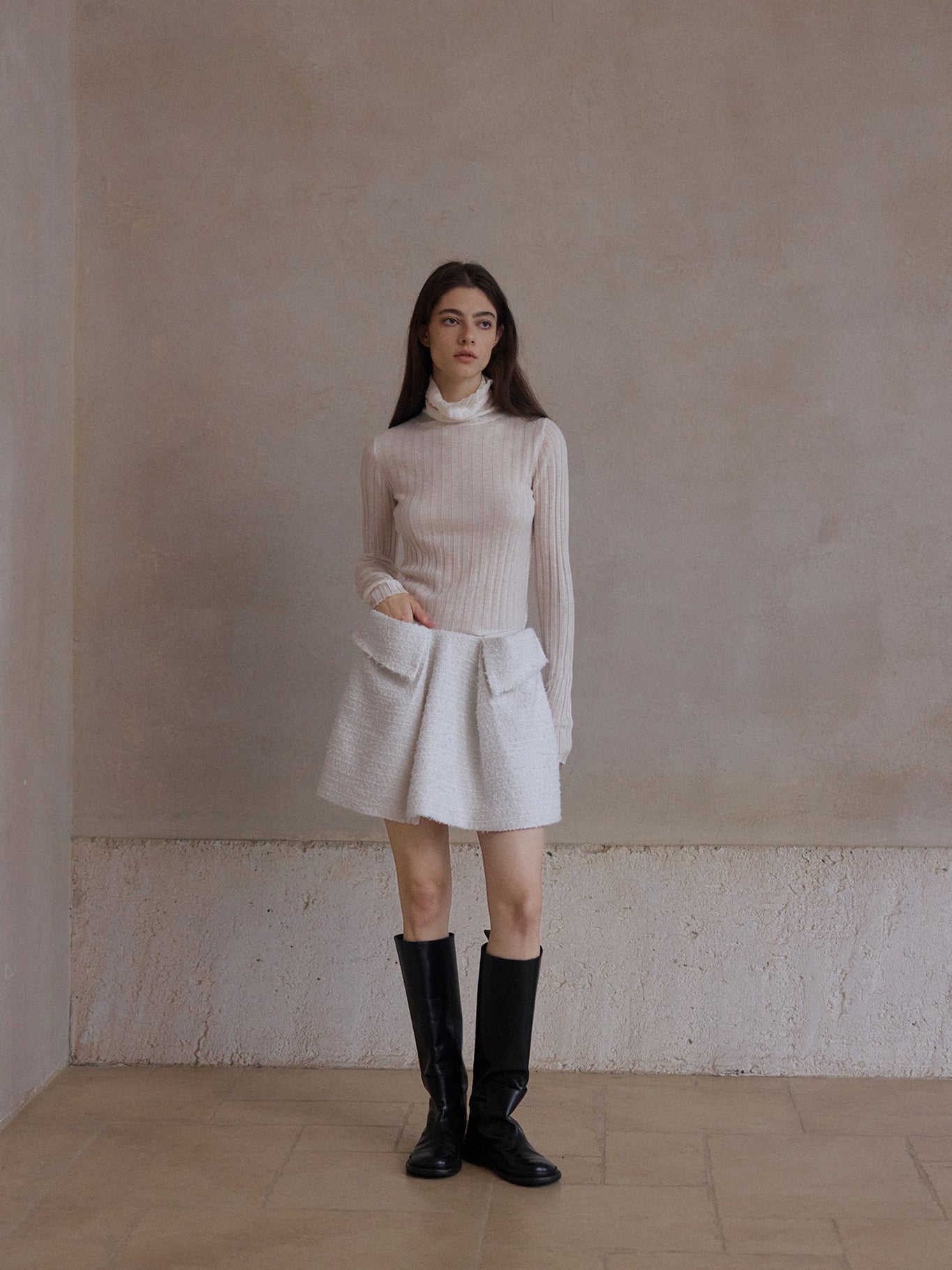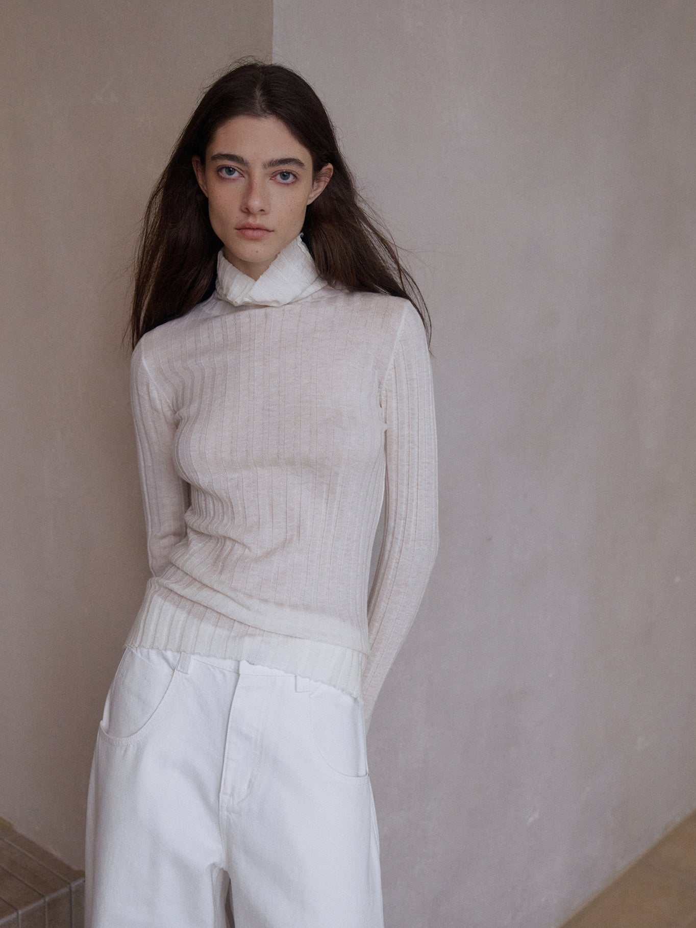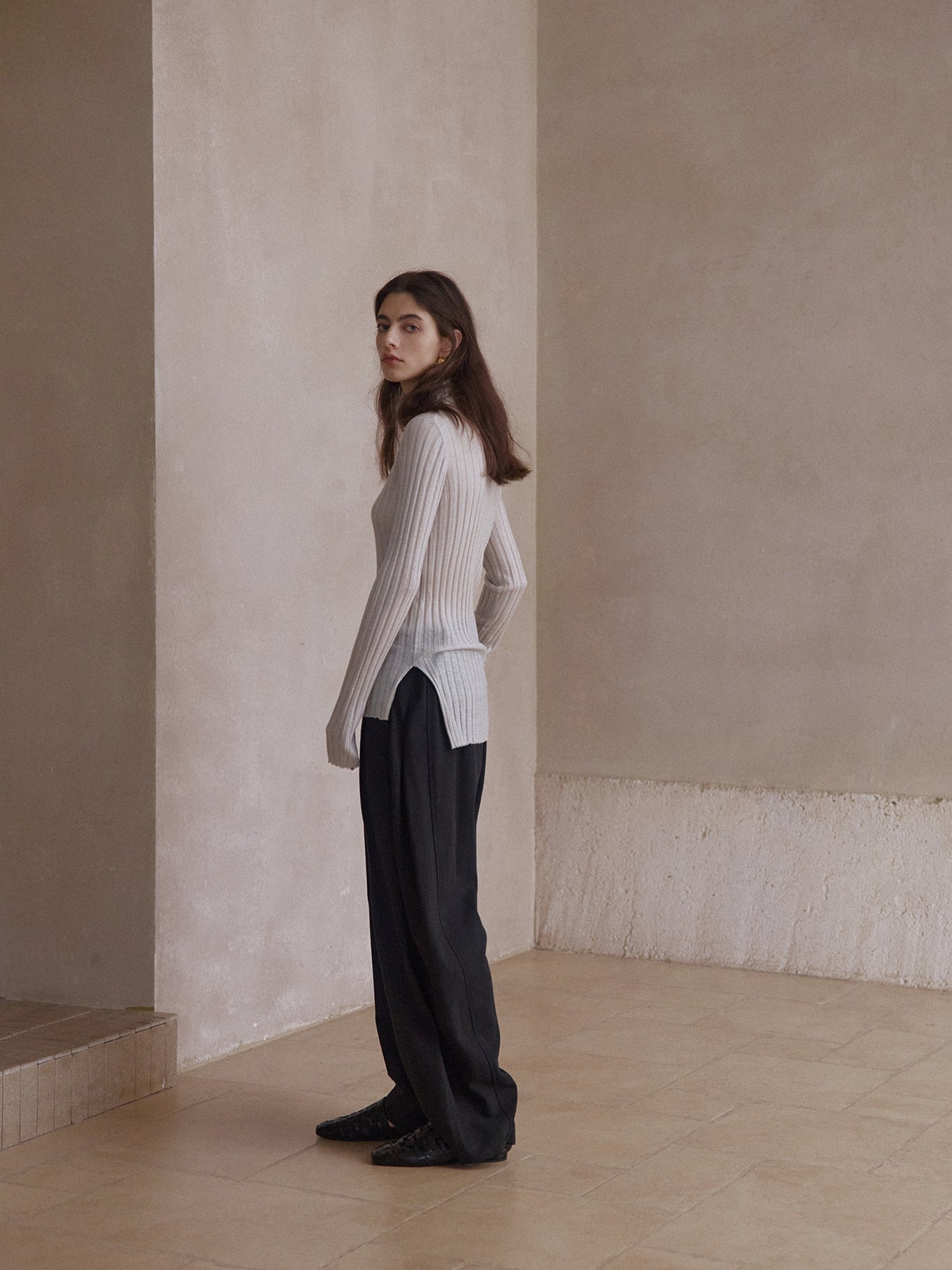 上質なウール糸を細番手で編み立てたリブニット素材。