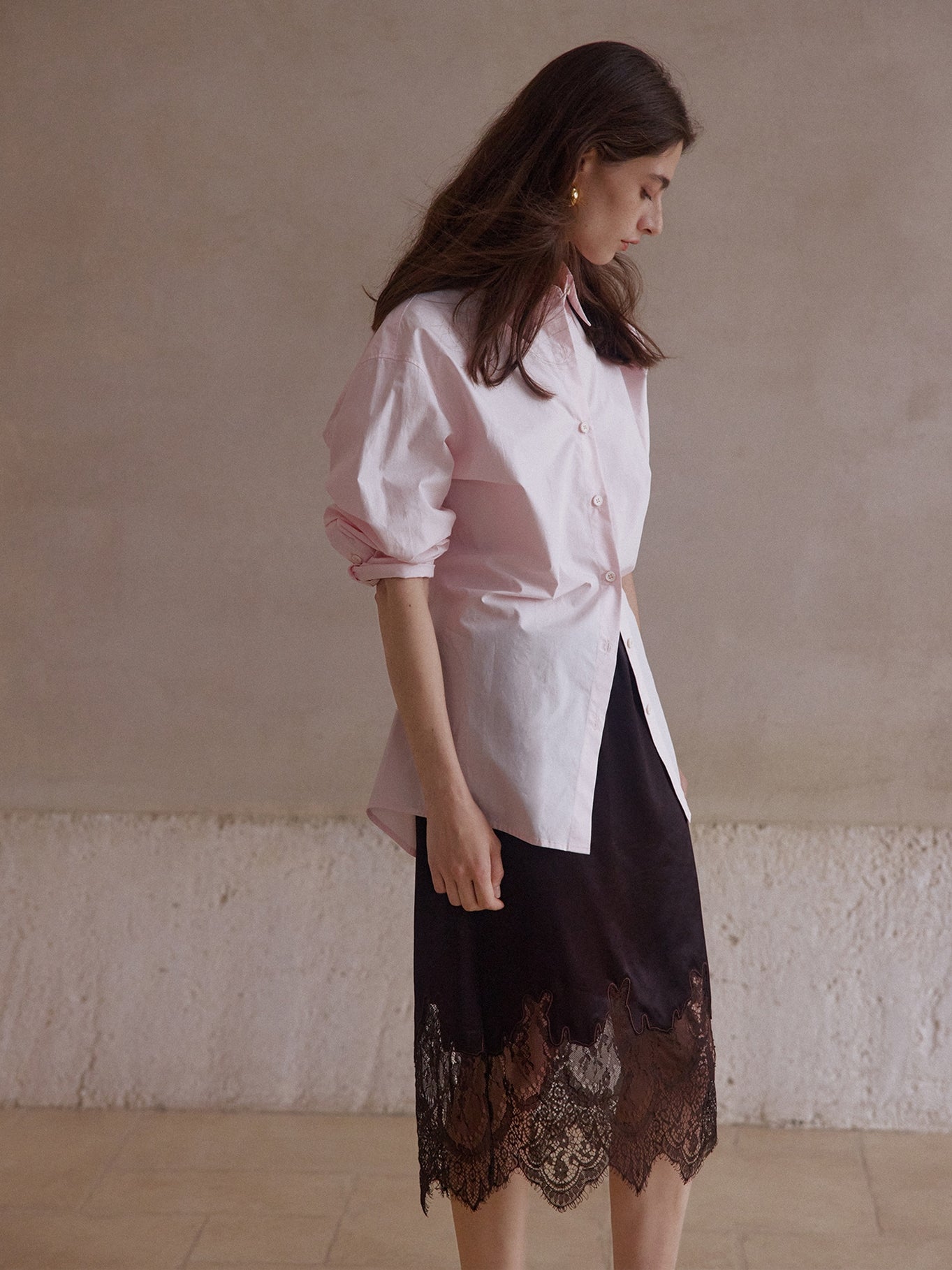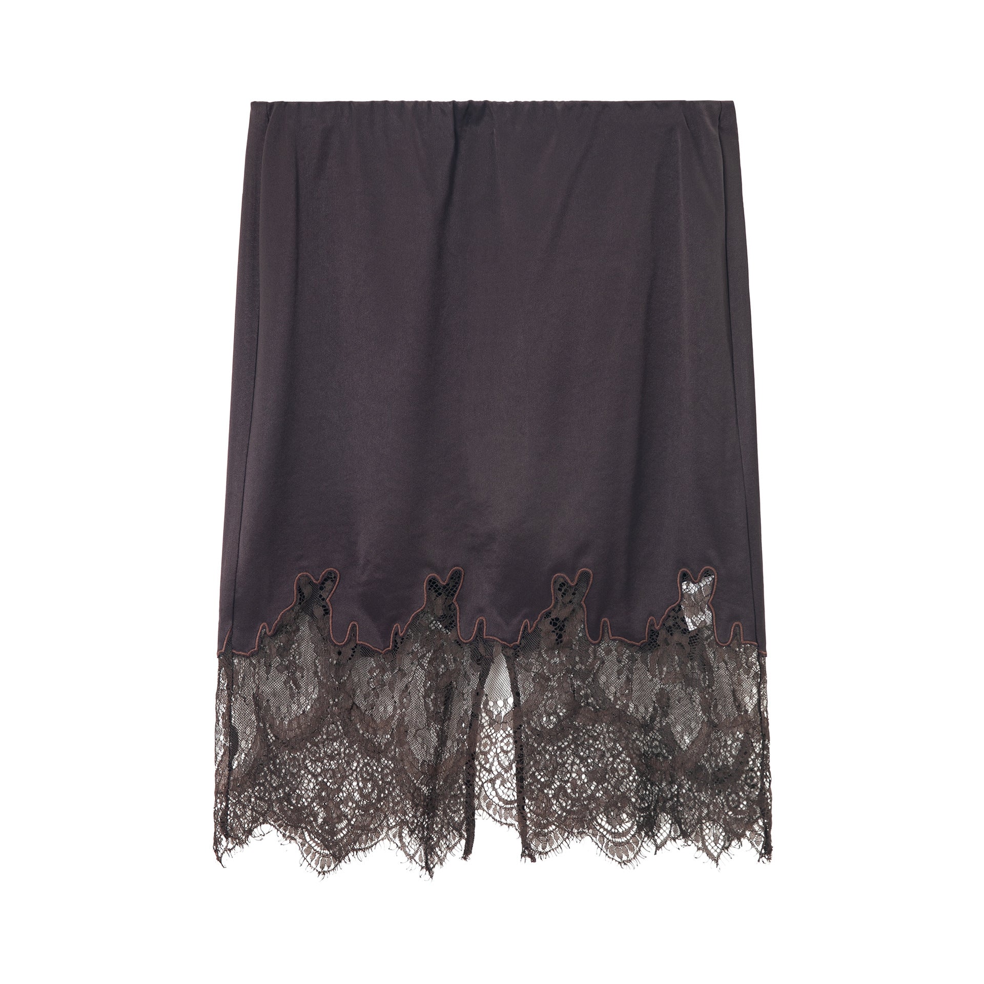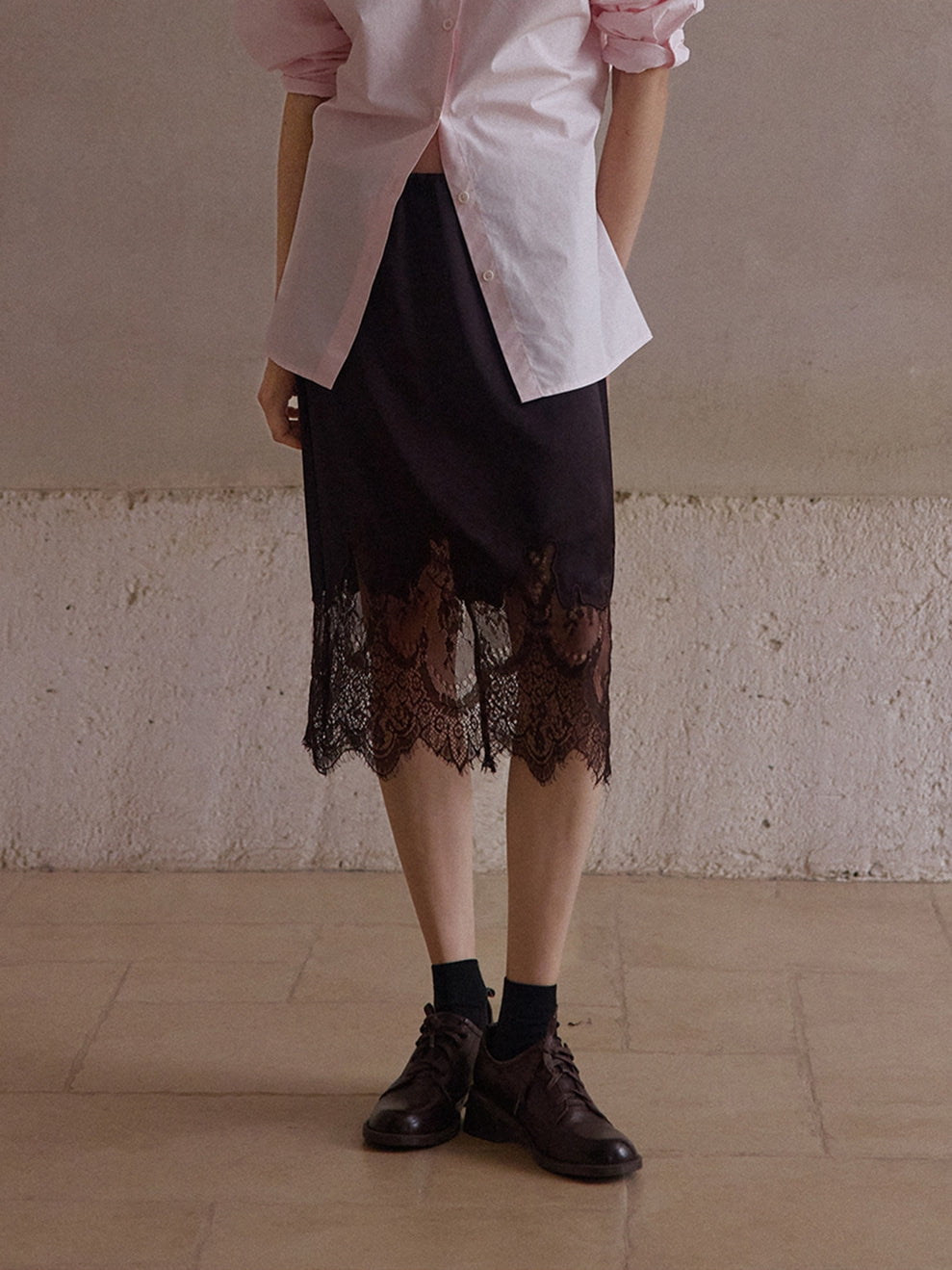 サテンの艶とレースの繊細さを掛け合わせたミディアム丈スカート。