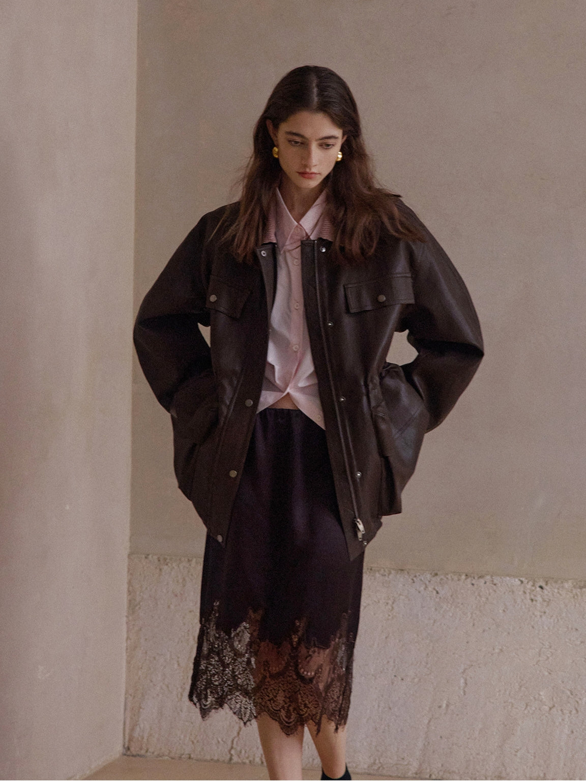 光の角度で表情を変える上品な艶が特徴で、シーズンレスに着用可能な素材感。