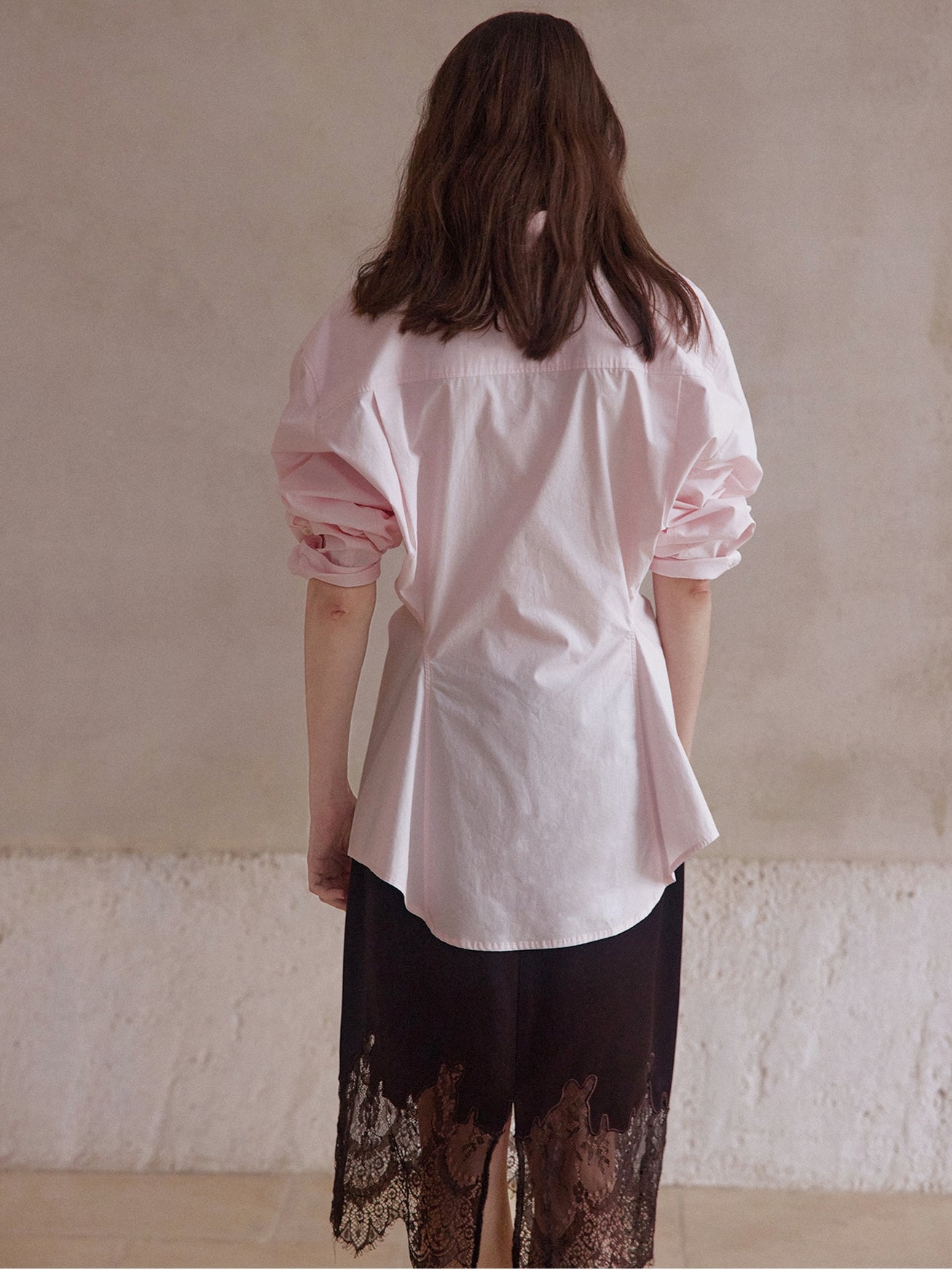 落ち感のあるしなやかなドレープと、レースの繊細な透け感が調和。